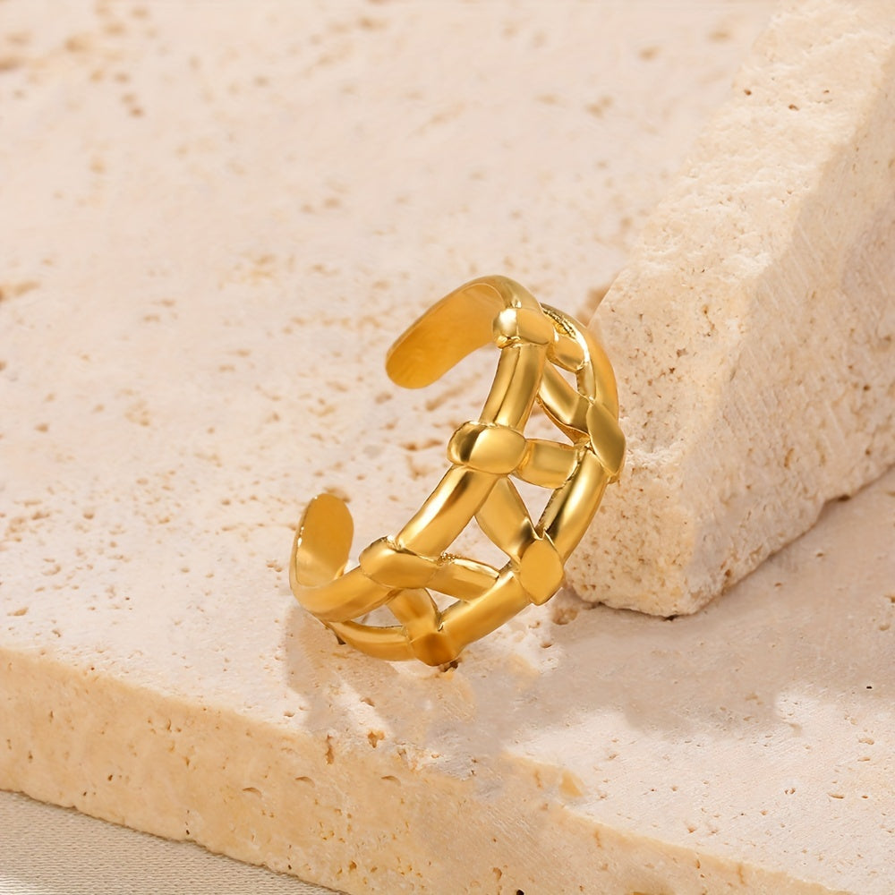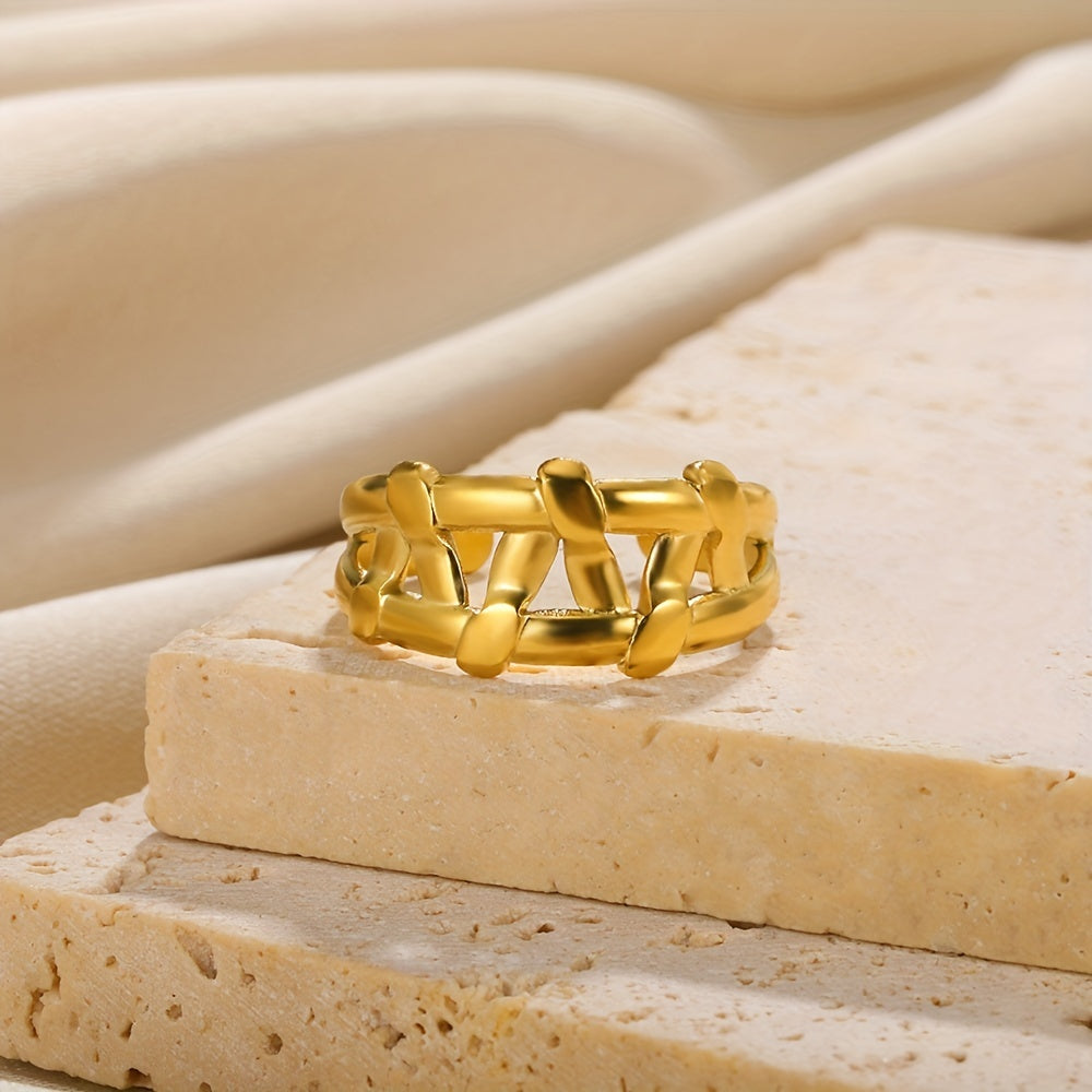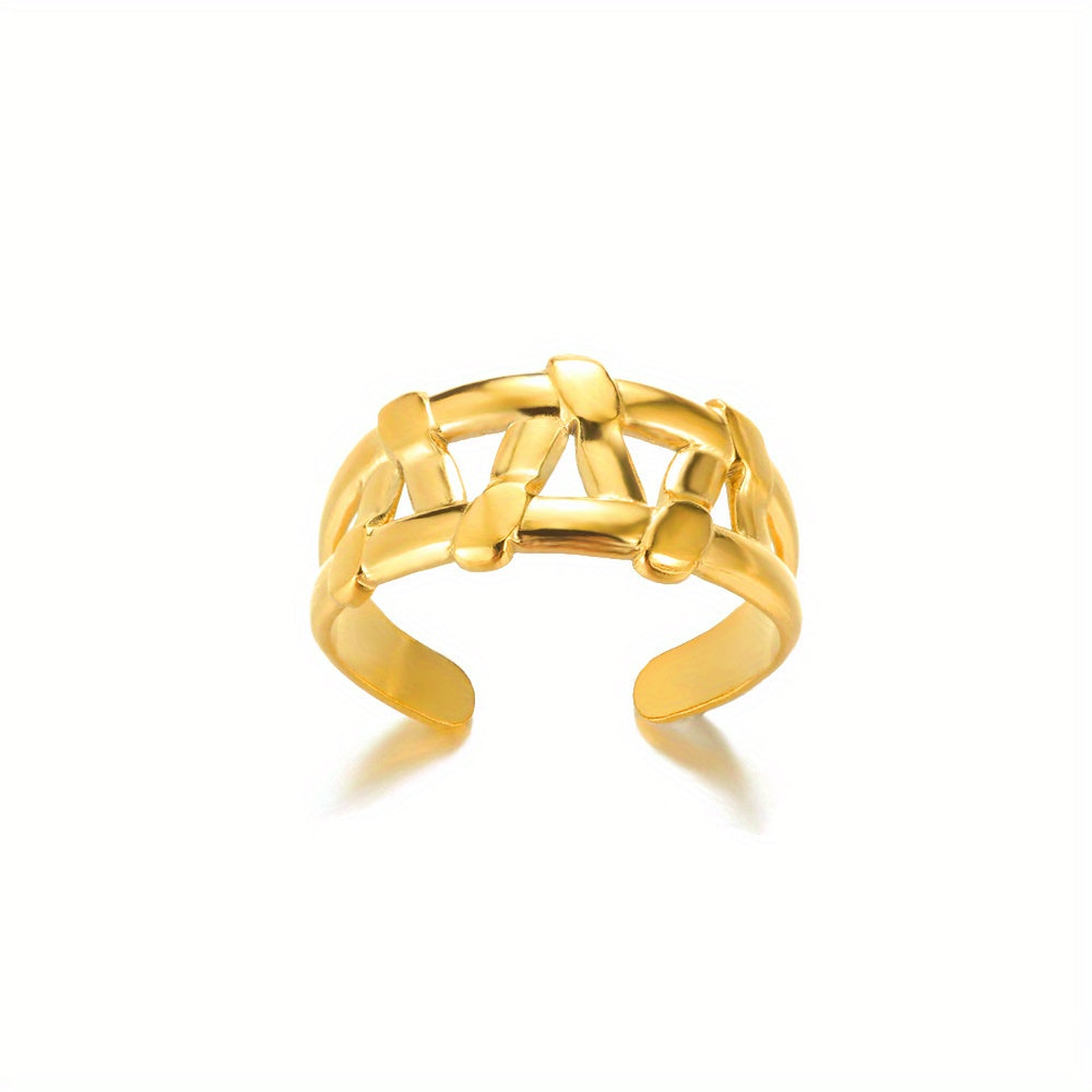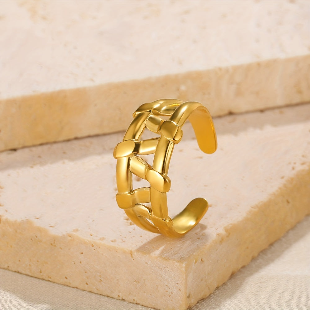 Add a touch of style to your look with this sleek stainless steel ring featuring a unique geometric opening design.