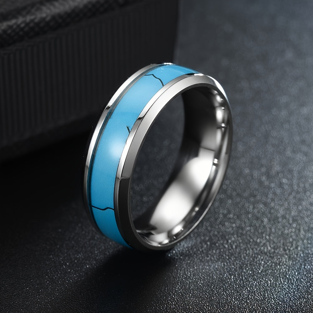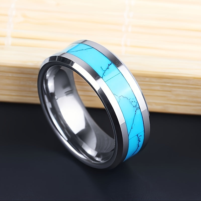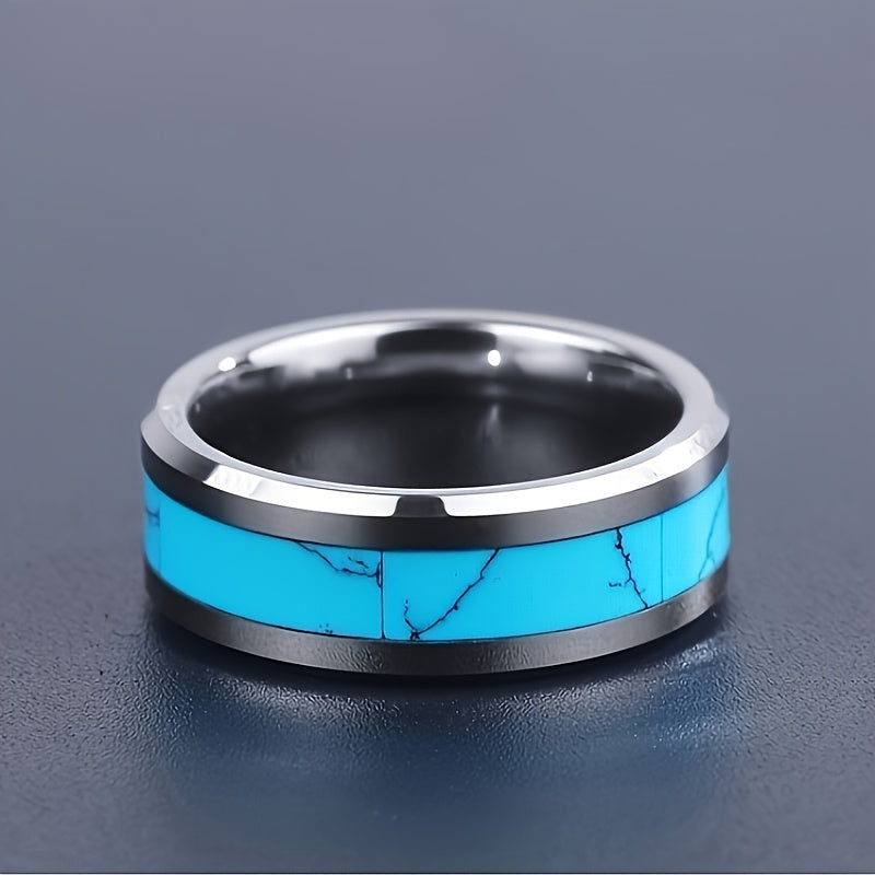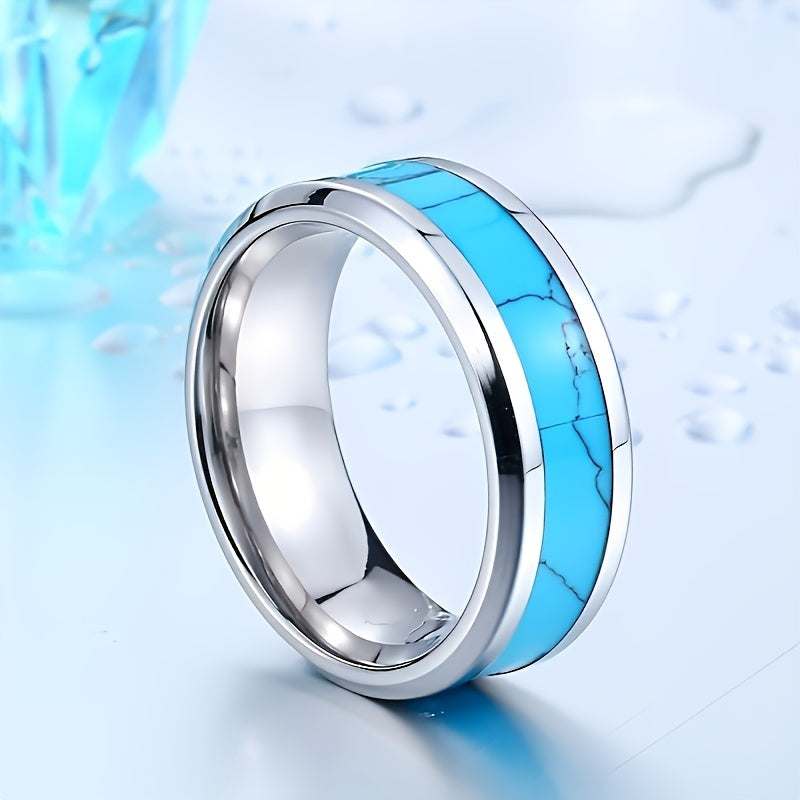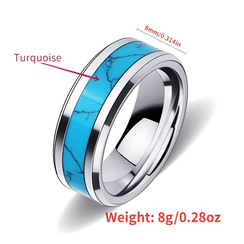 Elegant 8MM stainless steel ring with turquoise inlay. Available in sizes 7 to 13.