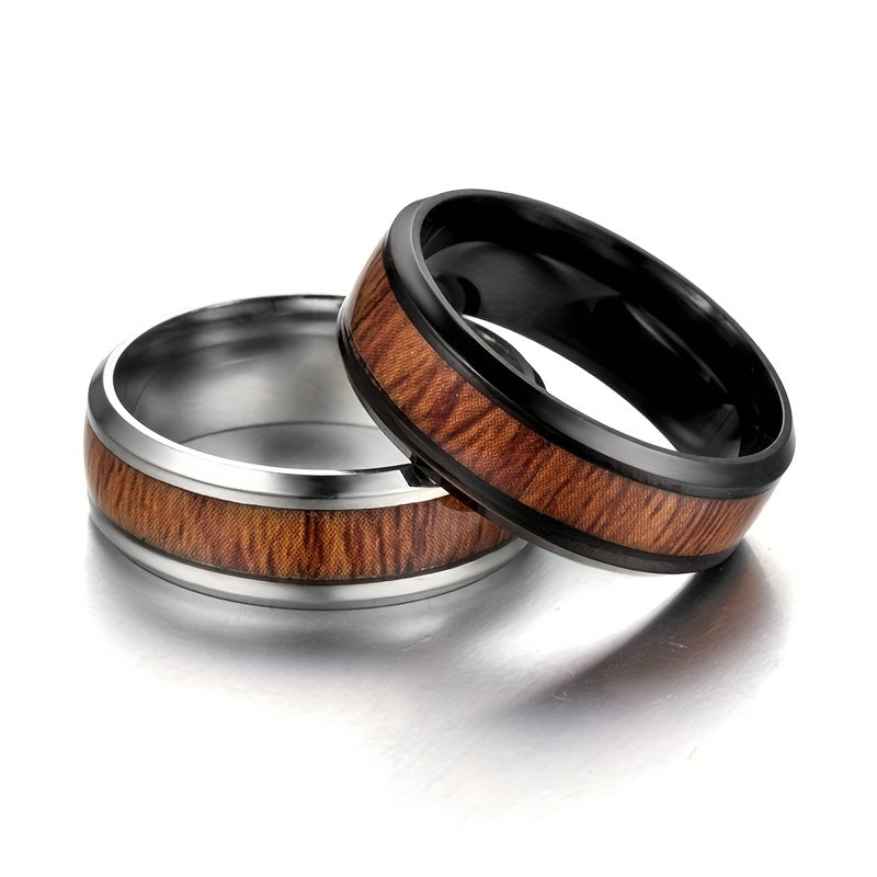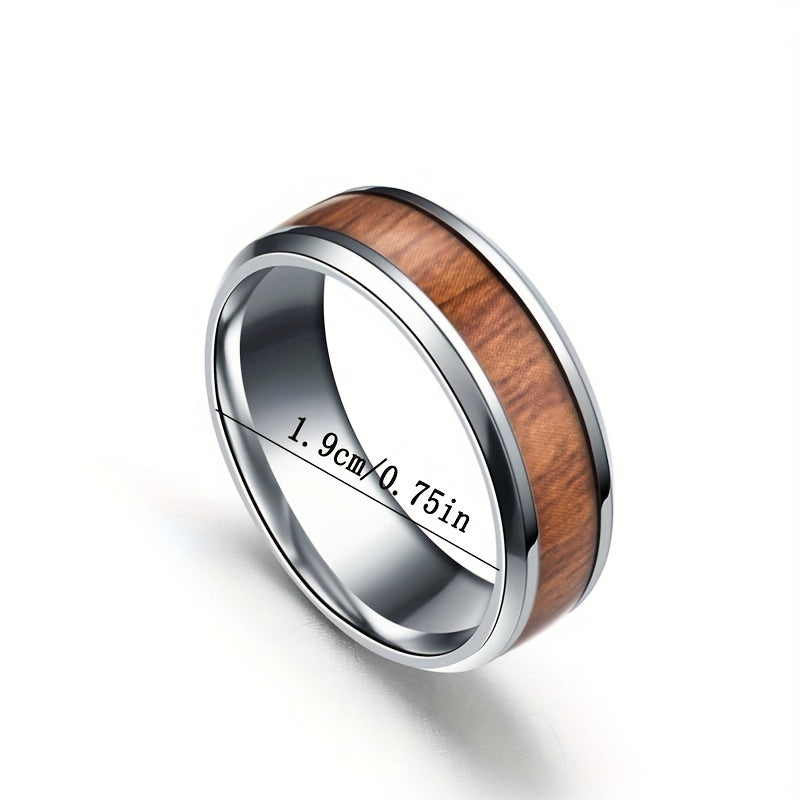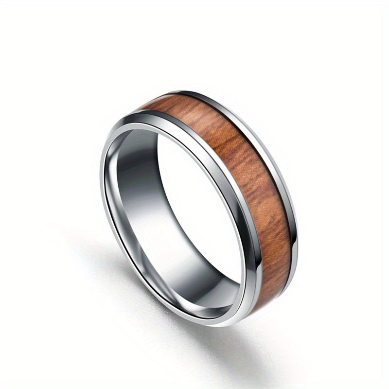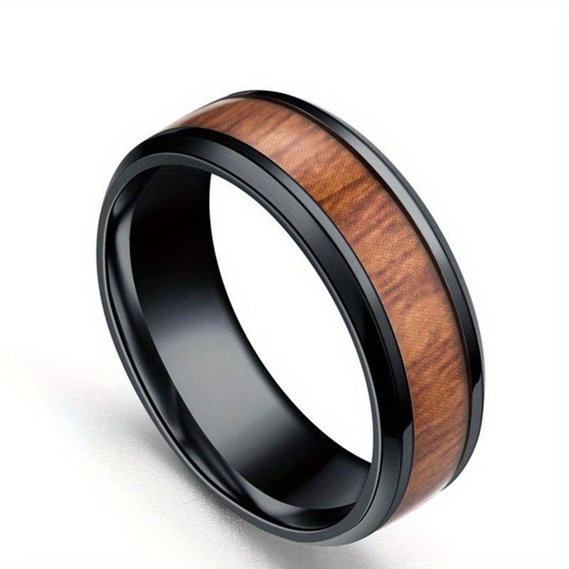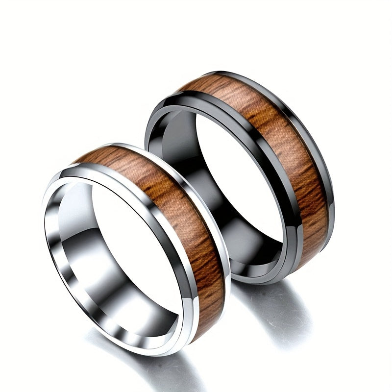This ring features a vintage wood grain inlay design with a metal feel. Made of durable stainless steel.