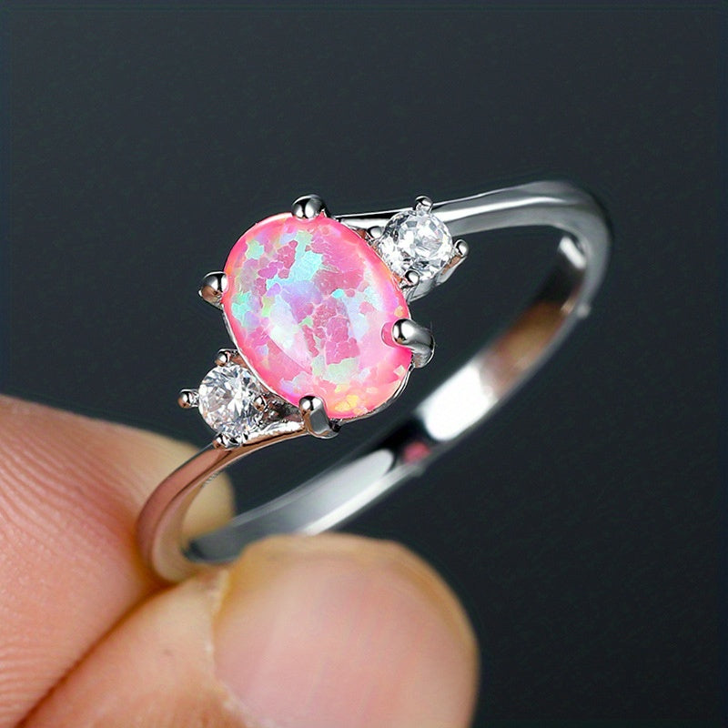 Opal Engagement Ring Silver Crystal Oval Wedding Ring
