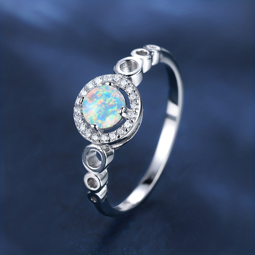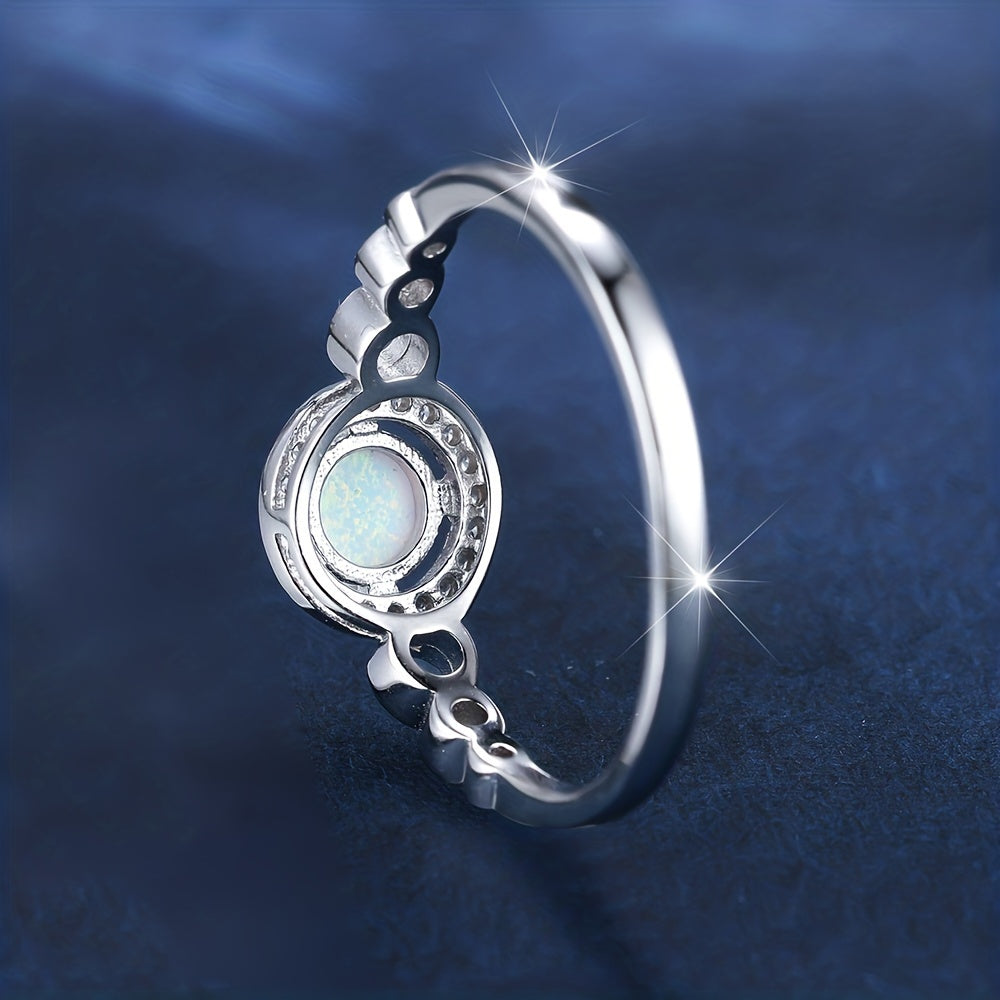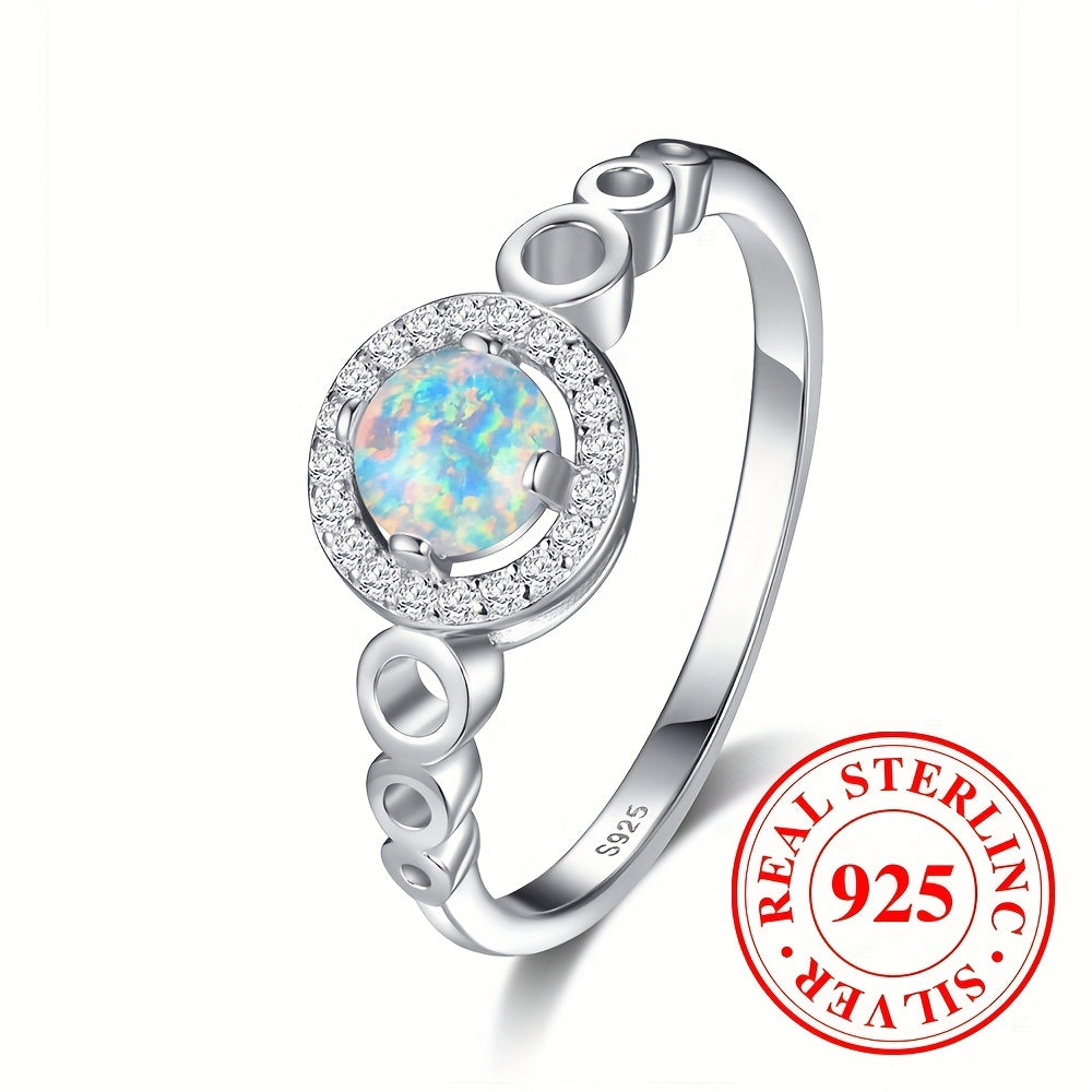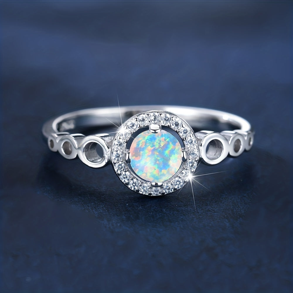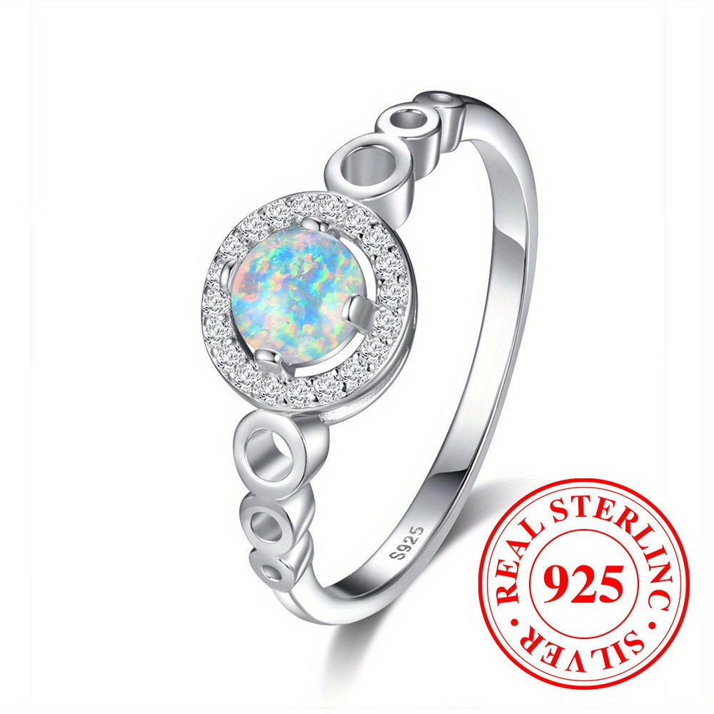 This stunning round opal ring features micro pave setting on a 925 sterling silver band. Perfect for weddings and engagements.