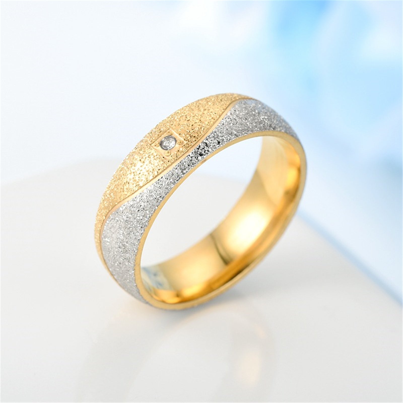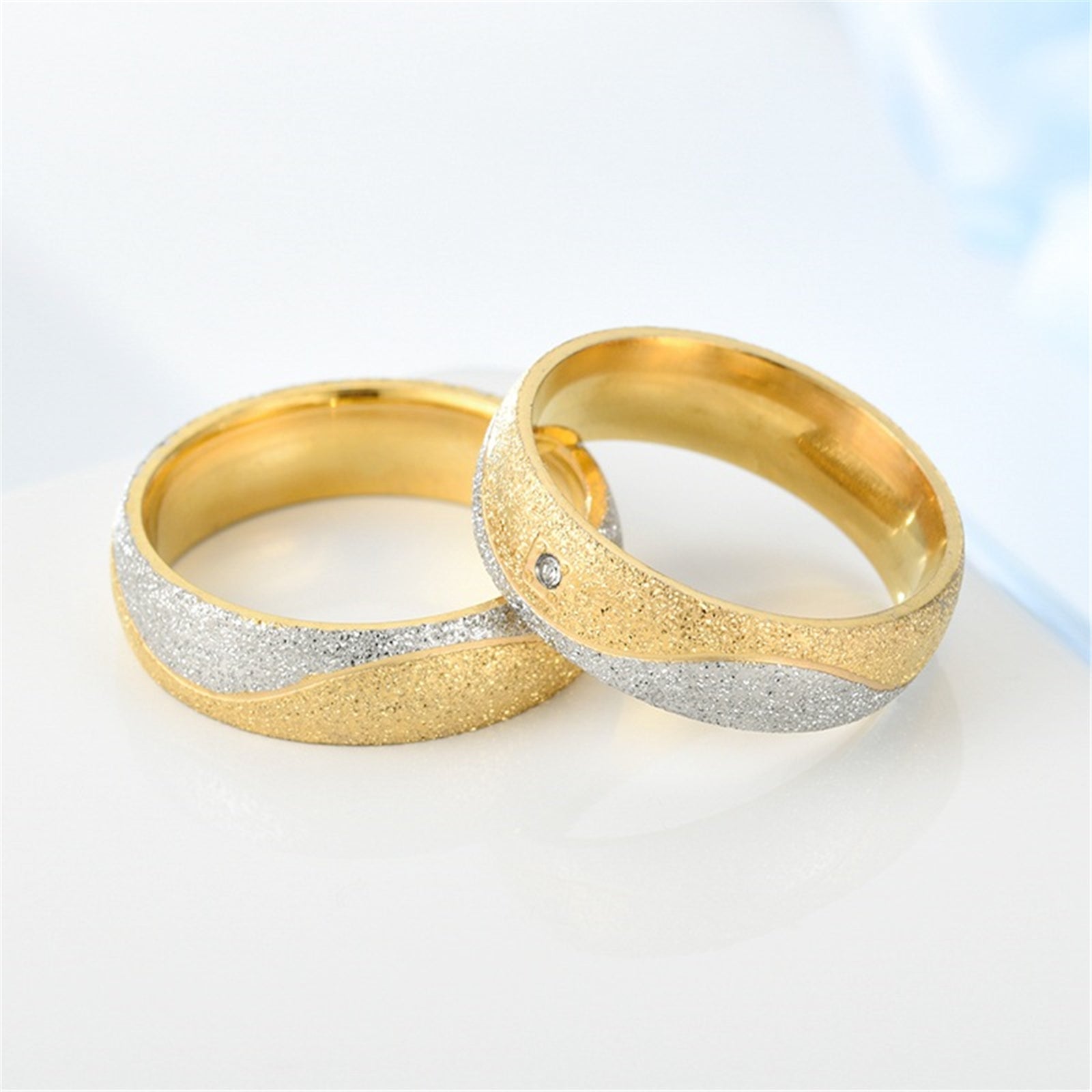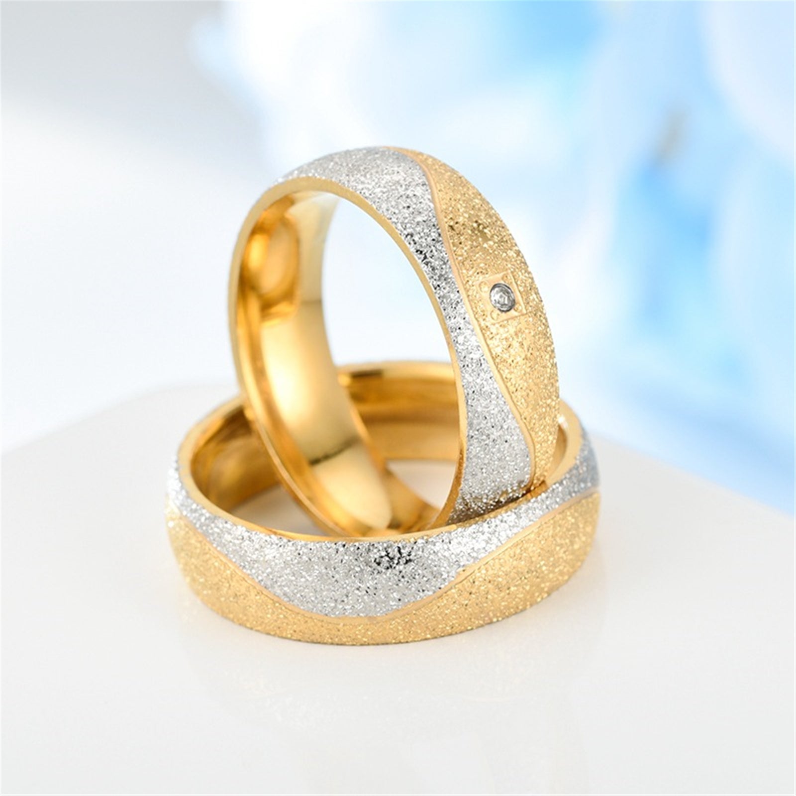 Beautiful set of couple rings made of high-quality stainless steel featuring frosted finish and zircon accents.