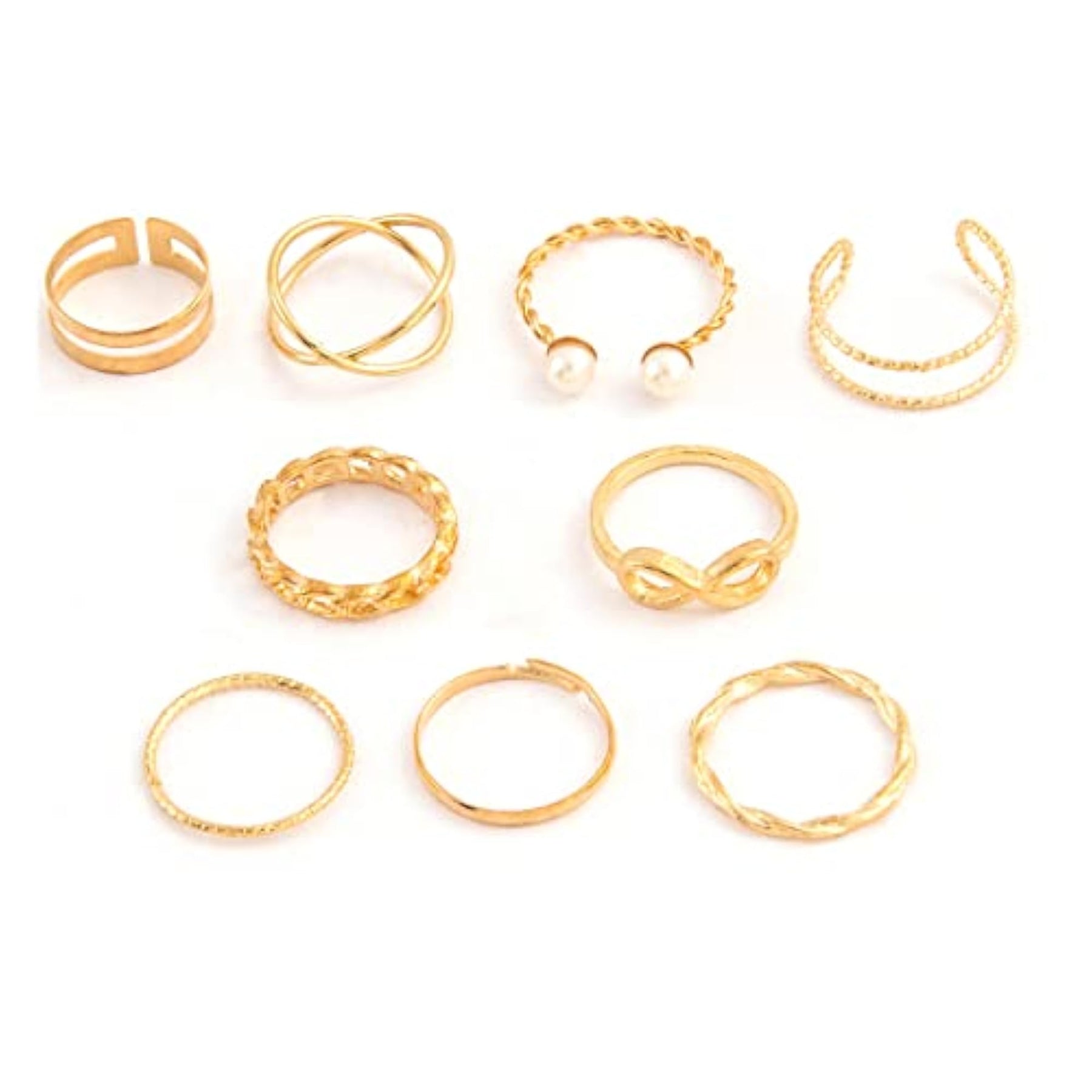 Enhance your boho look with this set of 9 stylish metal midi finger rings. These golden rings are perfect for adding a touch of glam to your outfit.