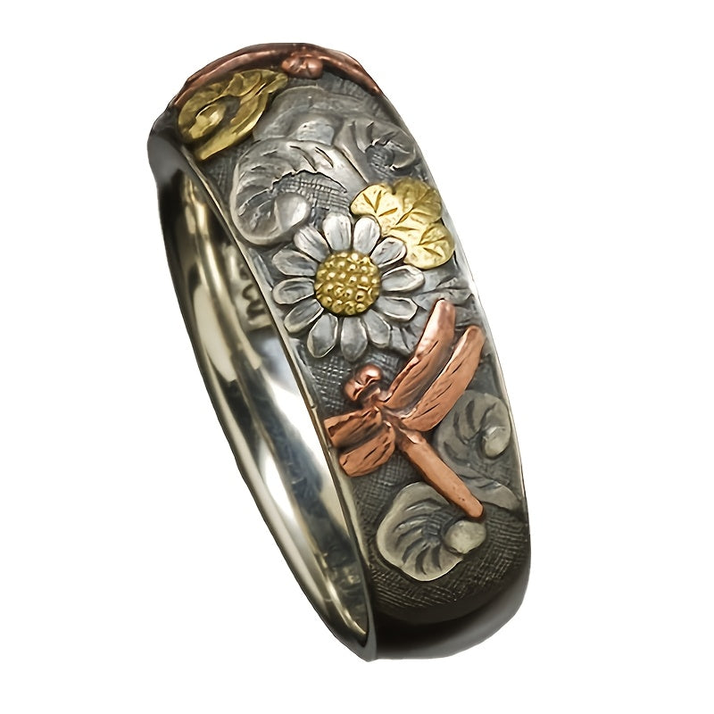 This vintage ring features a unique design with a flower, dragonfly, and sunflower, making it a perfect gift for men.
