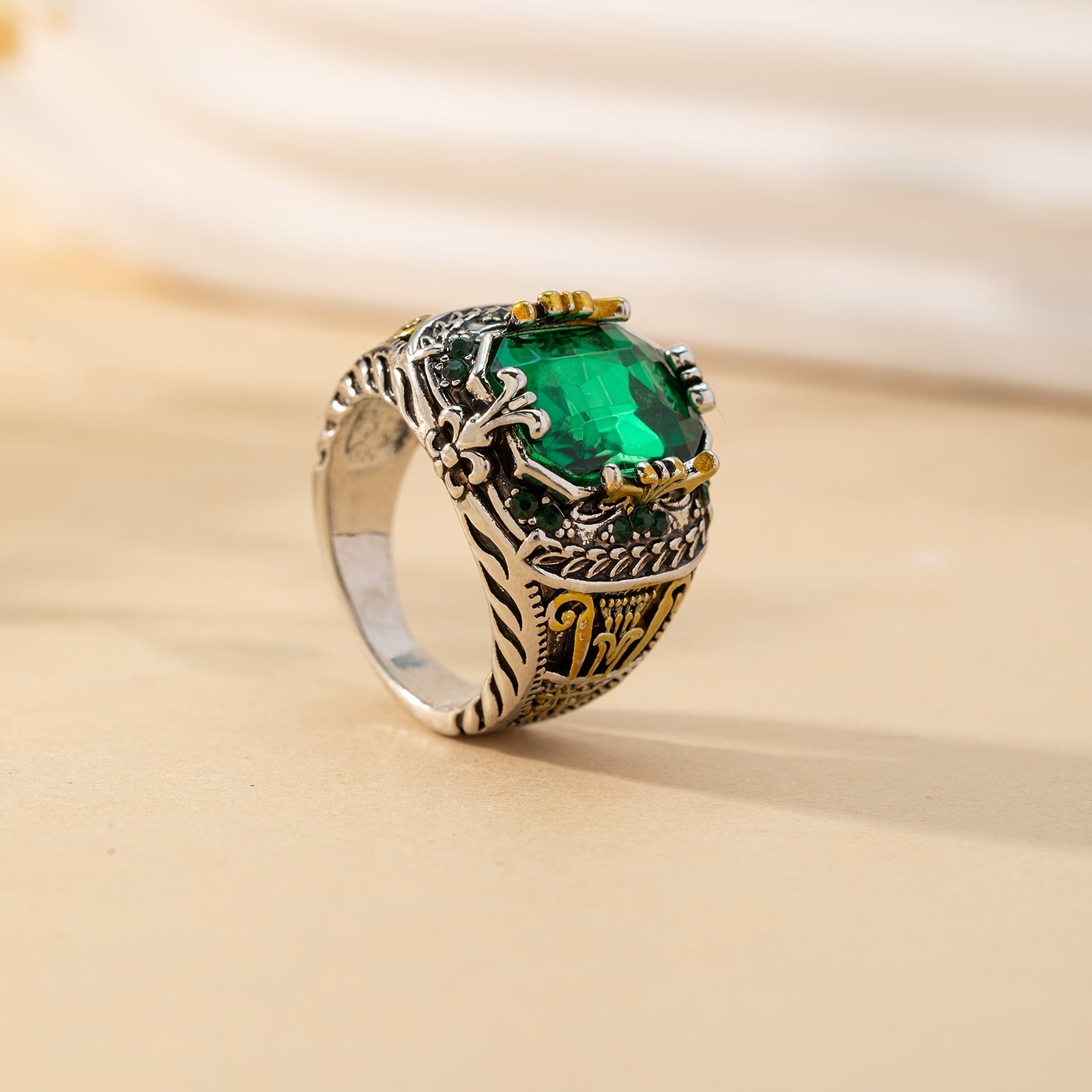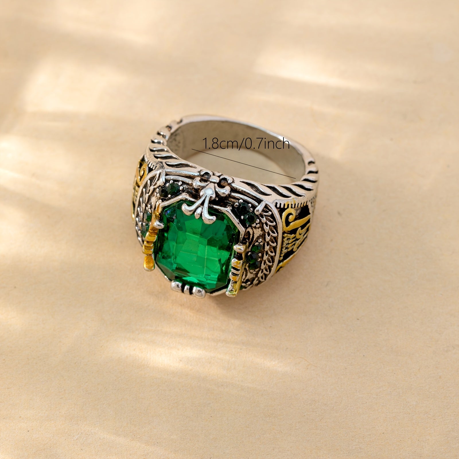 This vintage men's ring features an irregular geometric design with a green artificial rhinestone. Silver plated for a stylish look.
