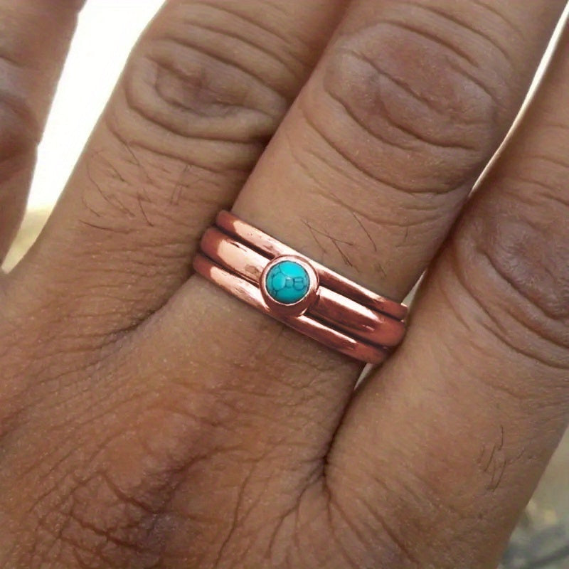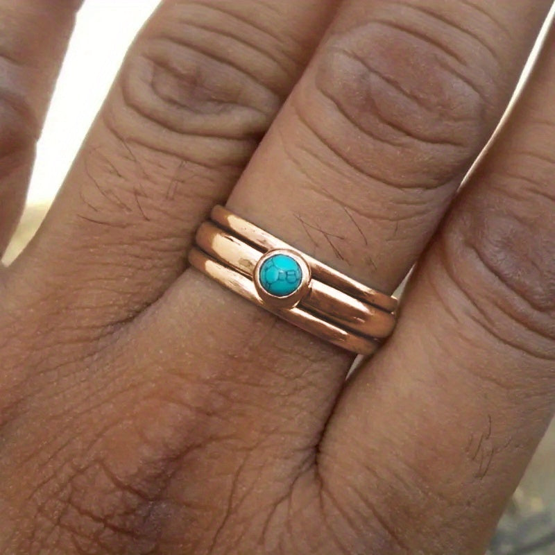 This vintage stone ring features three layers of artificial turquoise set in a silver-plated band. It makes a great anniversary gift for friends or loved ones.