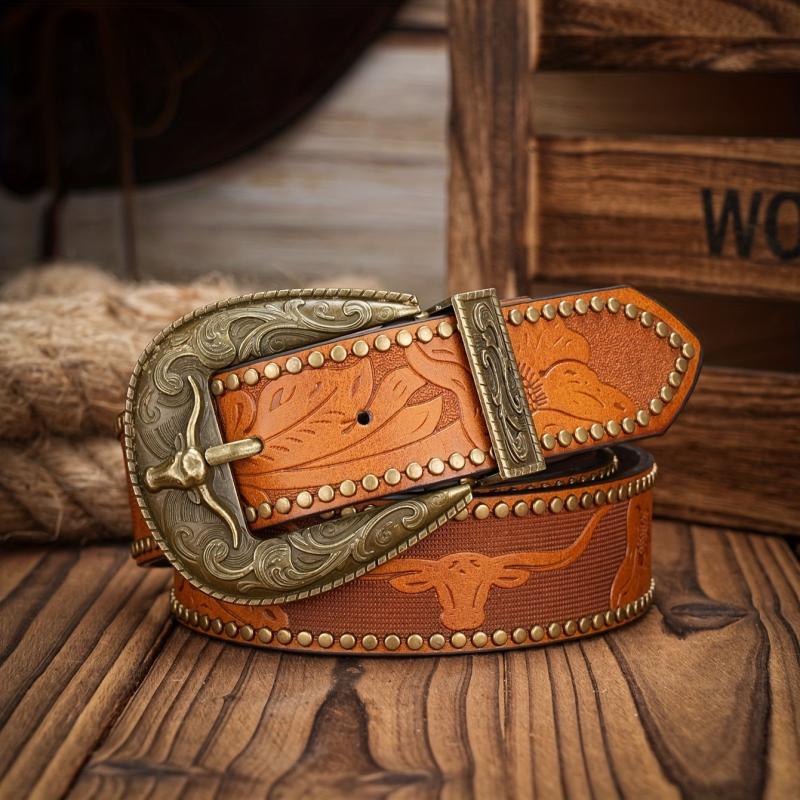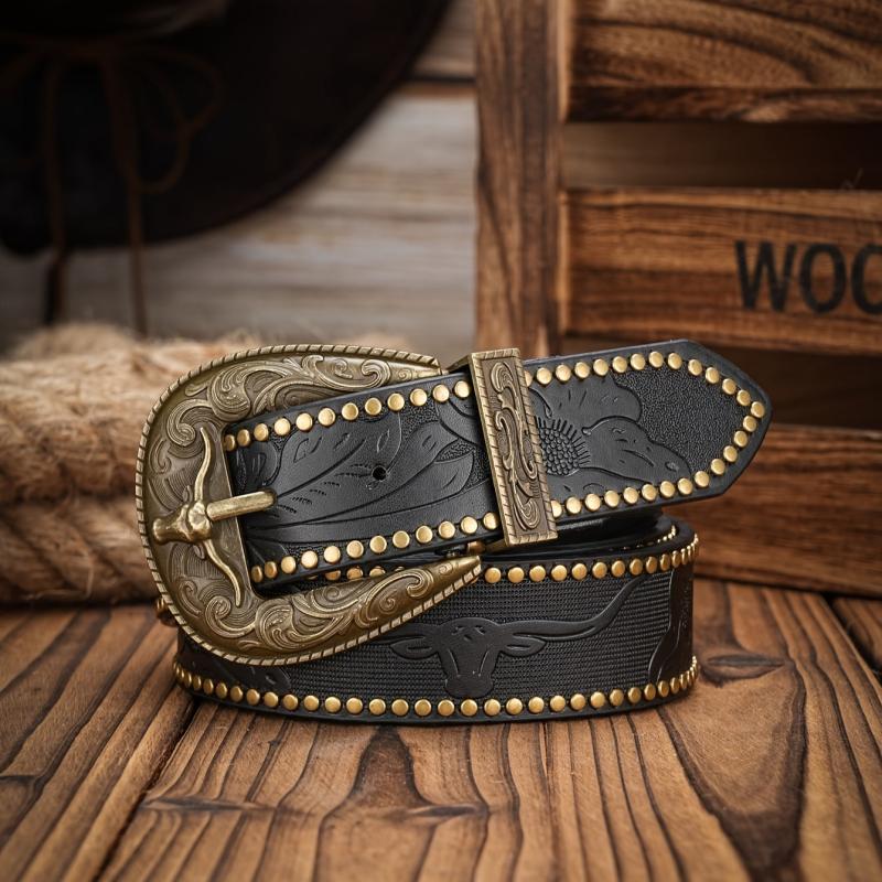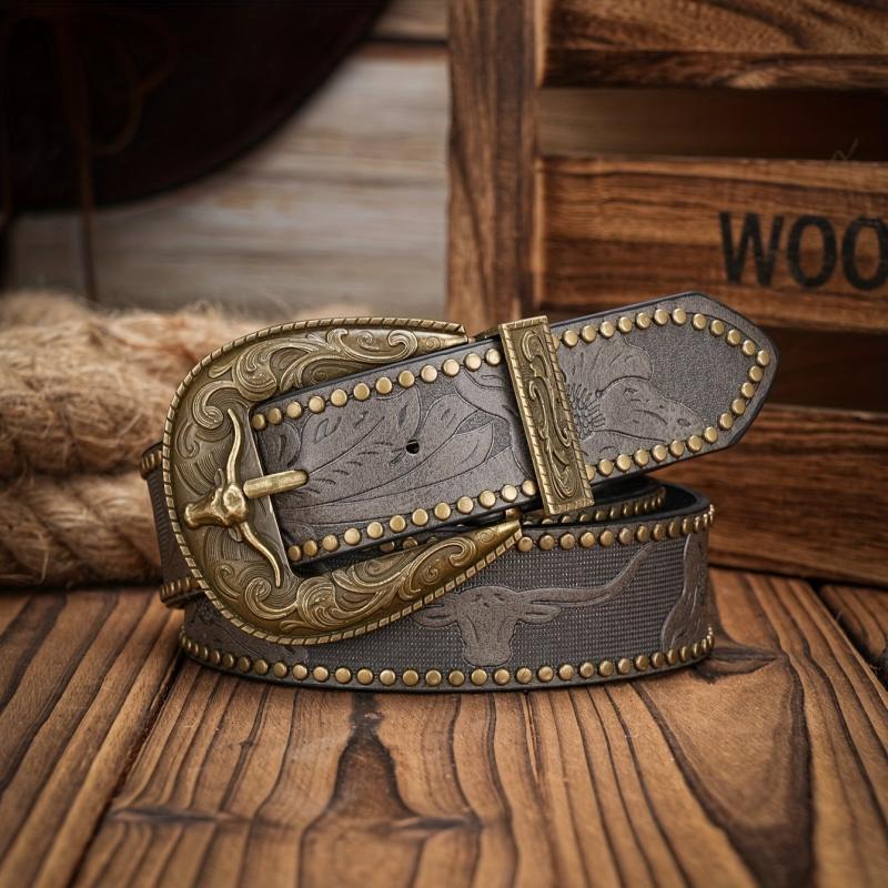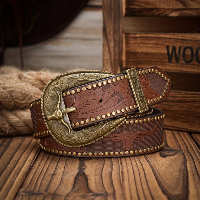 Elevate your casual attire with this vintage punk western belt featuring a bull head alloy buckle and studs in rustic brown. Perfect for parties and everyday wear.