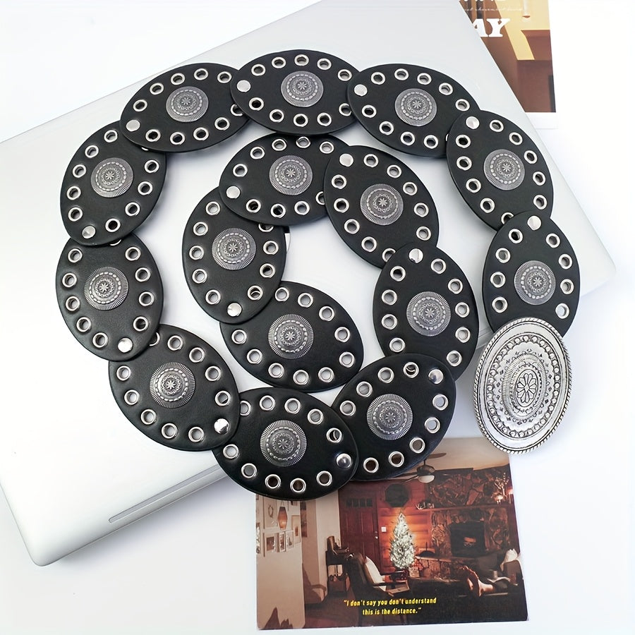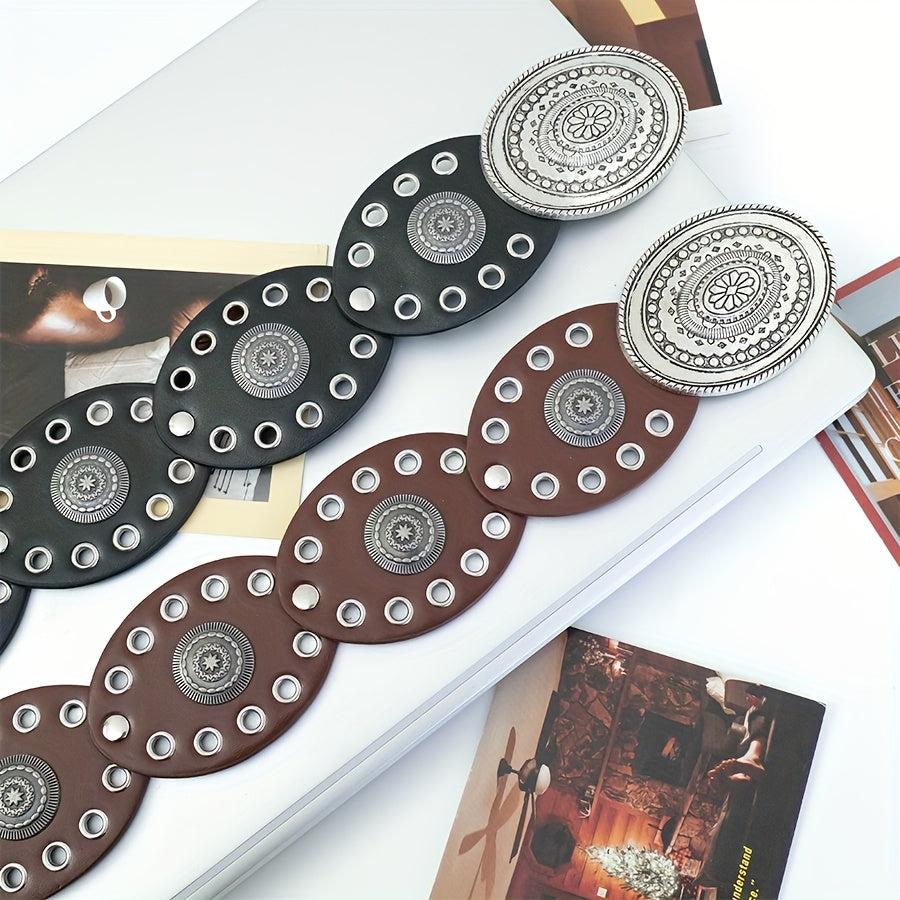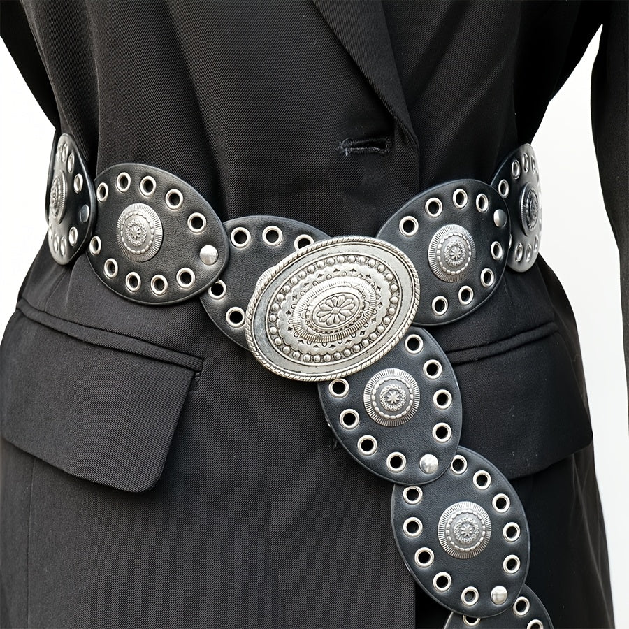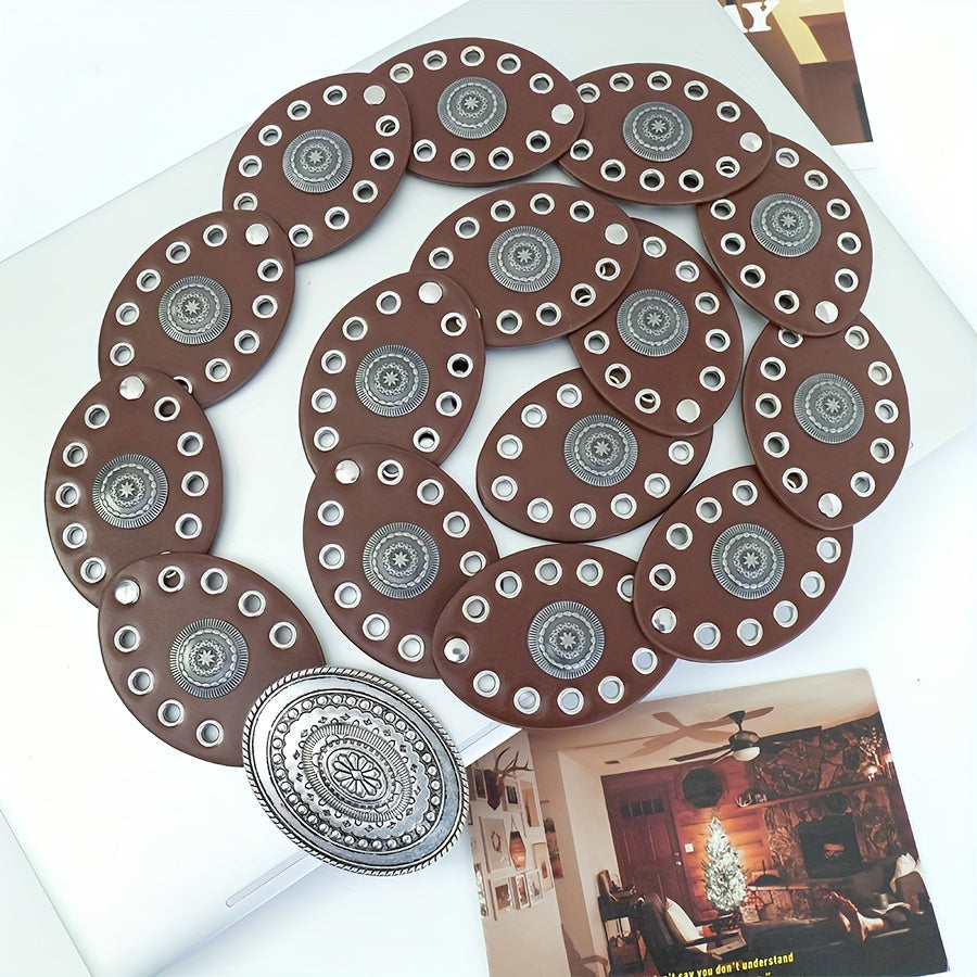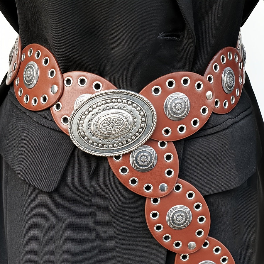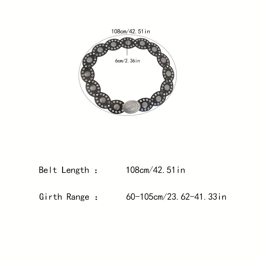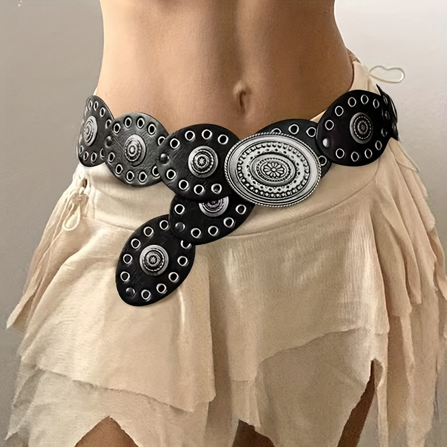 Add a touch of ethnic charm to your outfit with this bohemian-style belt featuring rivet oval discs and a vintage hollow carved buckle. Made of faux leather, this non-textile belt is perfect for weddings, parties, the beach, or a night out.