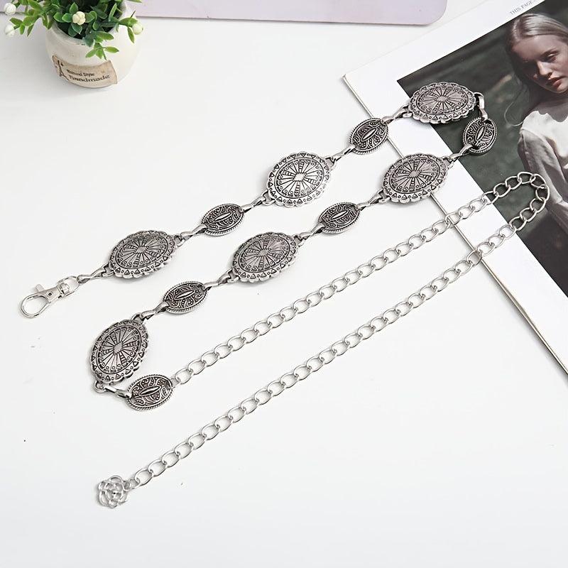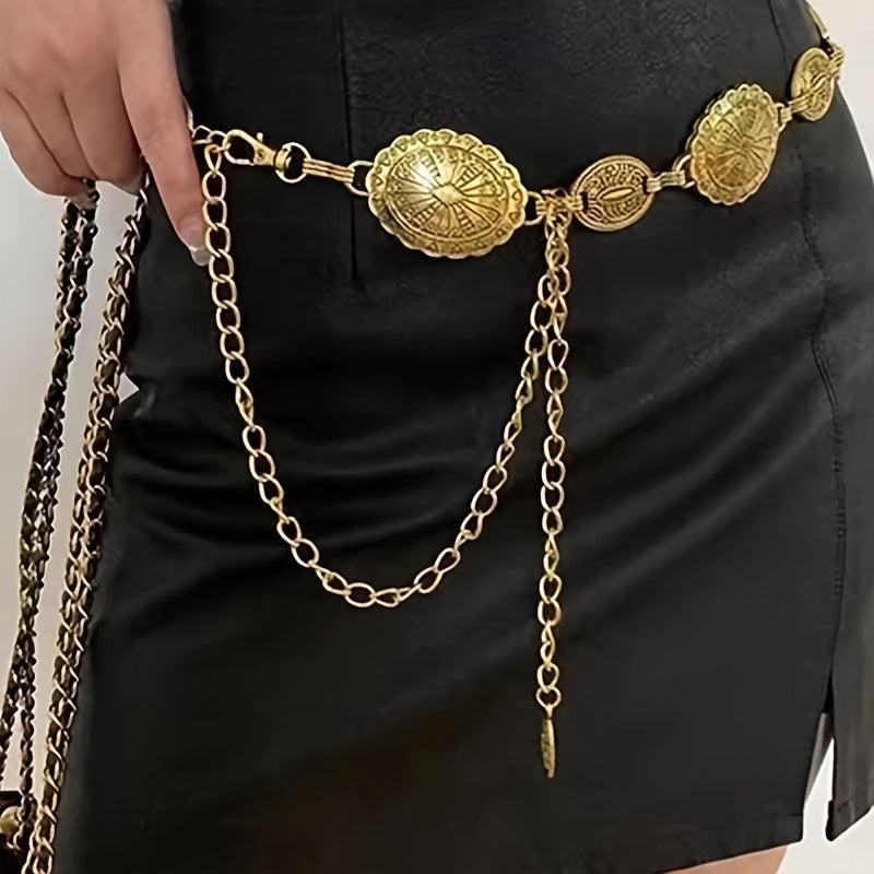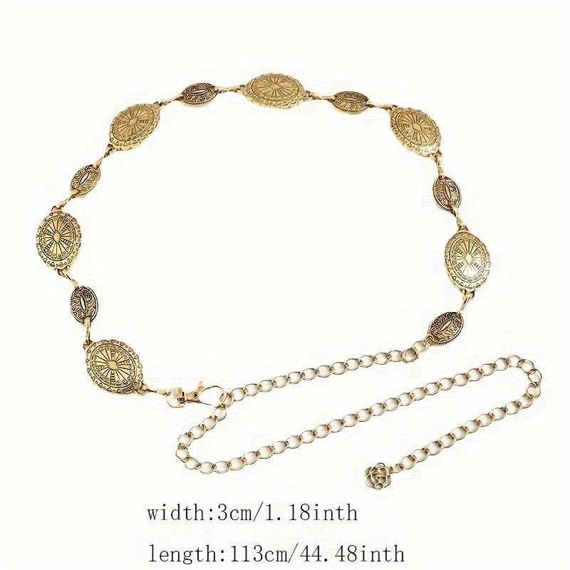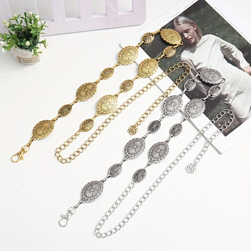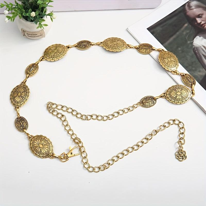 Add a touch of retro charm to your outfits with this fashionable Bohemian waist belt. The golden chain design with silvery decorations enhances the versatility of this belt, perfect for pairing with dresses and shirts.