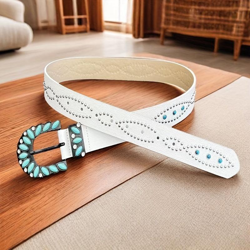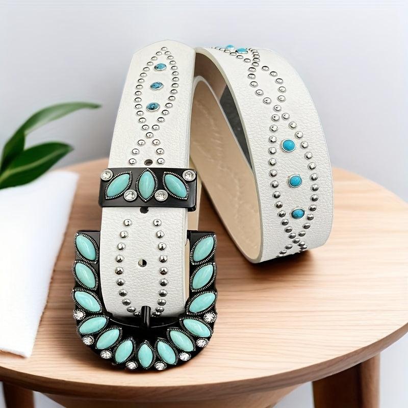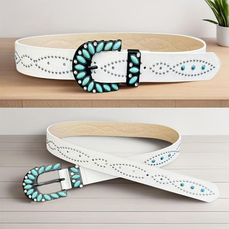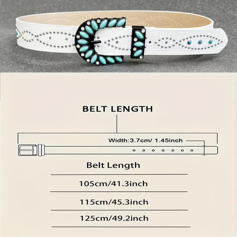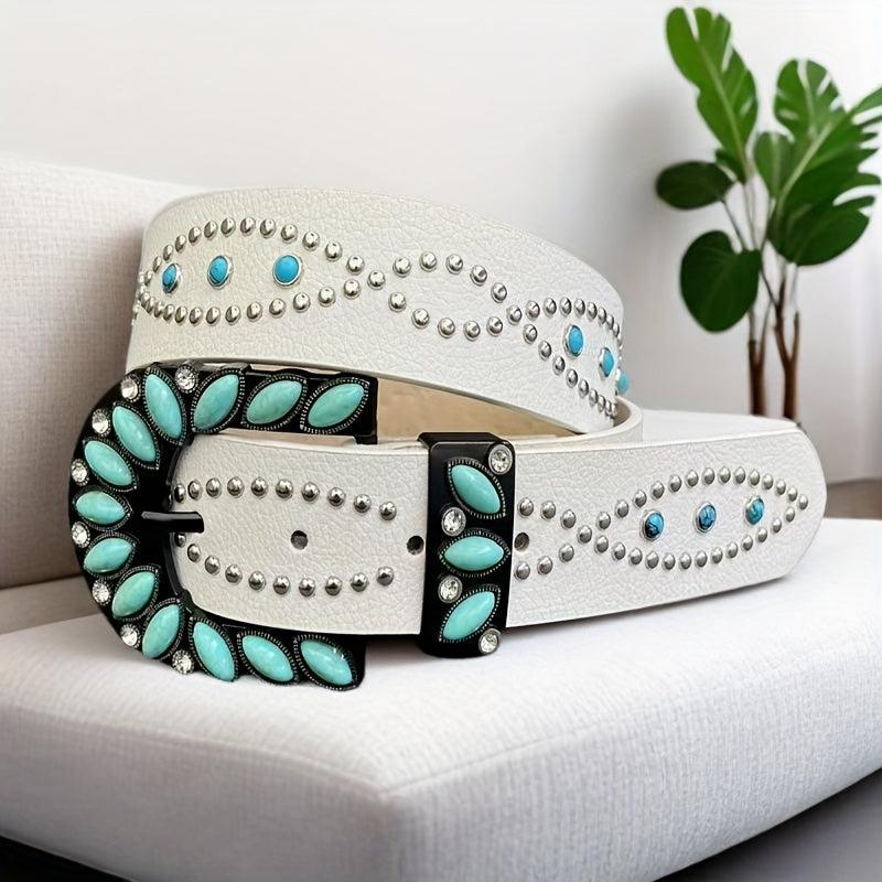 Elevate your look with this stylish faux leather belt featuring turquoise embellishments and rivet details. Perfect for jeans, beach outings, casual wear, and special occasions.