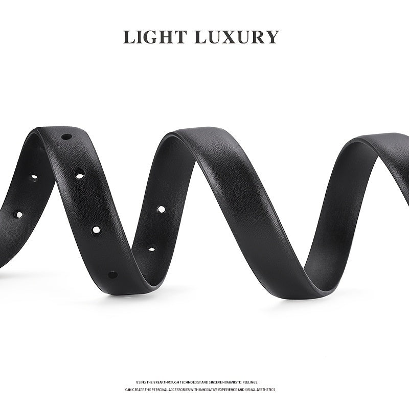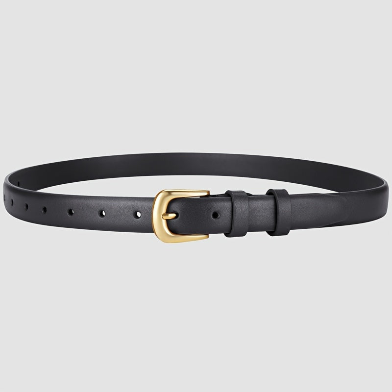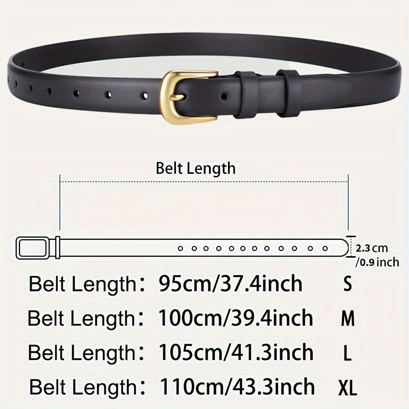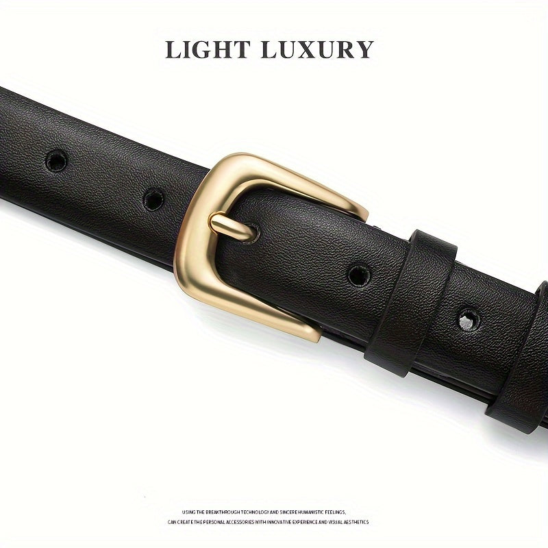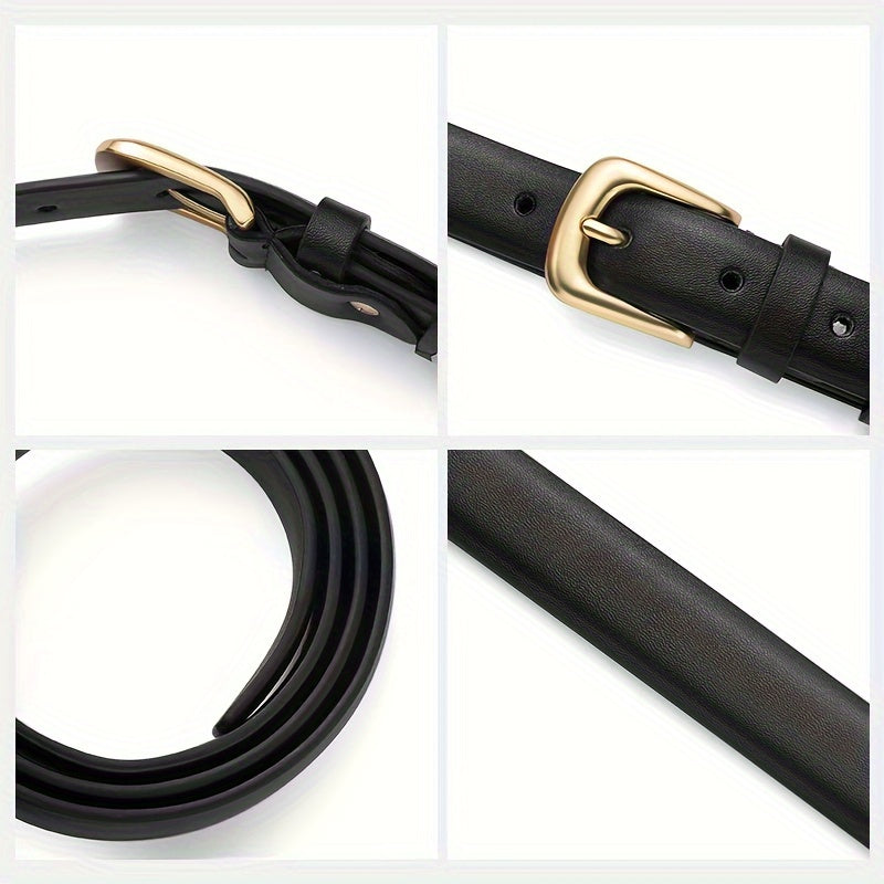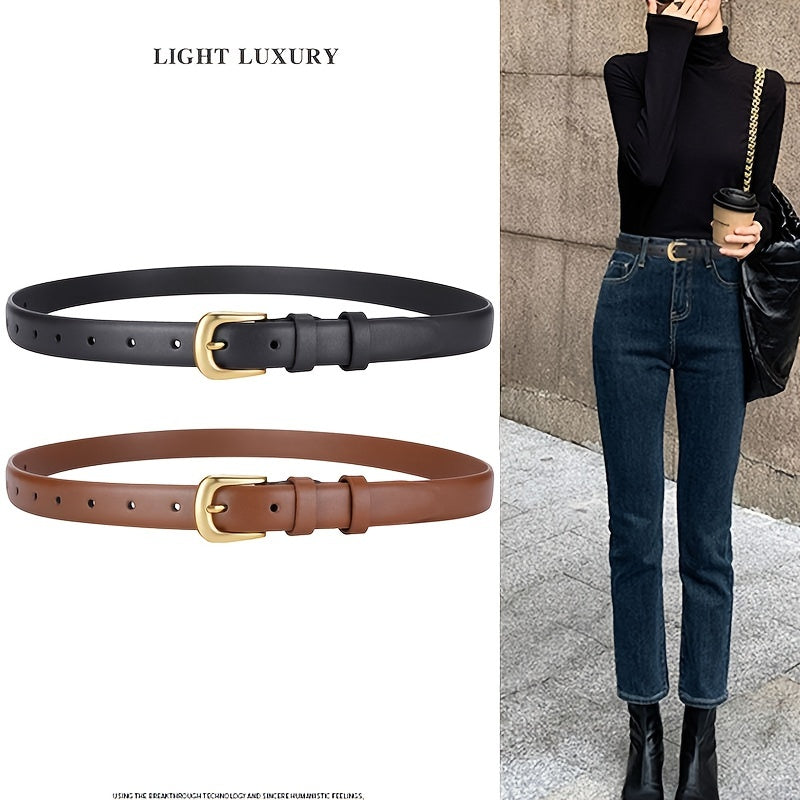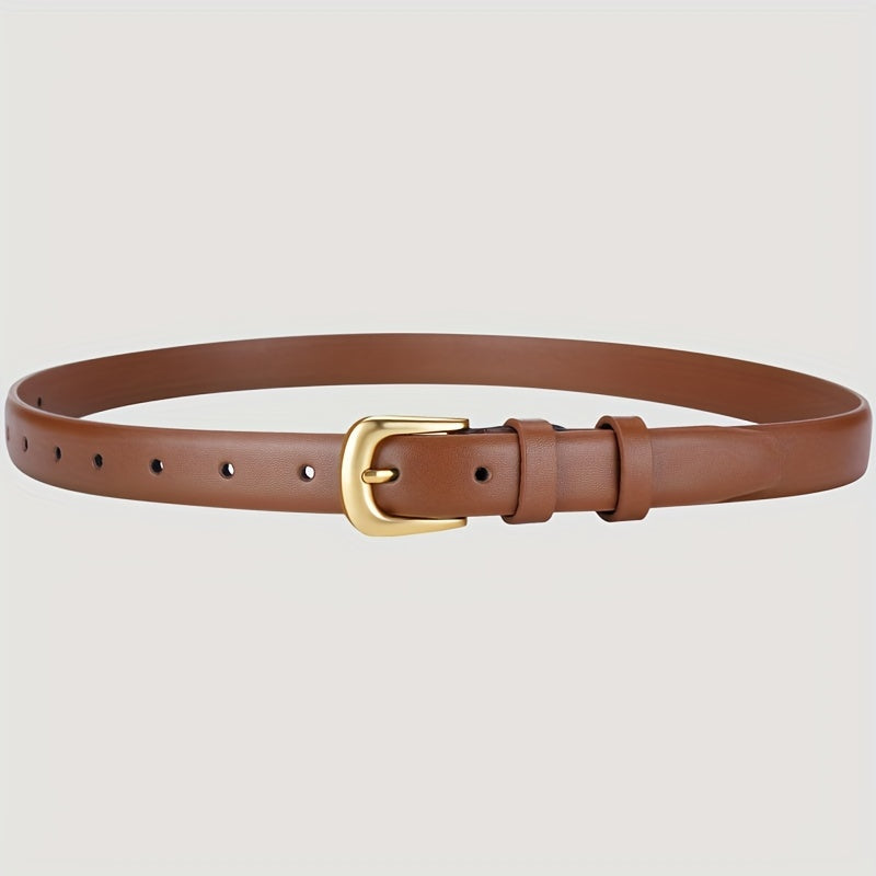 This women's belt is a stylish and versatile accessory made from PU leather, perfect for everyday wear. It complements jeans and casual attire with its elegant design in brown and a golden-toned metal buckle.
