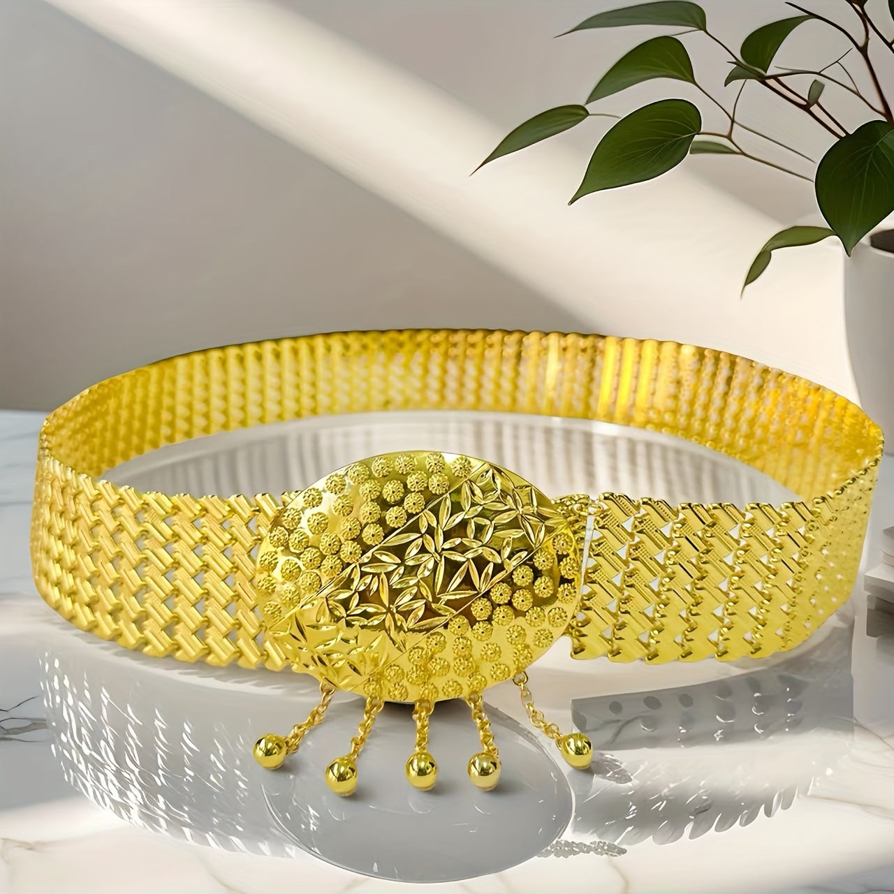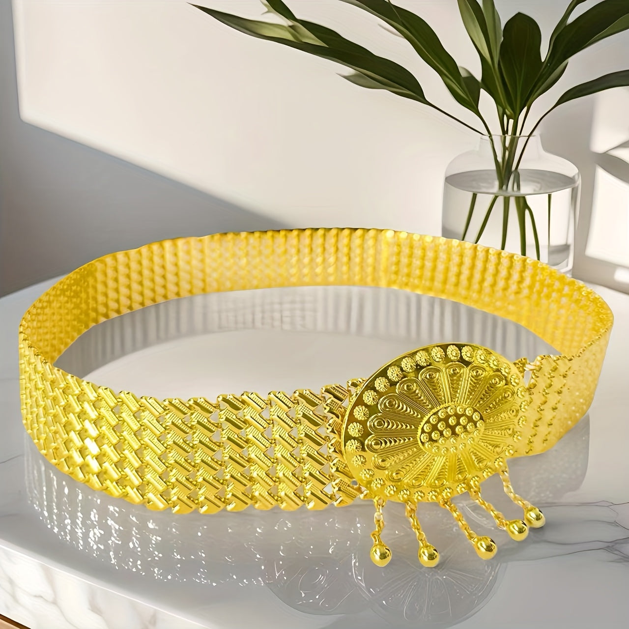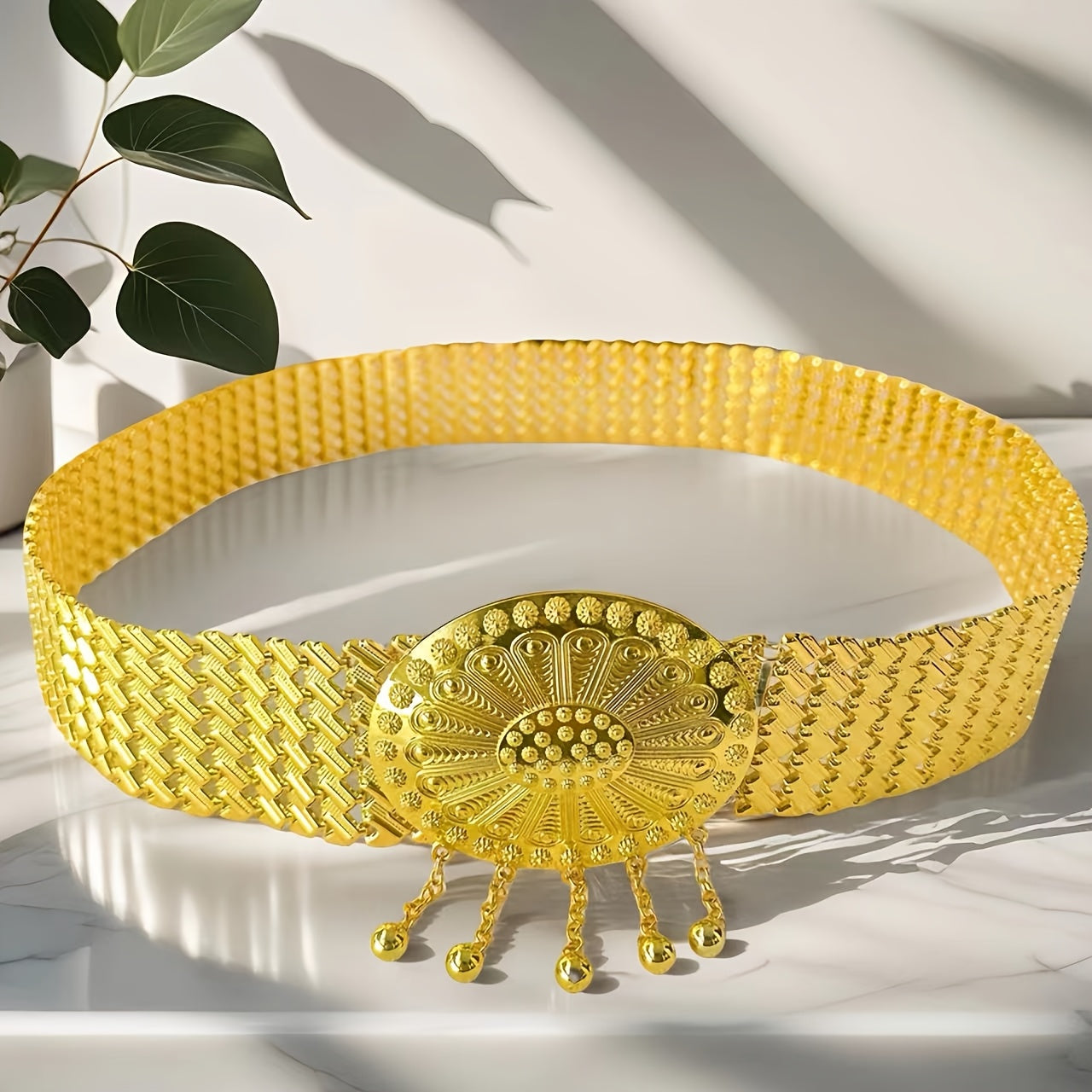 Elevate your look with this Middle Eastern inspired golden belt featuring intricate sequin details and a beautifully embossed metal buckle. Perfect for weddings, parties, and adding an elegant touch to your everyday attire.