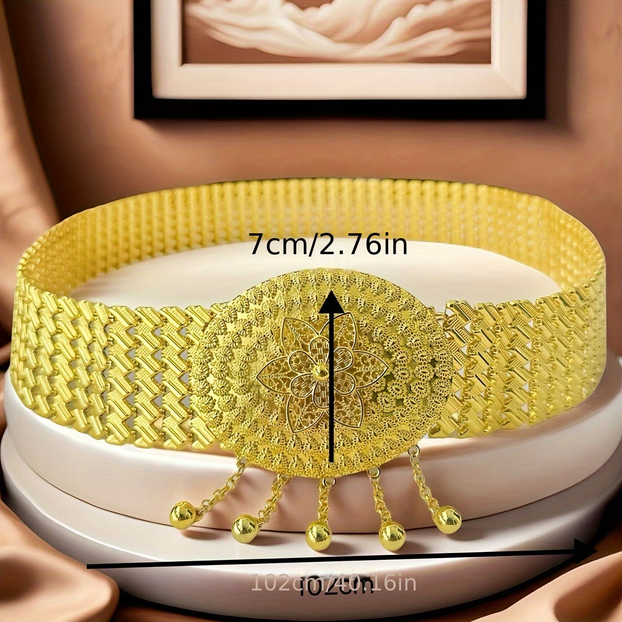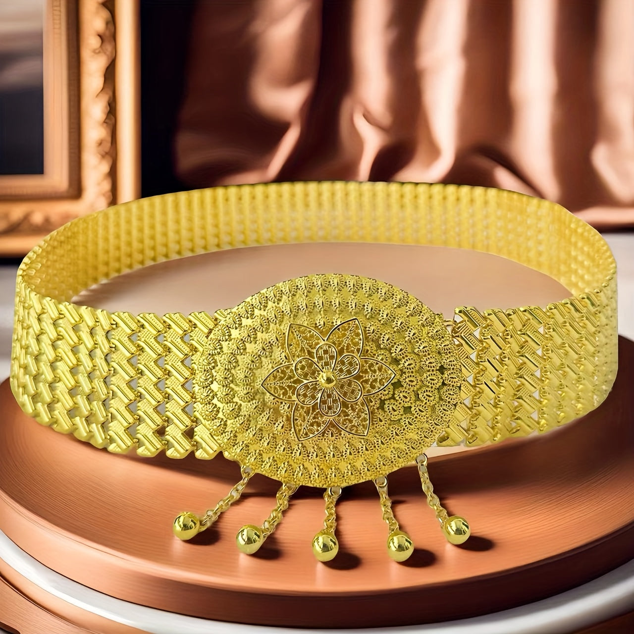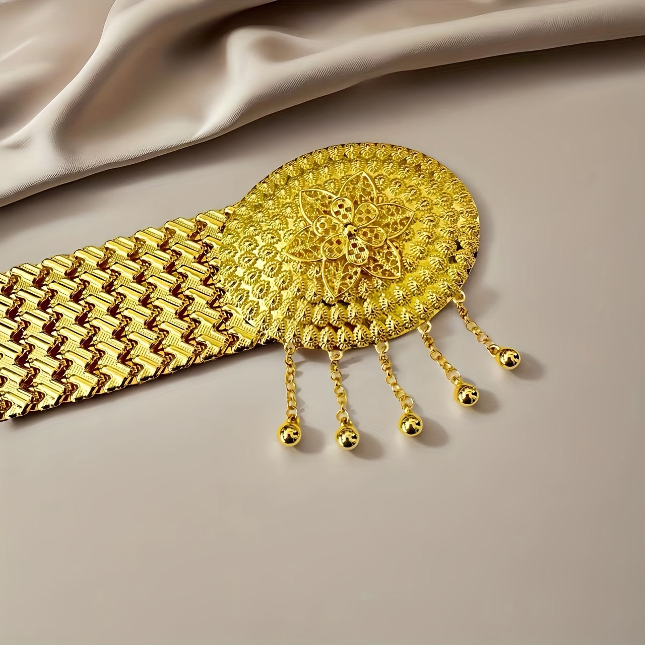 Elevate your look with this Middle Eastern inspired golden belt featuring intricate sequin details and a beautifully embossed metal buckle. Perfect for weddings, parties, and adding an elegant touch to your everyday attire.