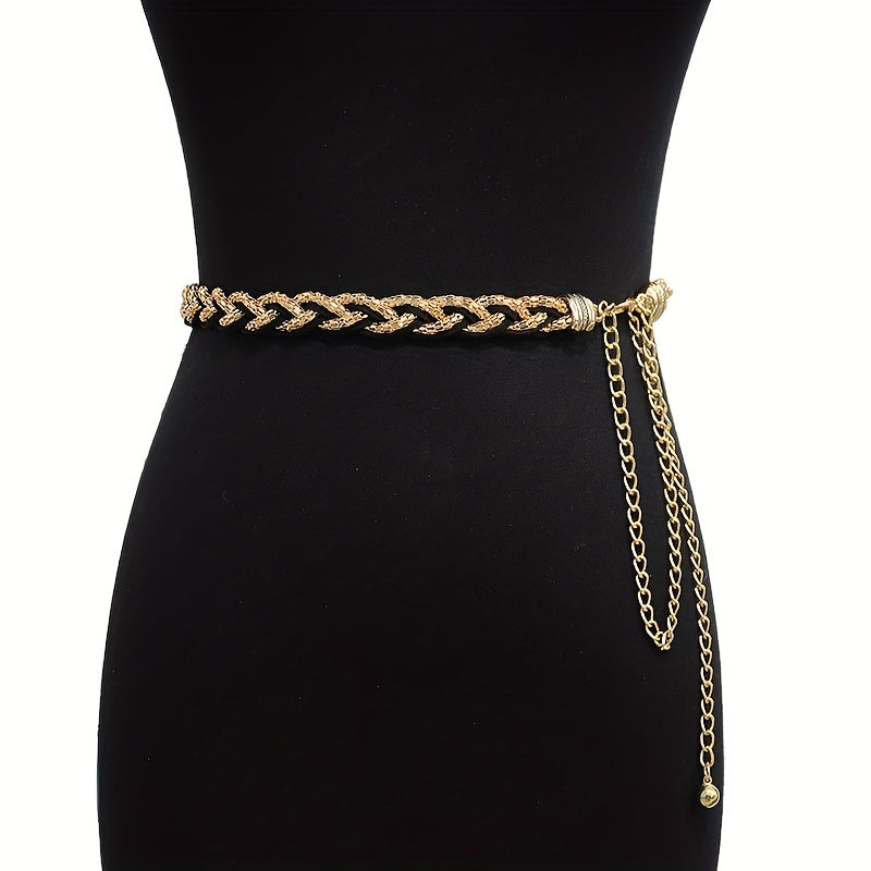 Add a touch of glamour to your outfit with this stylish waist chain featuring golden sequins and metal tassels. Perfect for dressing up your coat, dress, or any outfit.