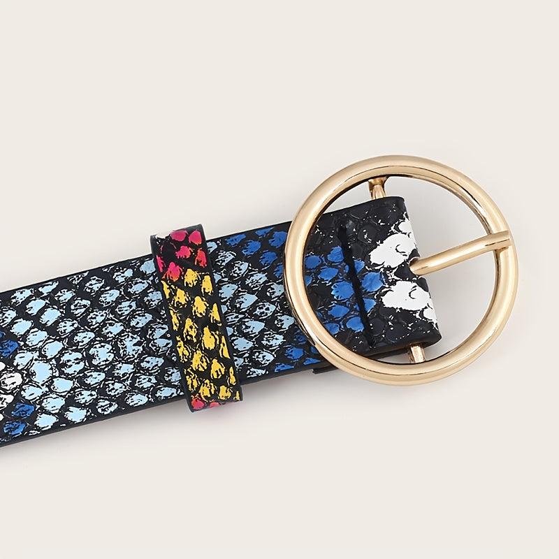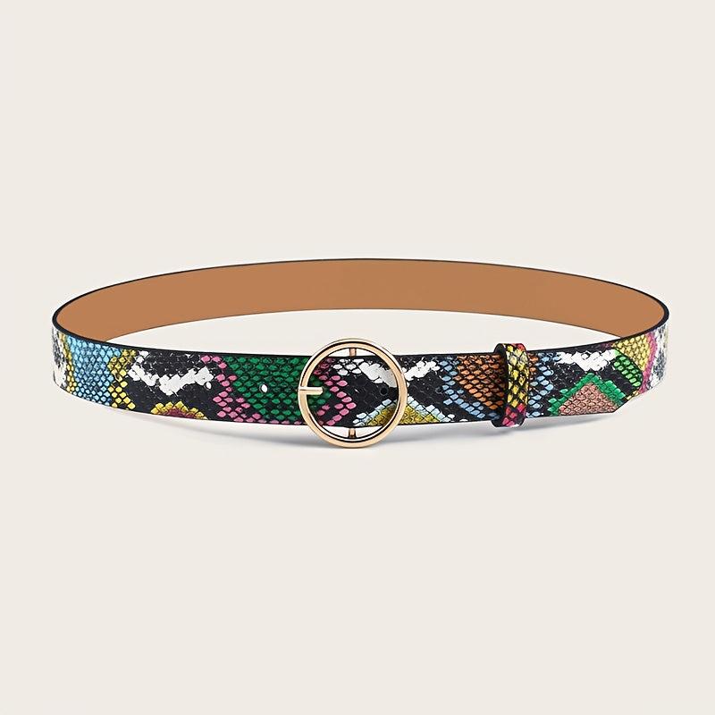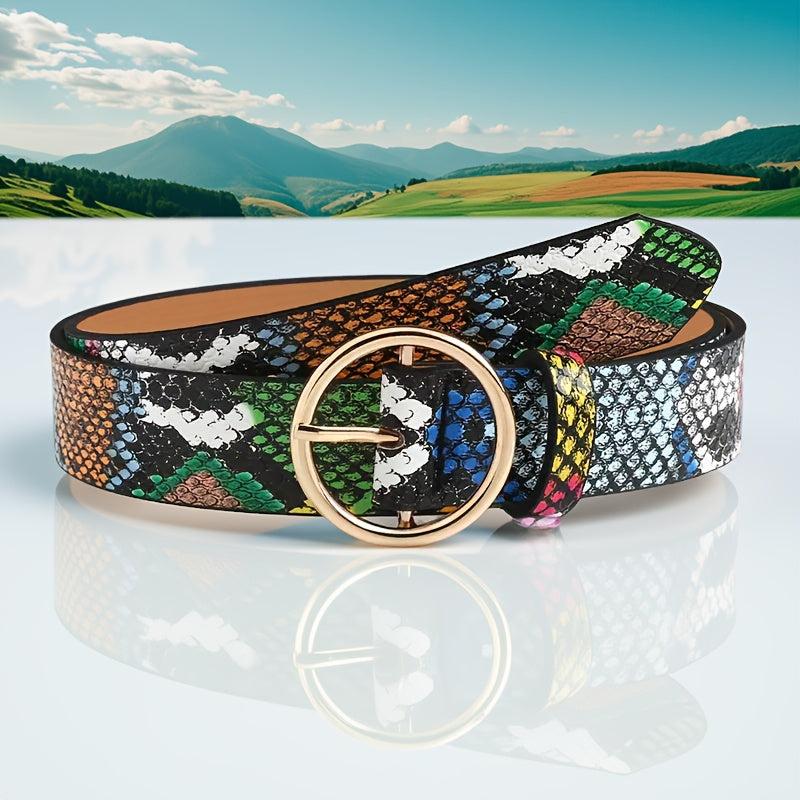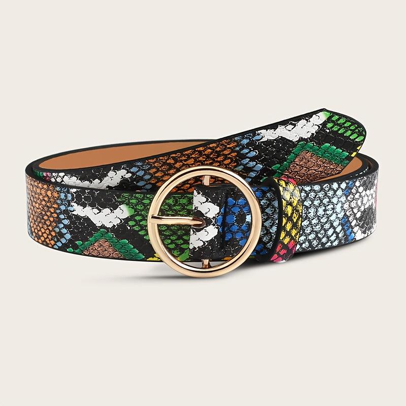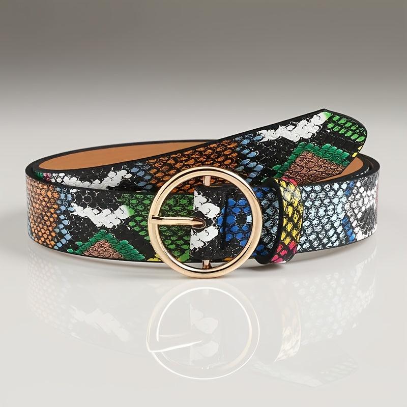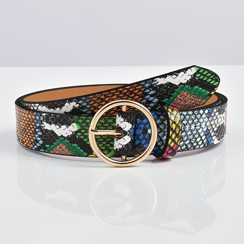 Stylish green snake patterned belt with a round buckle that complements jeans, dresses, or acts as a decorative waist cincher.
