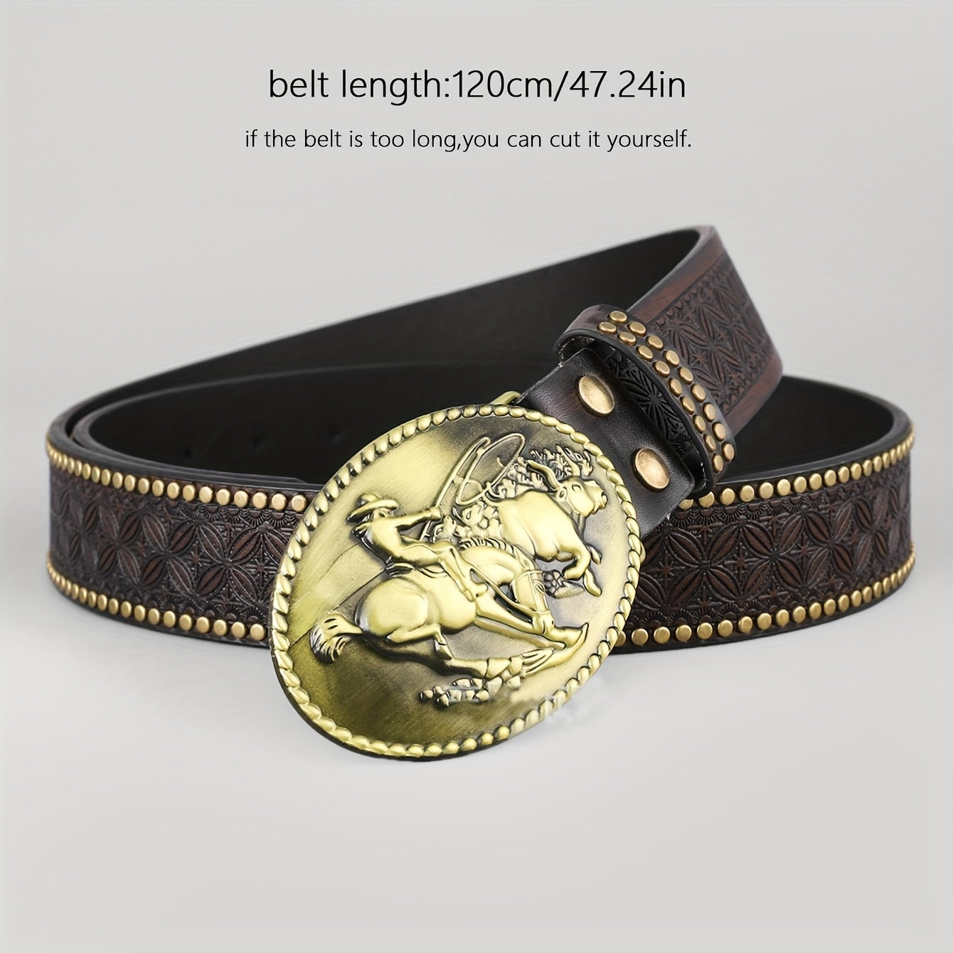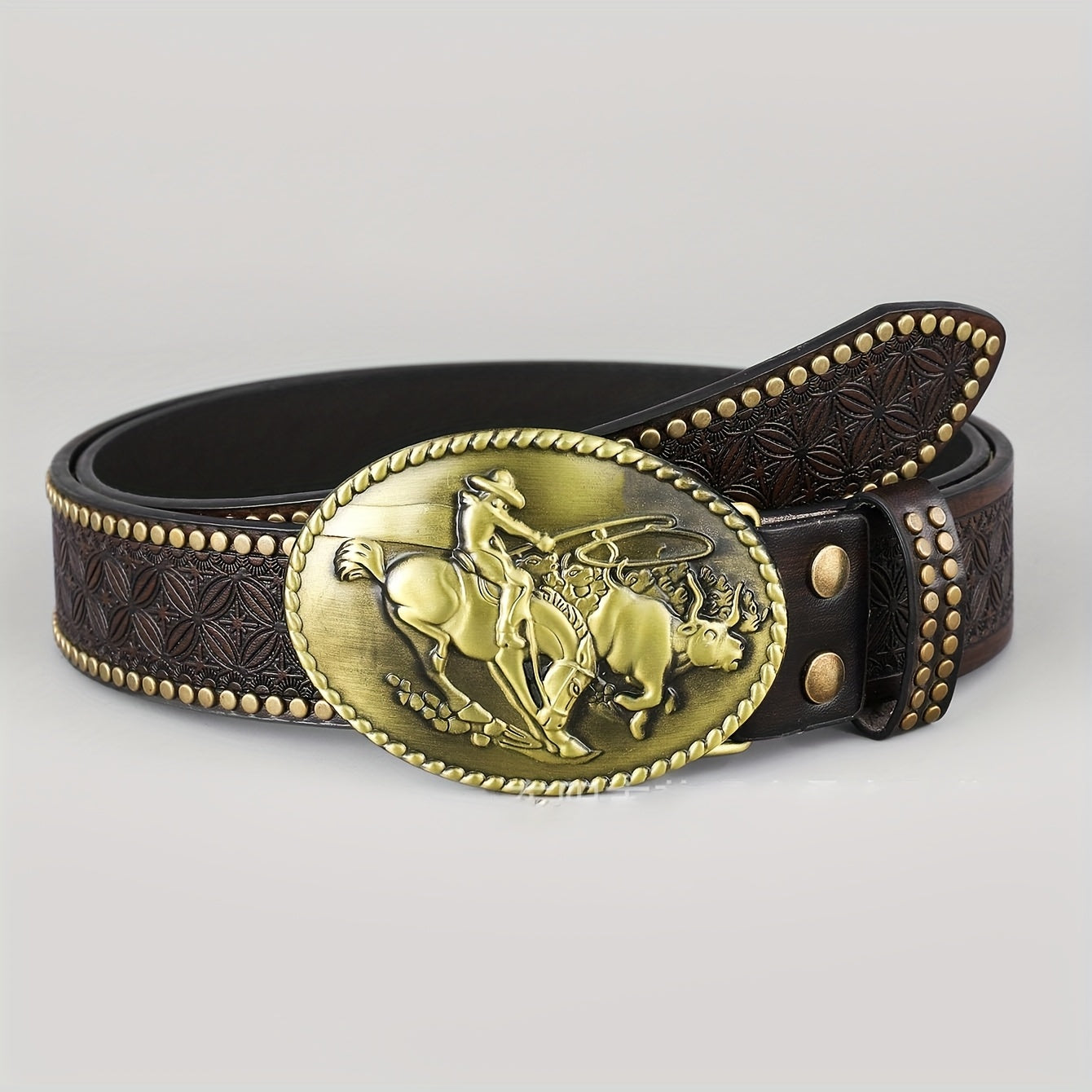 This durable faux leather belt features rivet details and a bull head buckle. Perfect for casual or streetwear themed events.