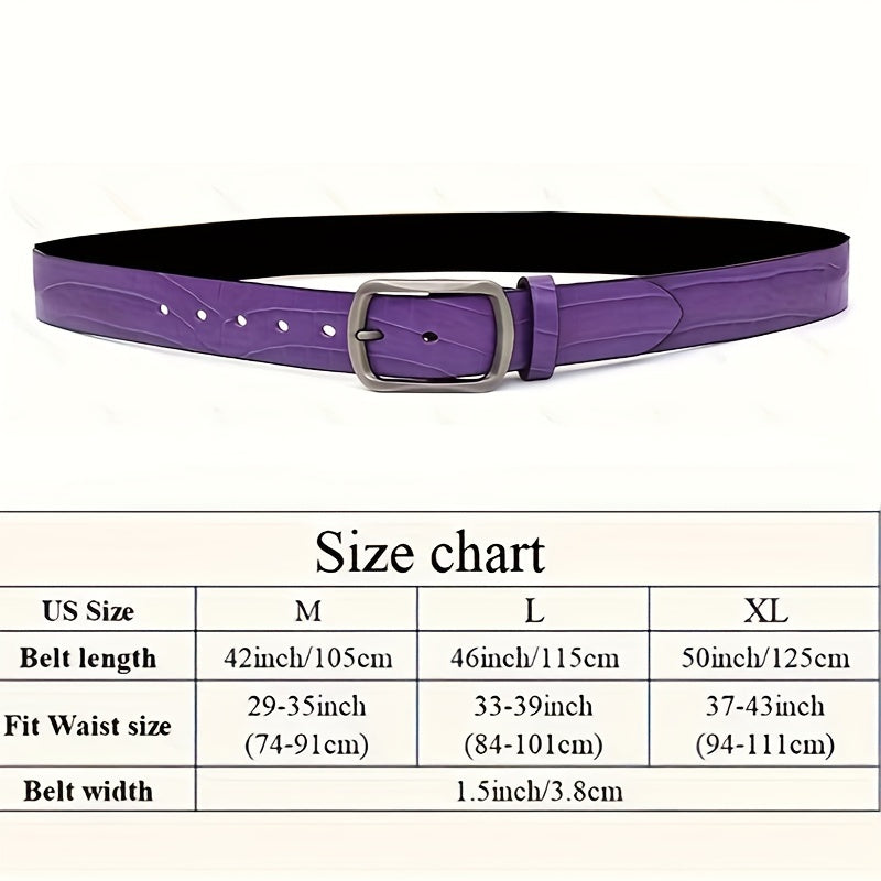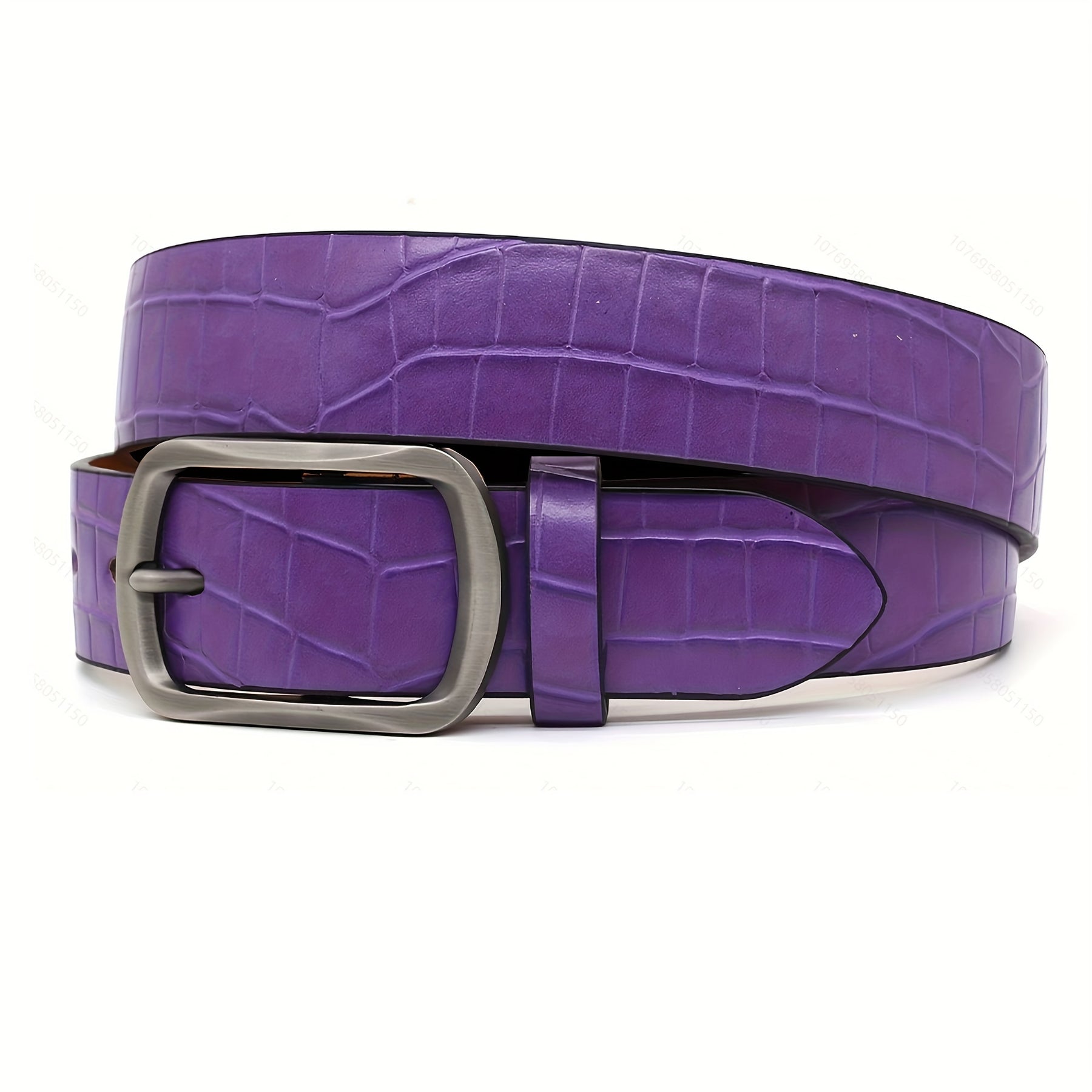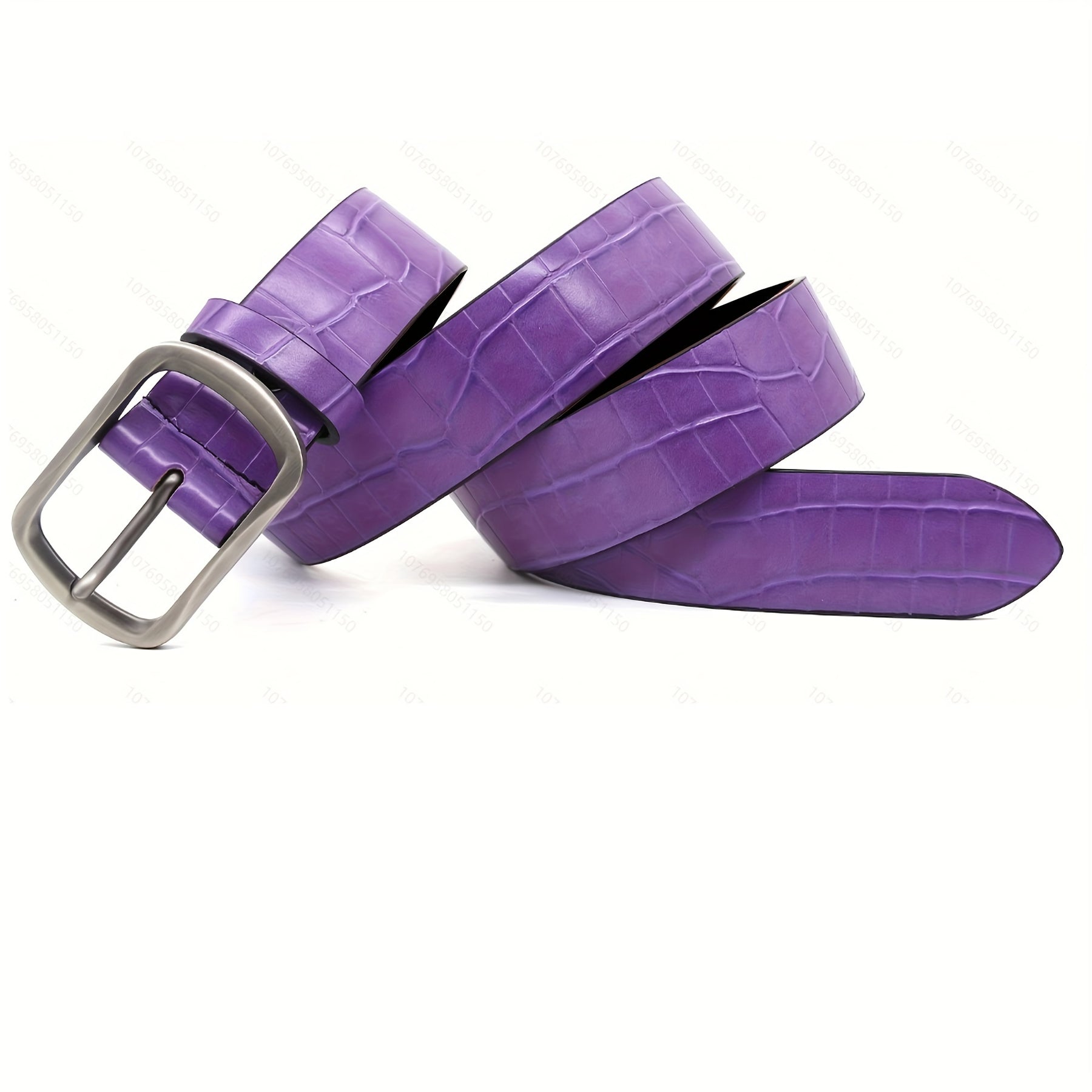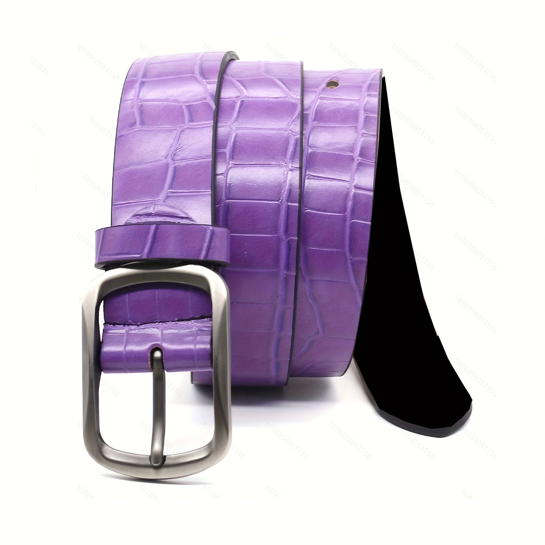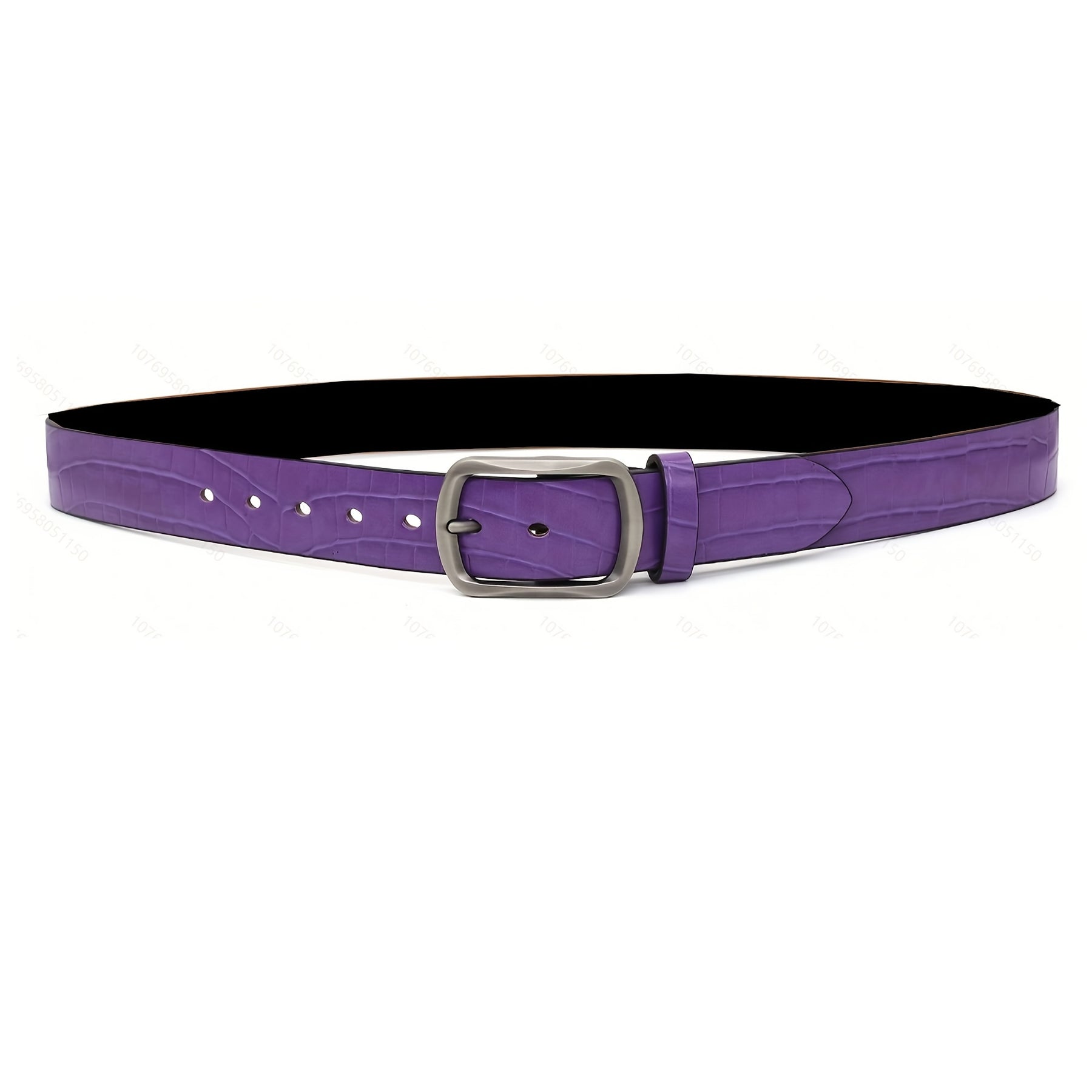 This non woven belt features a purple crocodile skin faux leather design that is perfect for parties, beach outings, and evening events. It has a vintage stitched classic buckle and regular fit.