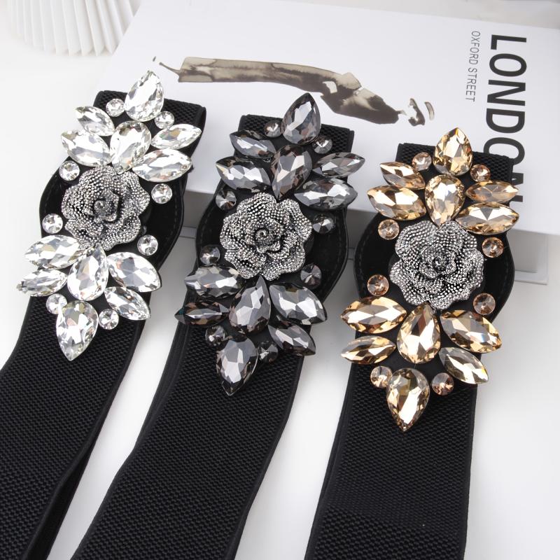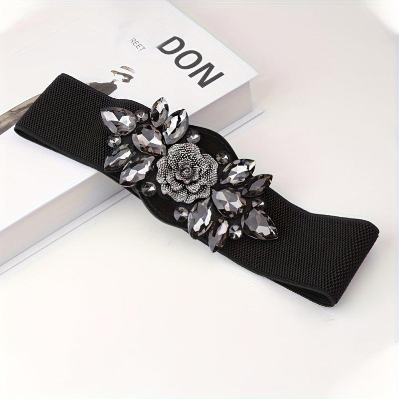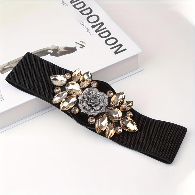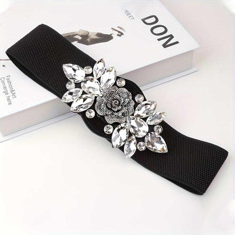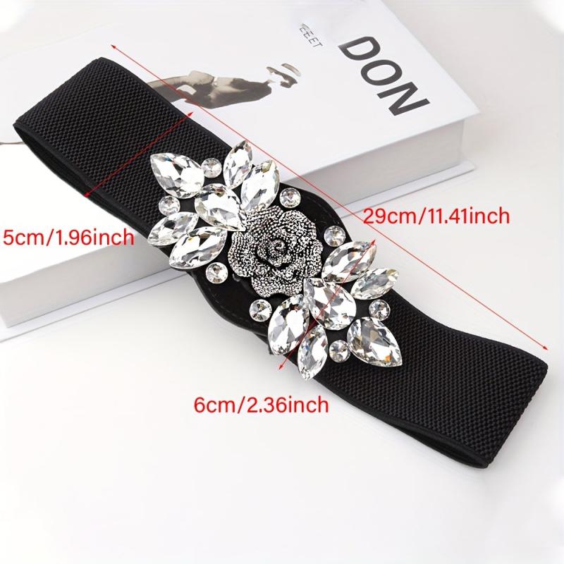 Enhance the style of your jacket with this rose rhinestone inlaid elastic waistband. Perfect for adding a touch of glamour to your outfit.