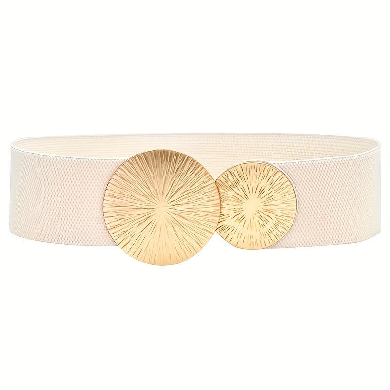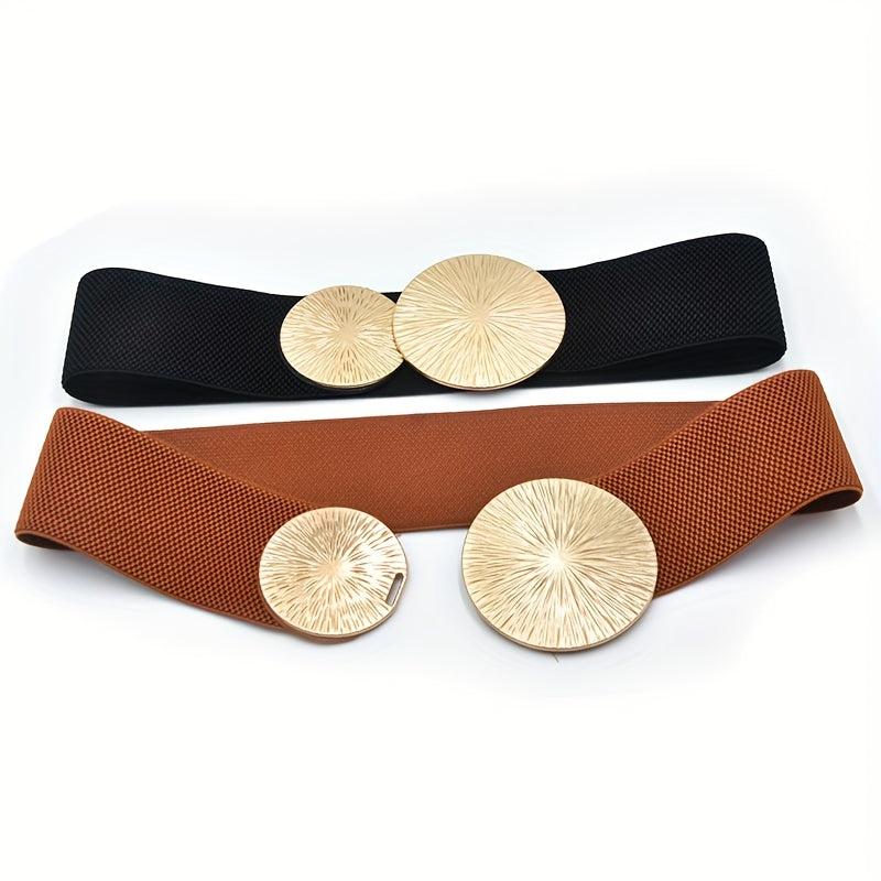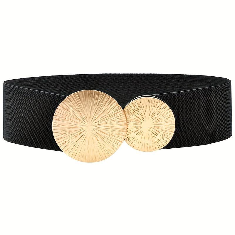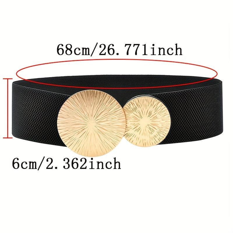 Enhance your outfit with this wide elastic belt featuring a golden buckle. The belt is perfect for dresses and provides a flattering fit.
