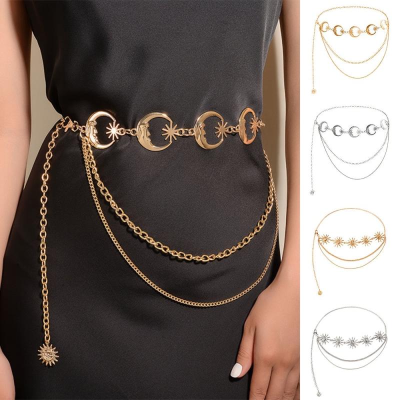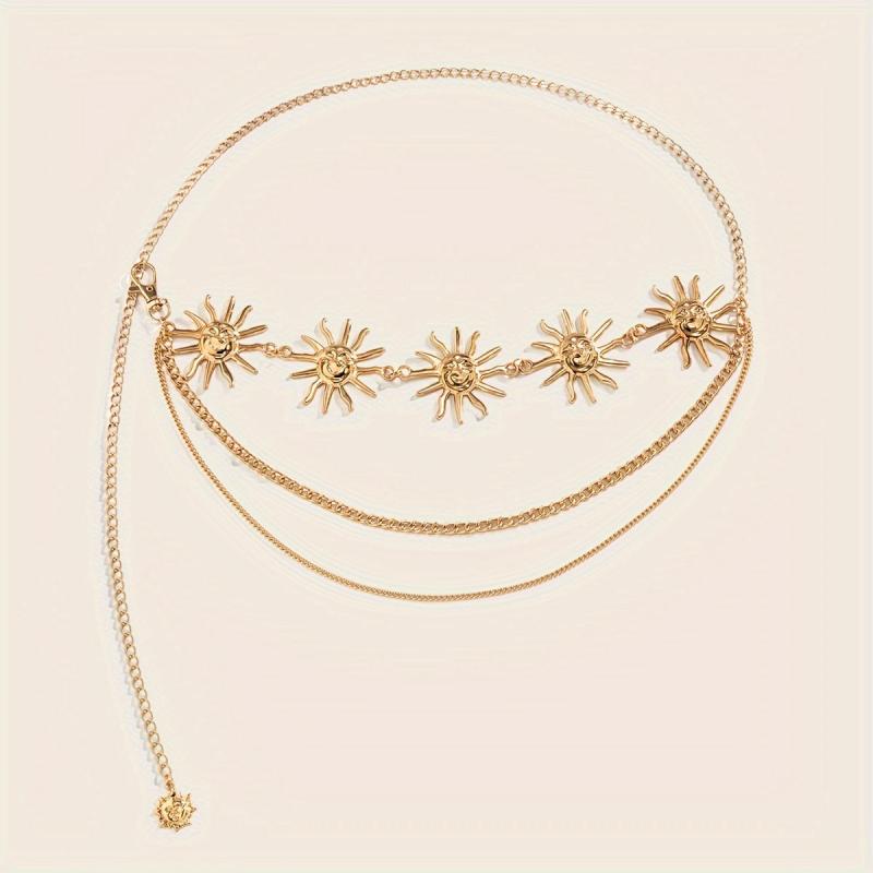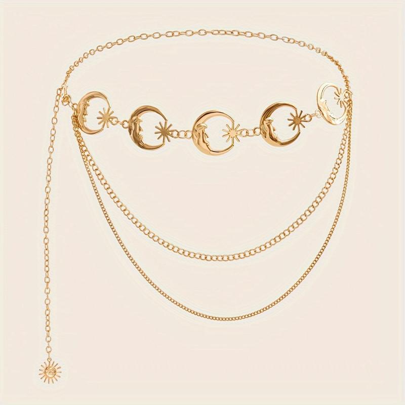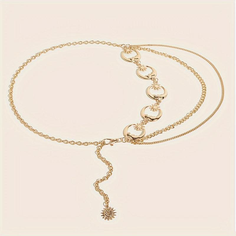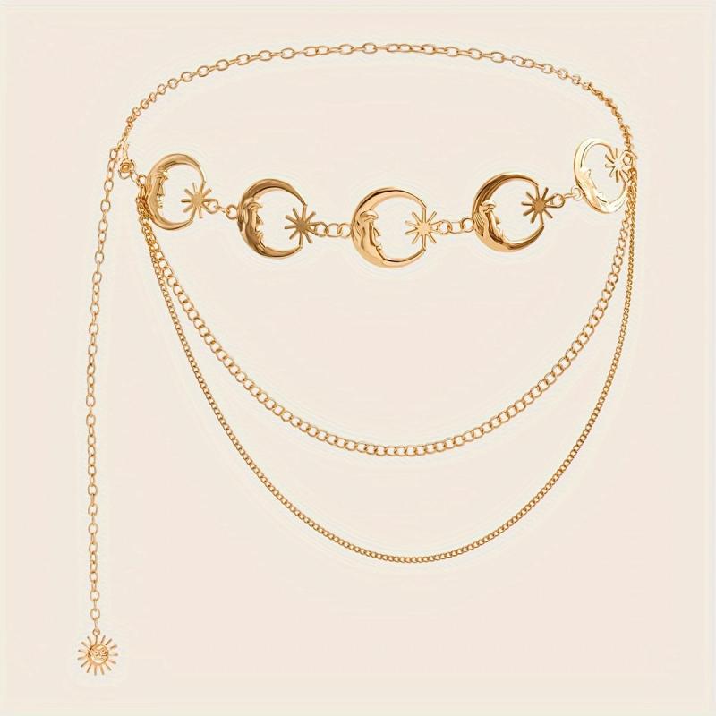Elevate your style with this vintage accessory. The belt features three layers of golden chains, adorned with a silvery moon and sun flower.