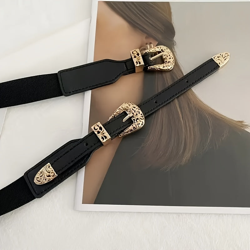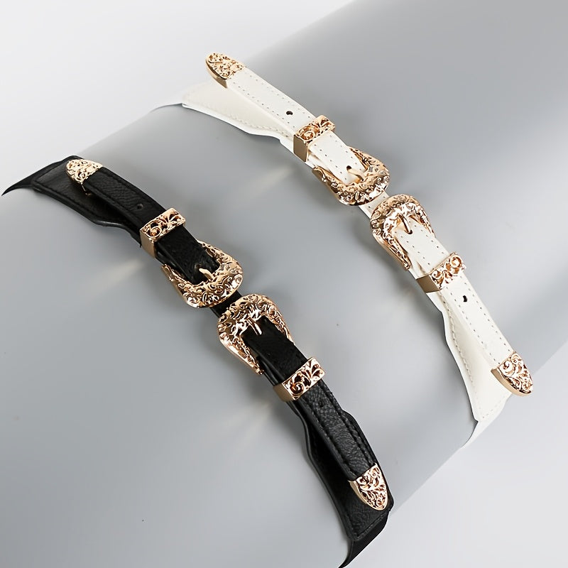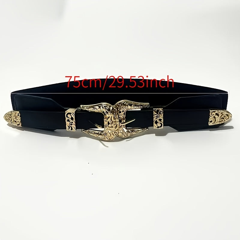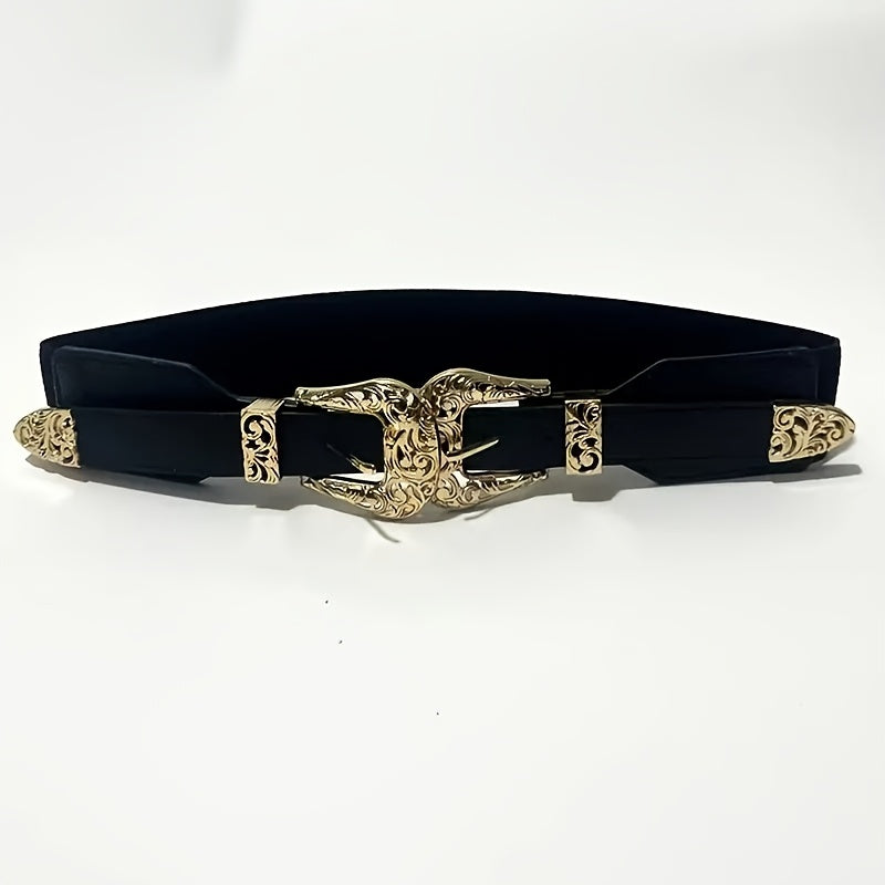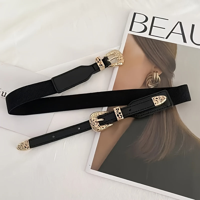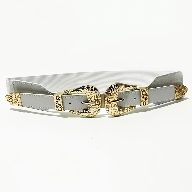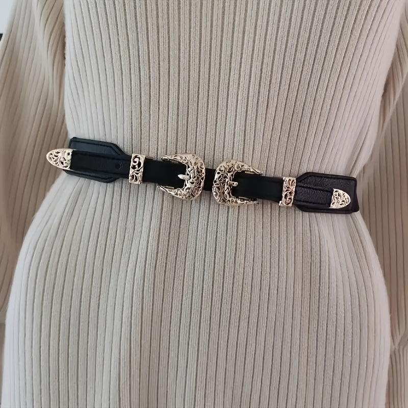 Add a touch of vintage charm to your outfit with this wide belt featuring a double buckle design. Made of carved elastic for a comfortable fit, this waist cincher is the perfect accessory for casual weekends or special occasions. The hollow non-textile weave adds a unique texture to your look without any feathers, making it suitable for any outfit.