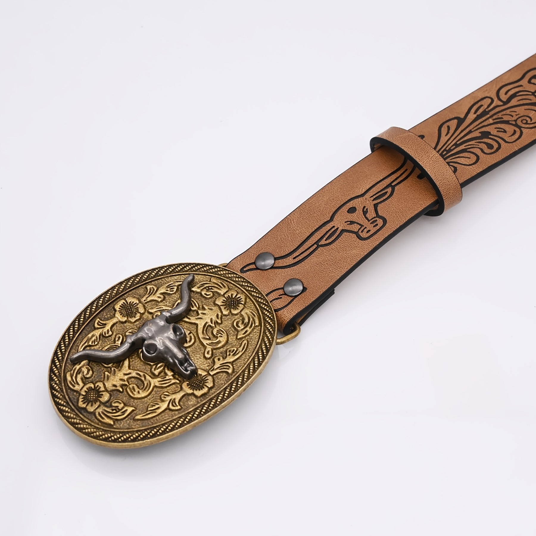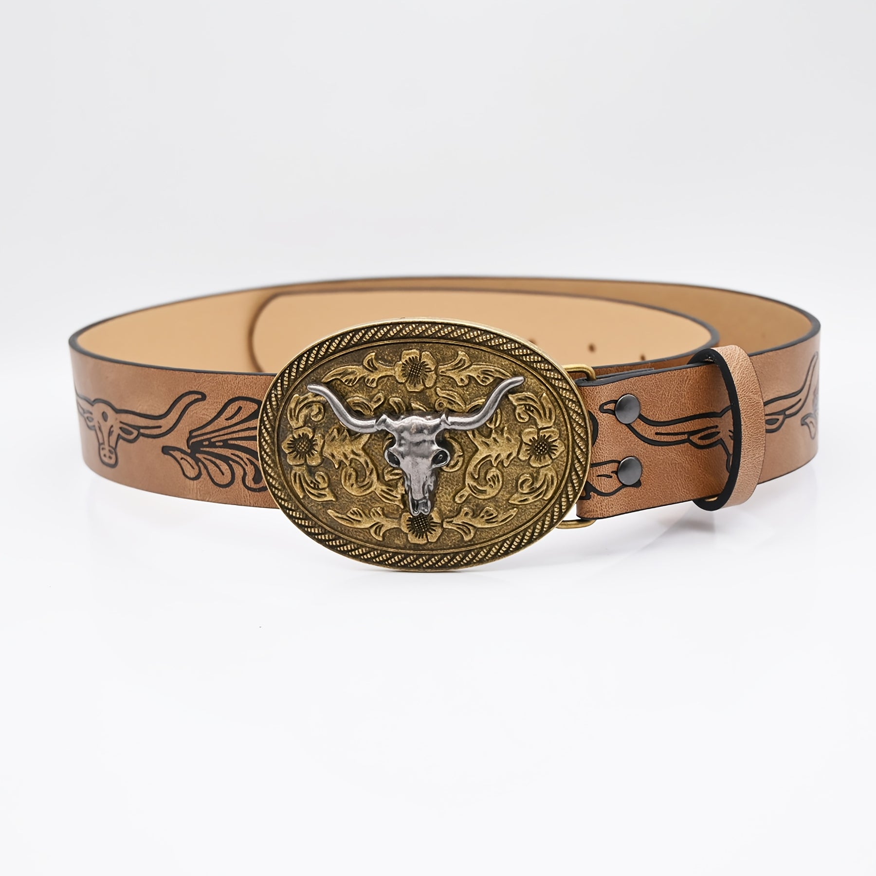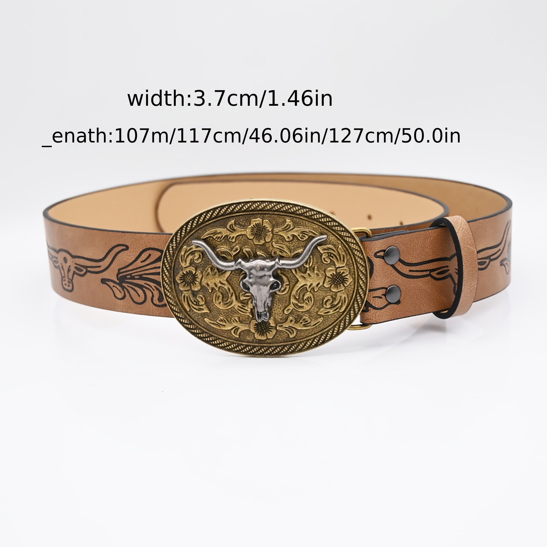 Add a touch of western charm to your outfit with this vintage cowboy belt featuring an embossed bull head buckle. Made of brown PU leather with a fashionable print, this accessory is perfect for a mature beach night out or casual weekend look.