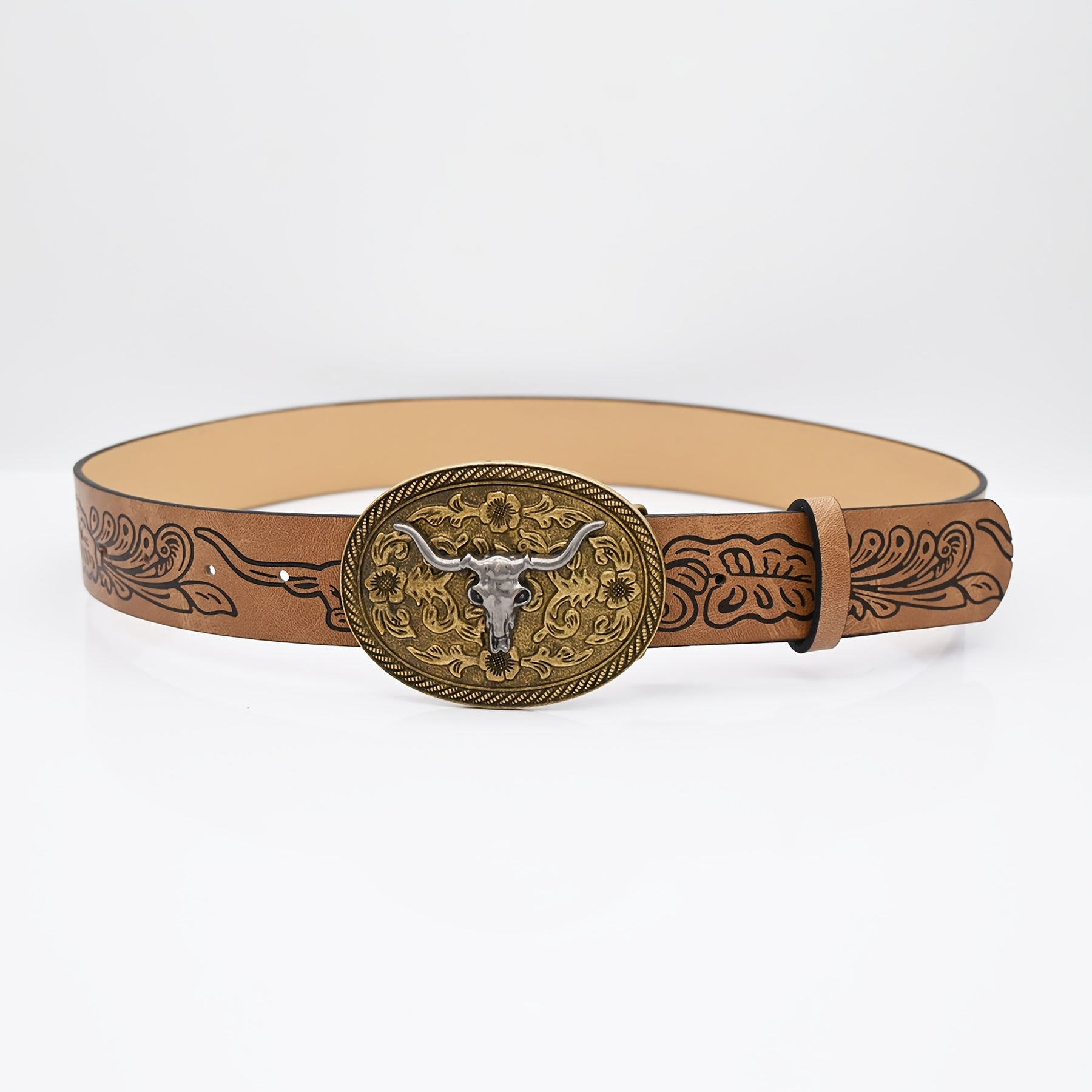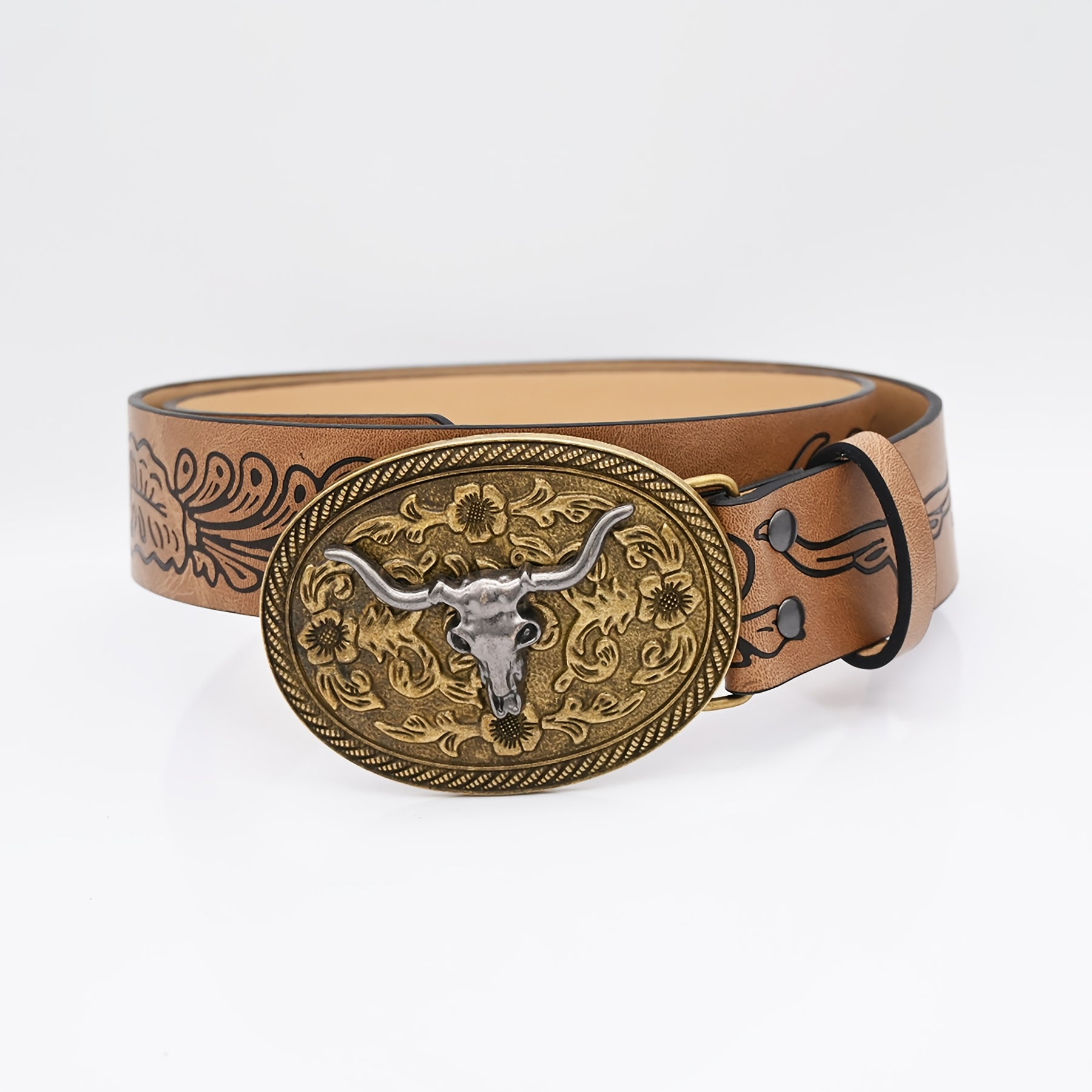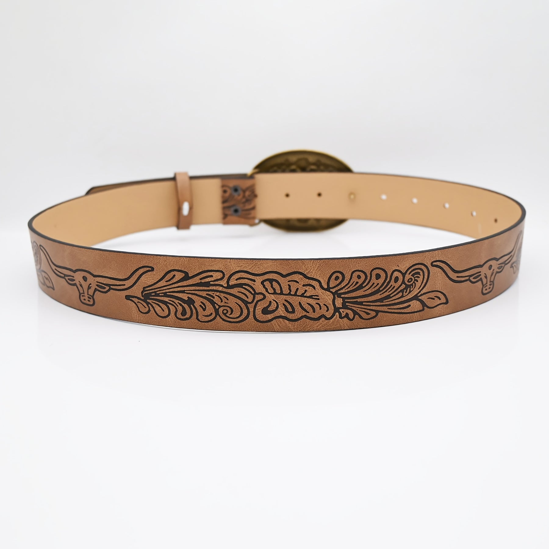 Add a touch of western charm to your outfit with this vintage cowboy belt featuring an embossed bull head buckle. Made of brown PU leather with a fashionable print, this accessory is perfect for a mature beach night out or casual weekend look.