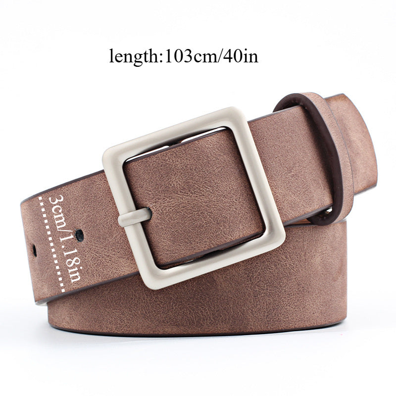 Elevate your outfit with this stylish faux leather belt featuring a square metal pin buckle. The belt is made of woven faux leather with eyelet embellishments and is easy to clean with a wet wipe.