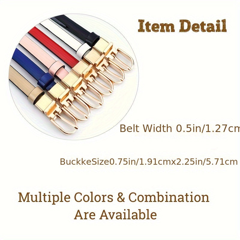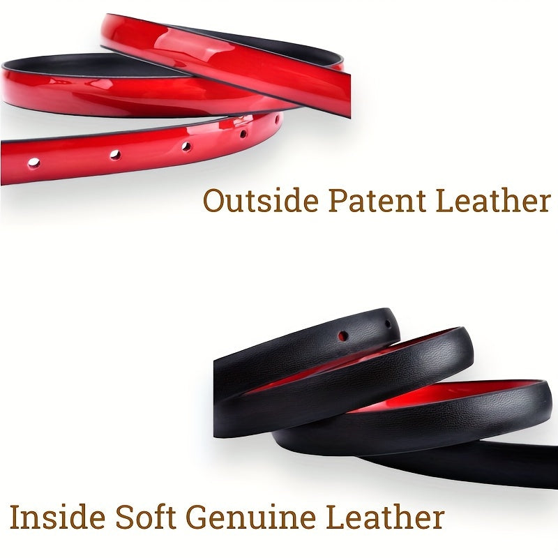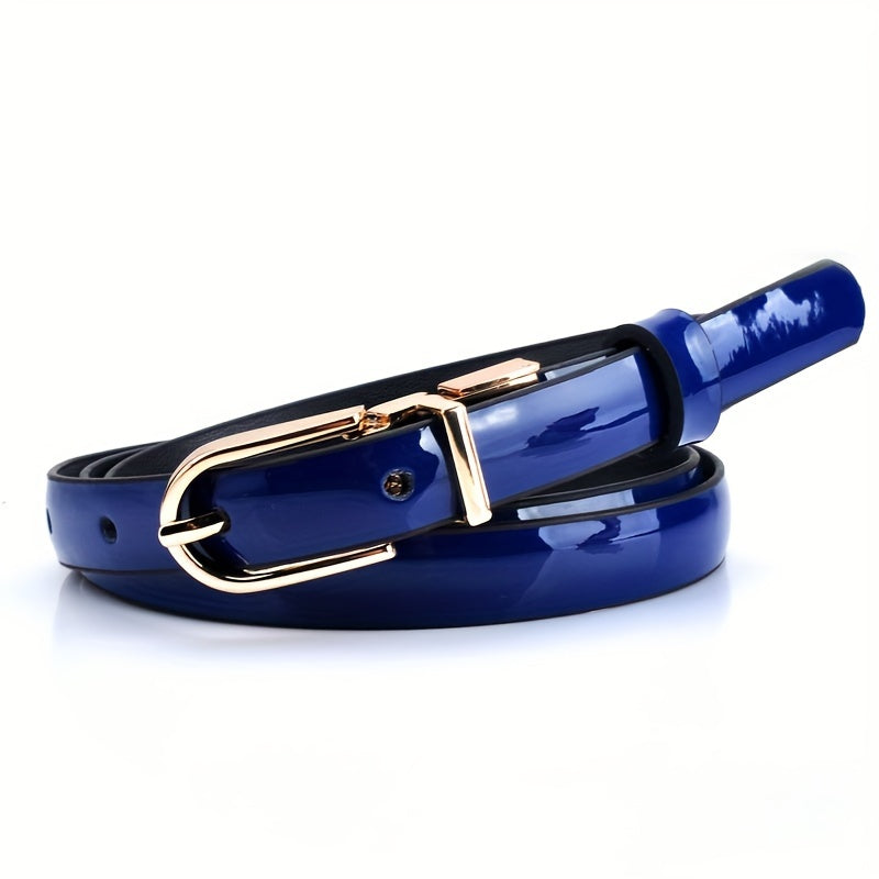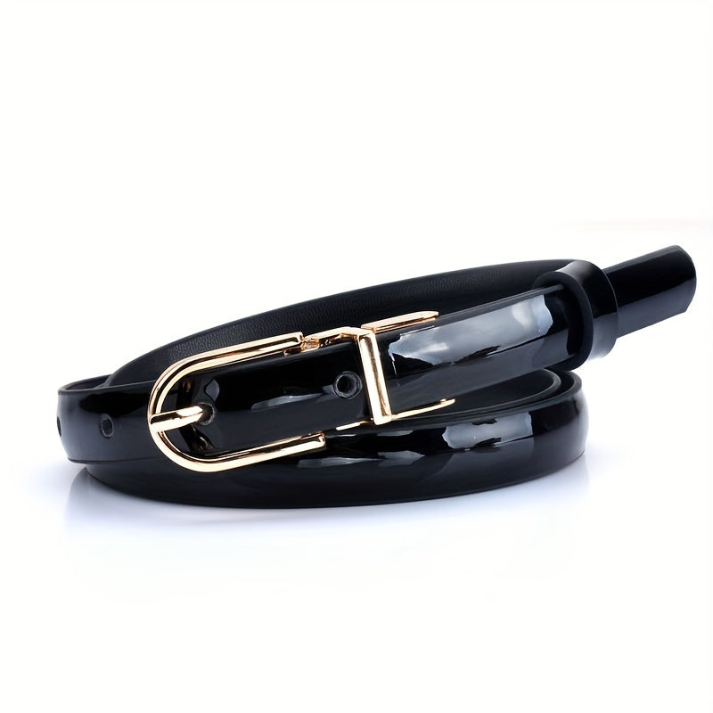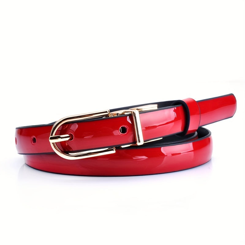 This stylish women's belt features a skinny design, patent leather material, reversible waistband that can be twisted to convert and worn on both sides, and a golden buckle.