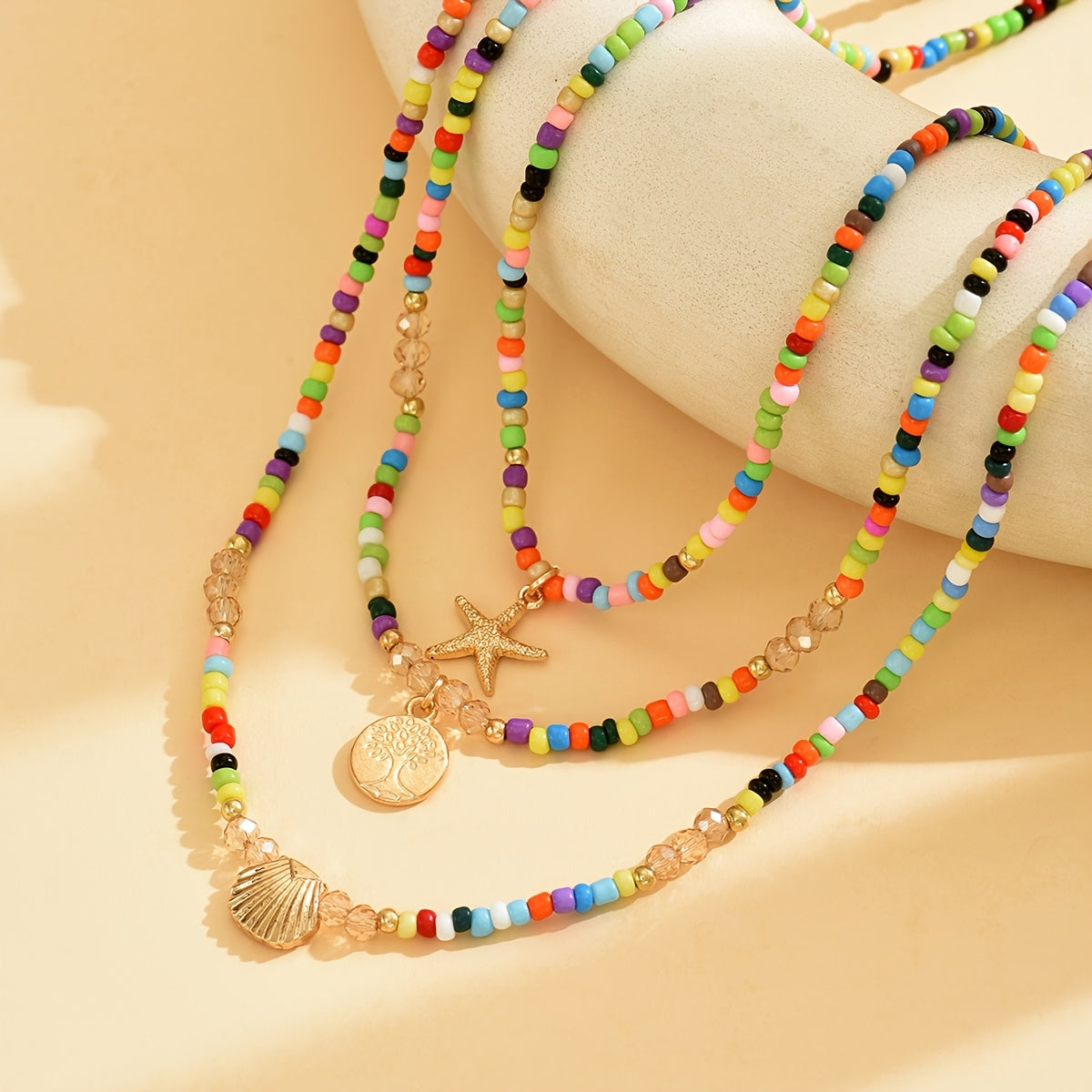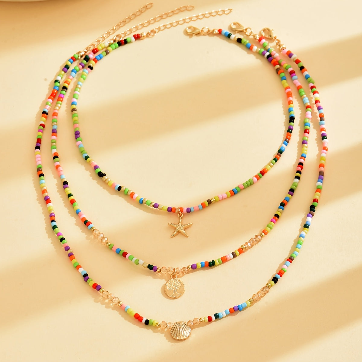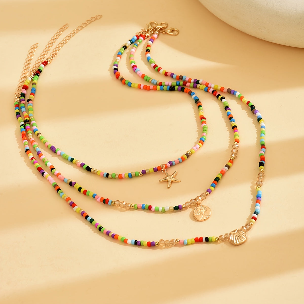 3pc Boho Glass Bead Necklaces Set with Starfish & Shell Pendants