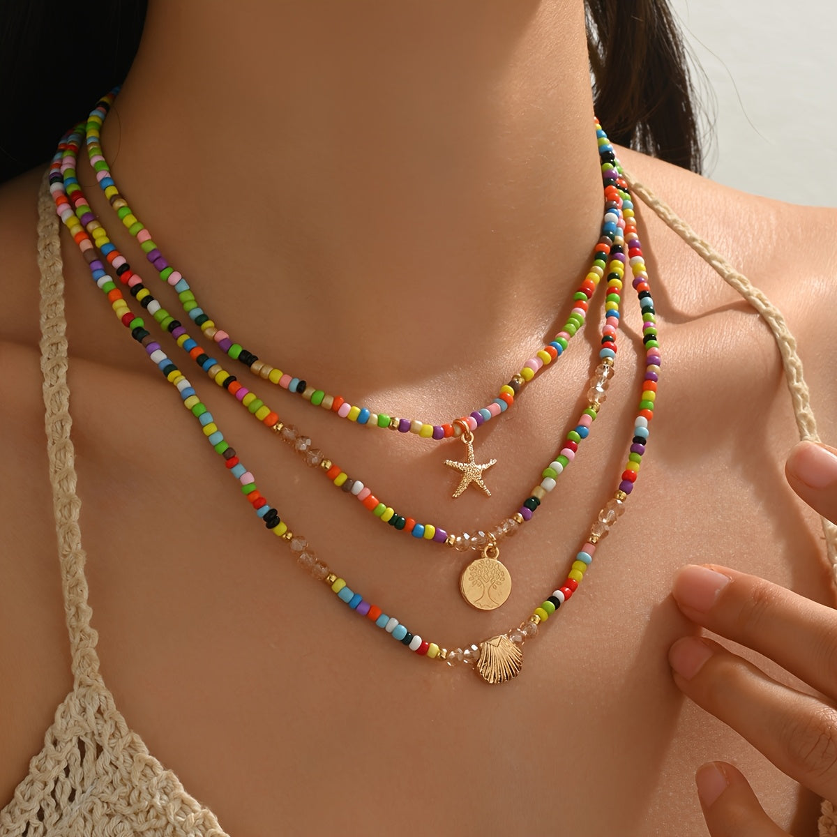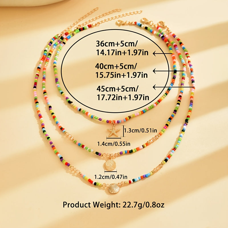 Add a pop of color with this 3-piece boho necklace set featuring multicolor glass seed beads and charming starfish and shell pendants. Perfect for beach vacations or casual outfits.