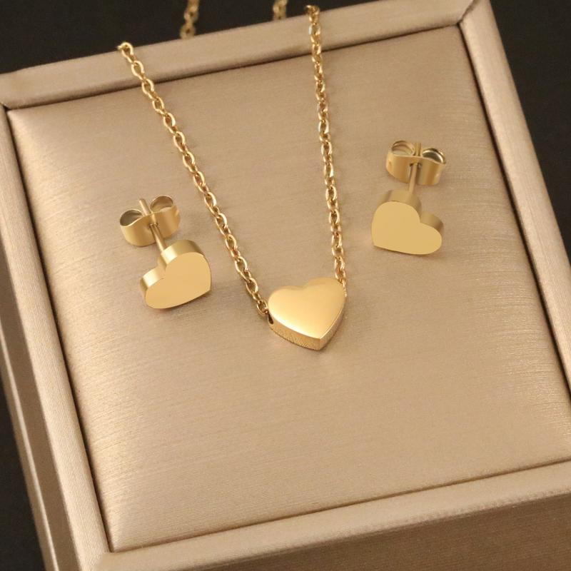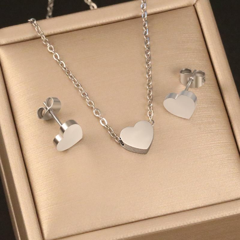 Elegant stainless steel jewelry set perfect for special occasions. Features heart pendant necklace and matching earrings. Ideal for banquets, parties, vacations, dates, and concerts.