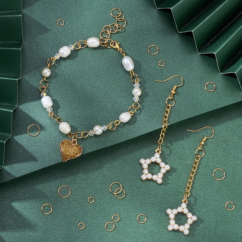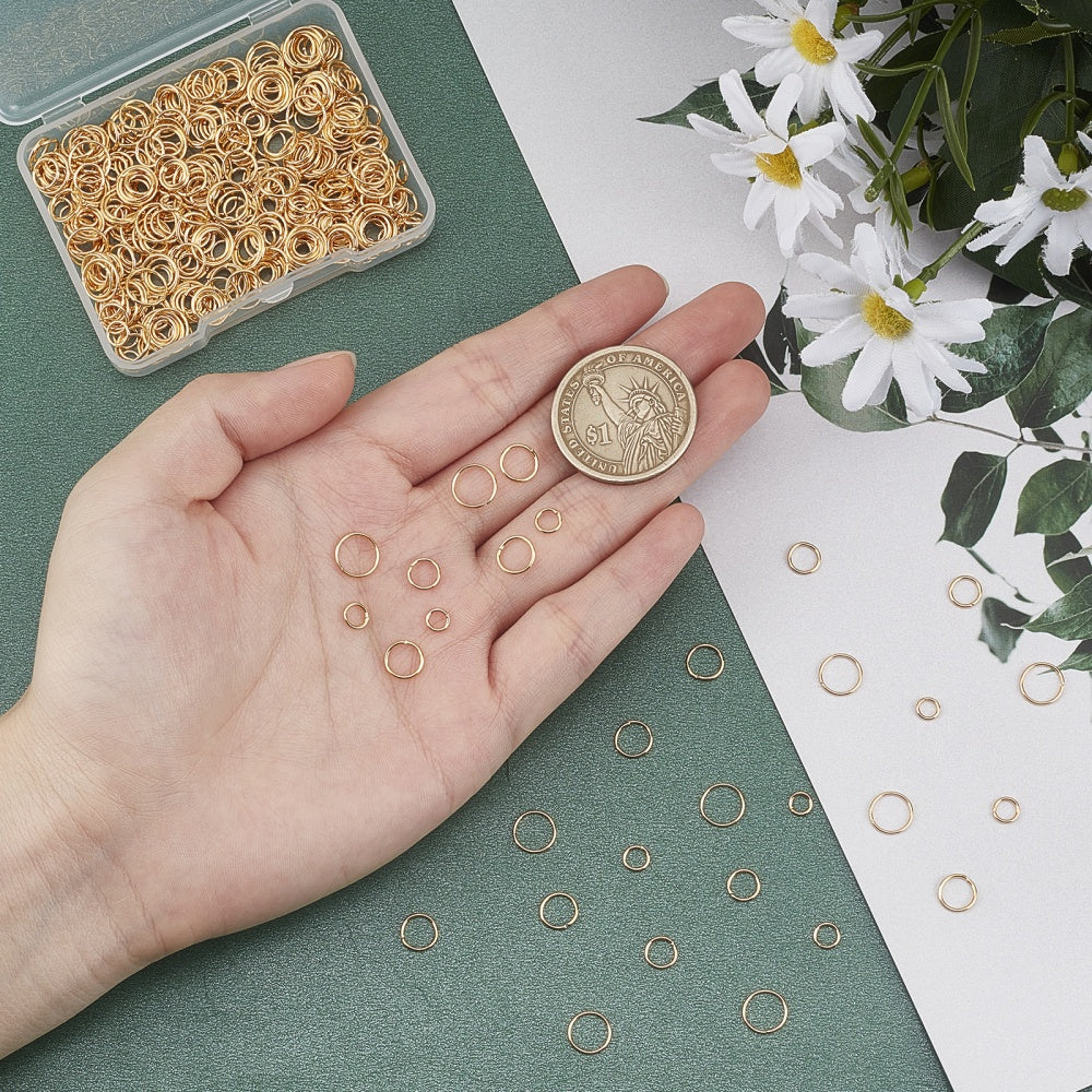 This pack includes 500 long-lasting plated round brass open jump rings in 5 styles, perfect for creating earrings, necklaces, bracelets, and keychains.