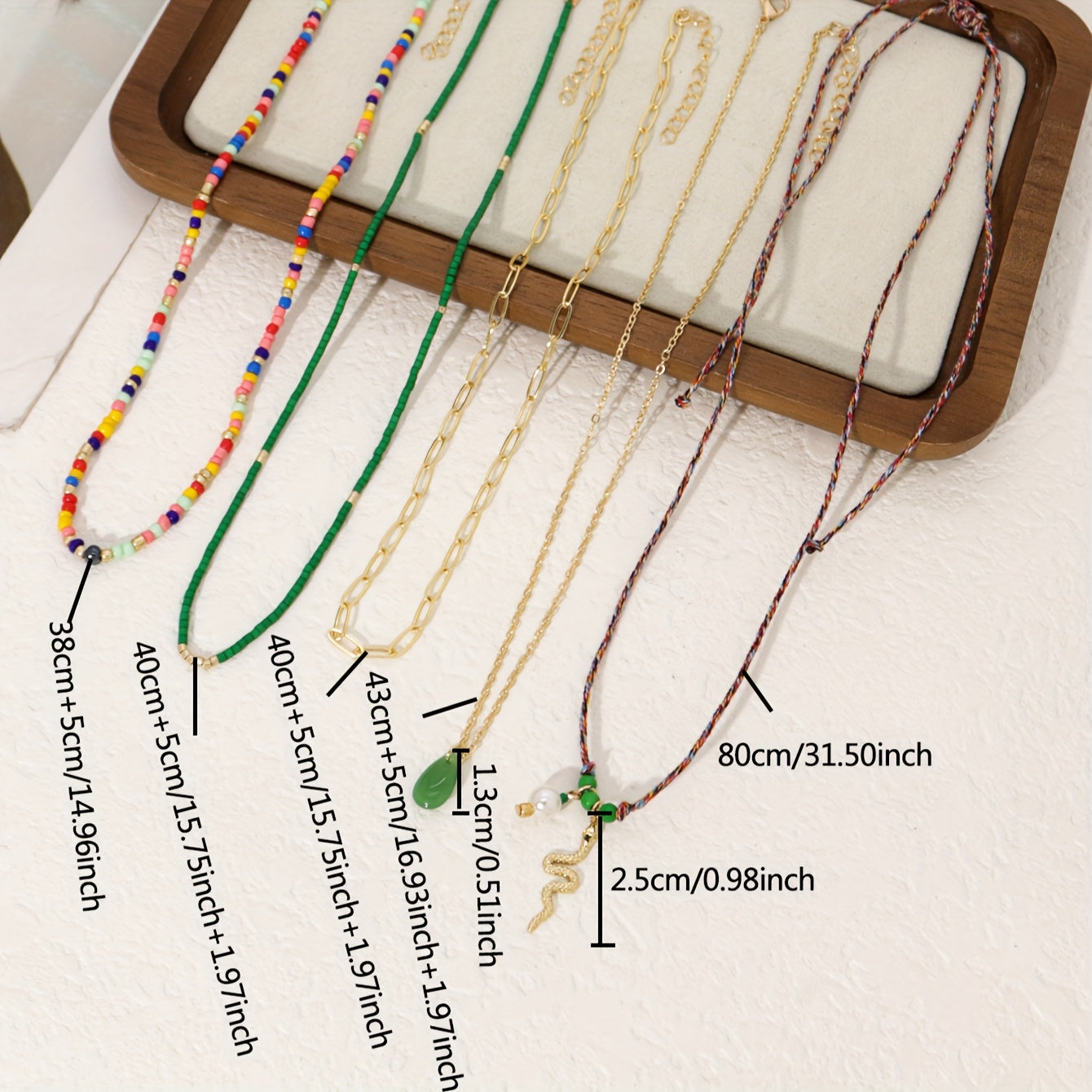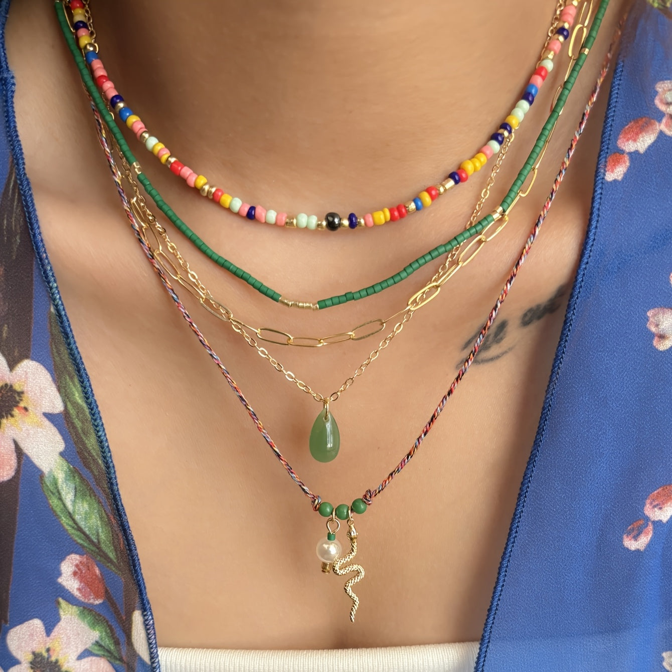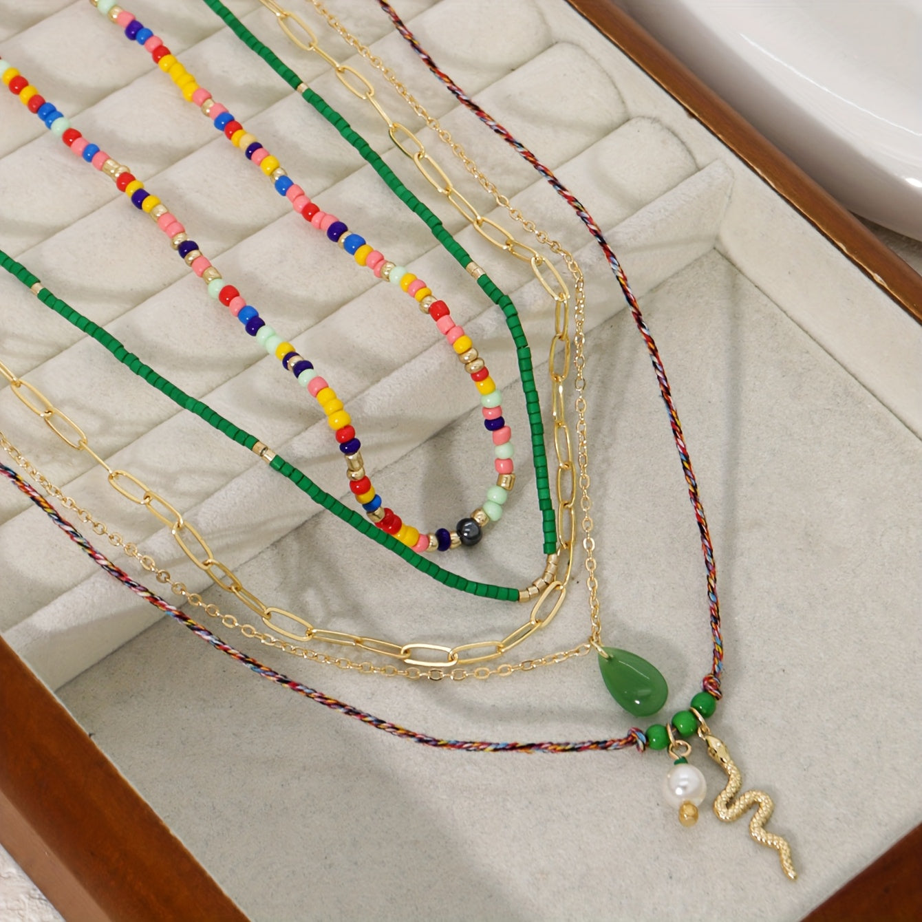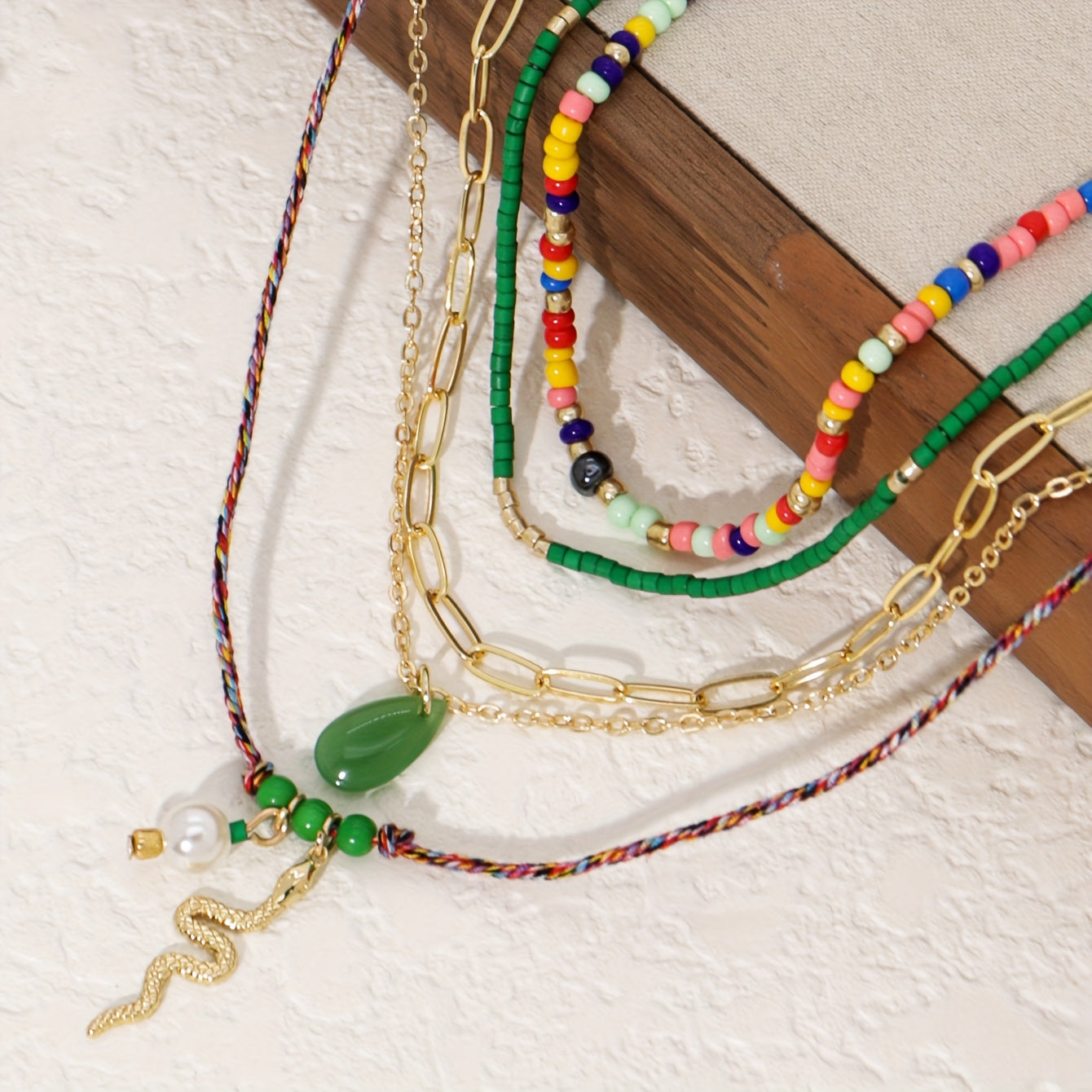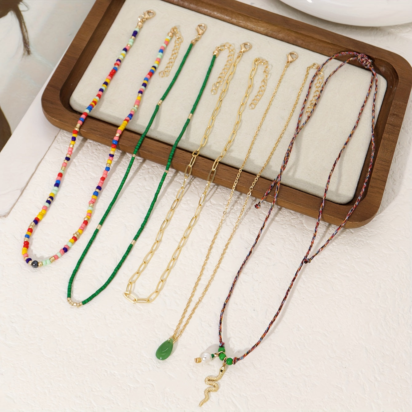 Add a touch of style to your festive and vacation outfits with this set of 5 women's necklaces featuring ethnic snake pendant designs and beaded strands. Perfect for accessorizing with a chic and unique flair.