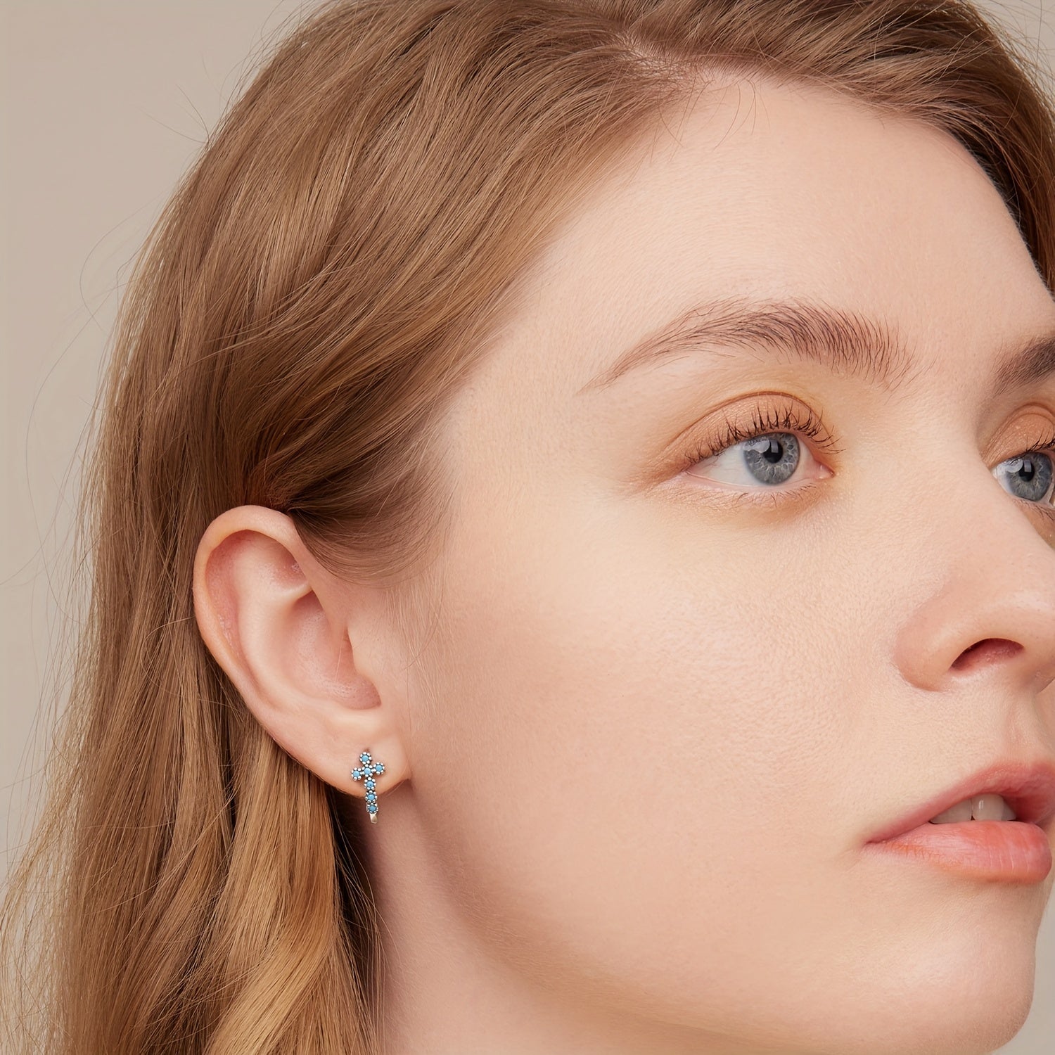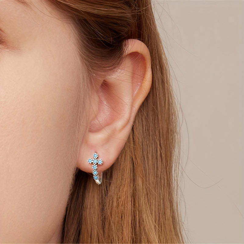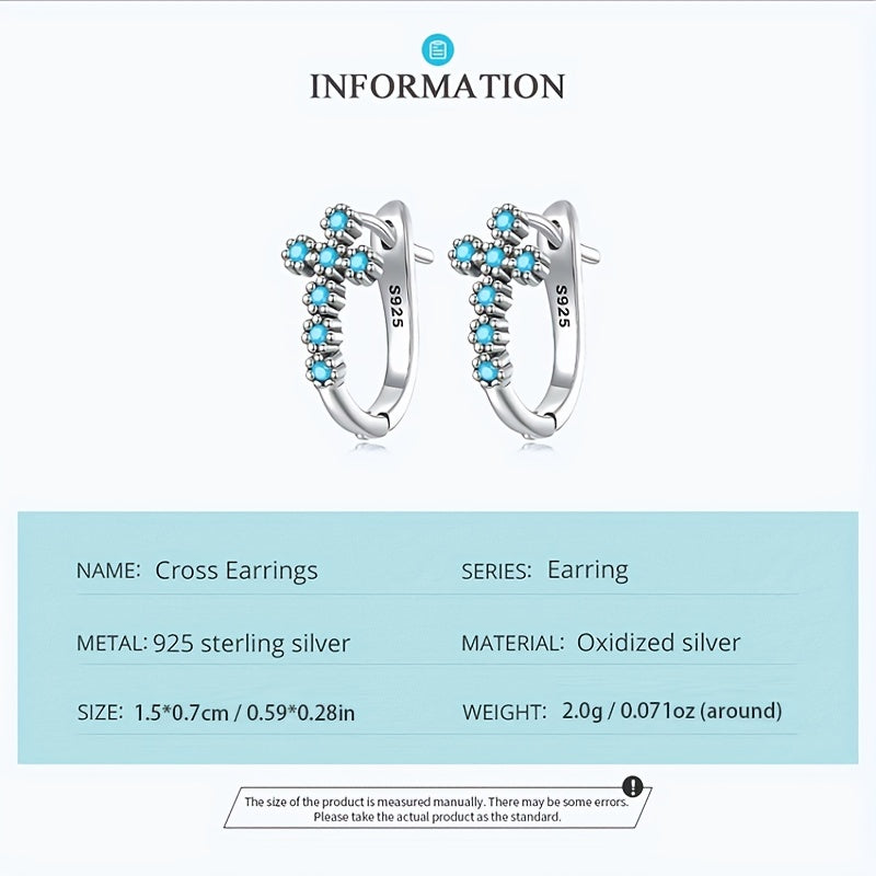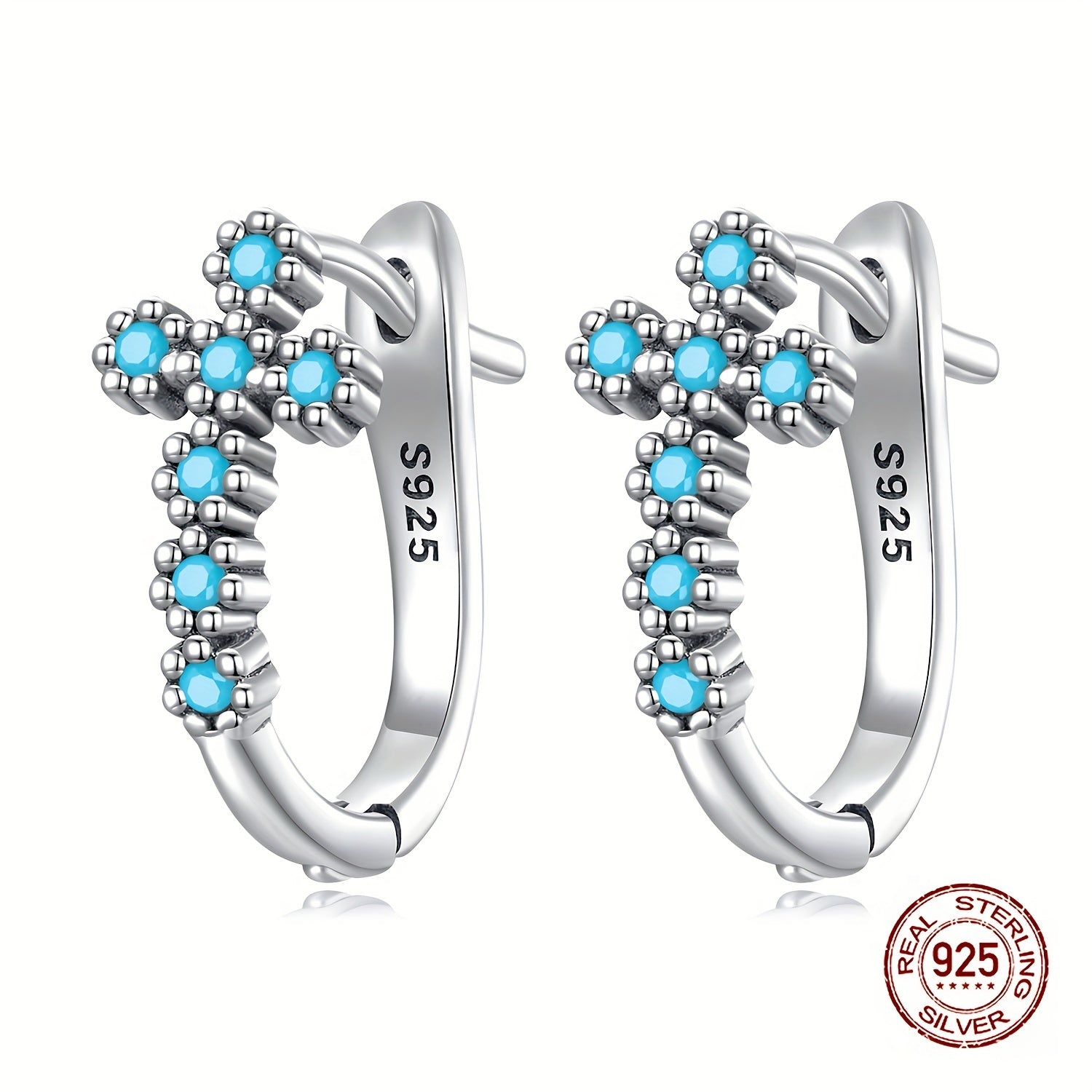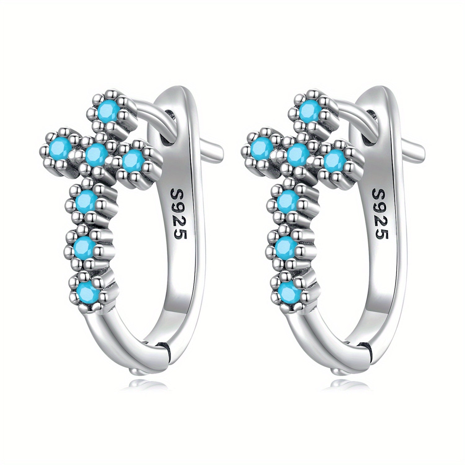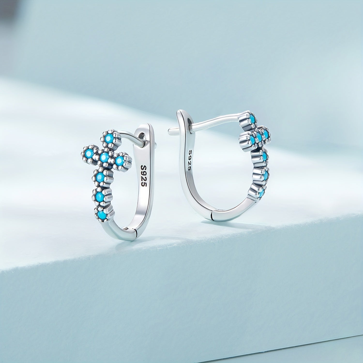 925 Silver Cross Pattern Turquoise Hoop Earrings Bohemian Style