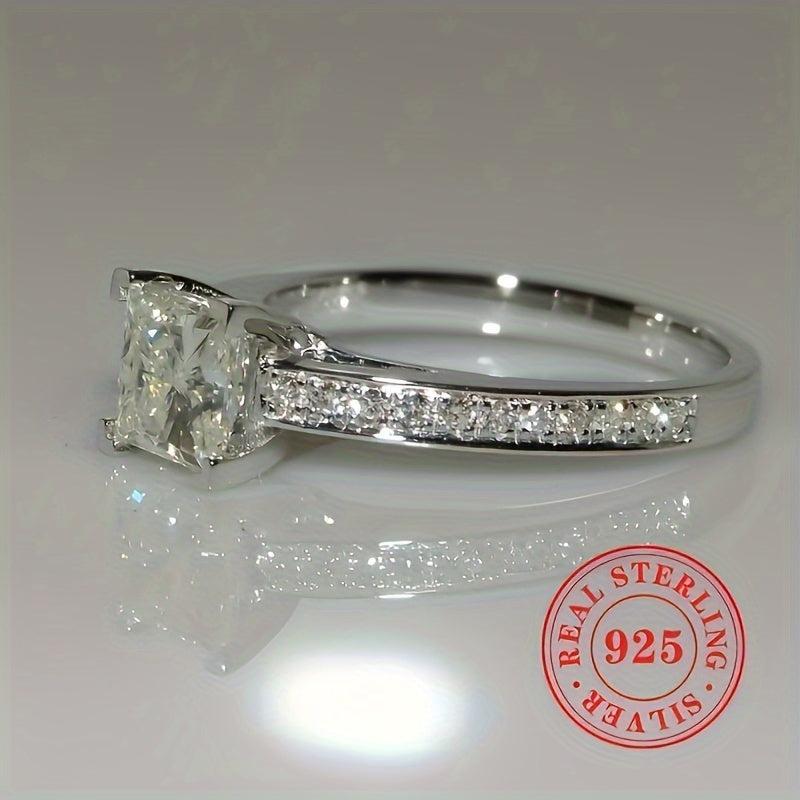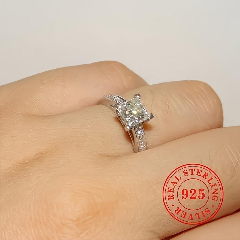 Elegant 925 sterling silver ring featuring a classic 4 prong setting with a princess square cut synthetic zirconia stone, perfect for proposals and weddings.