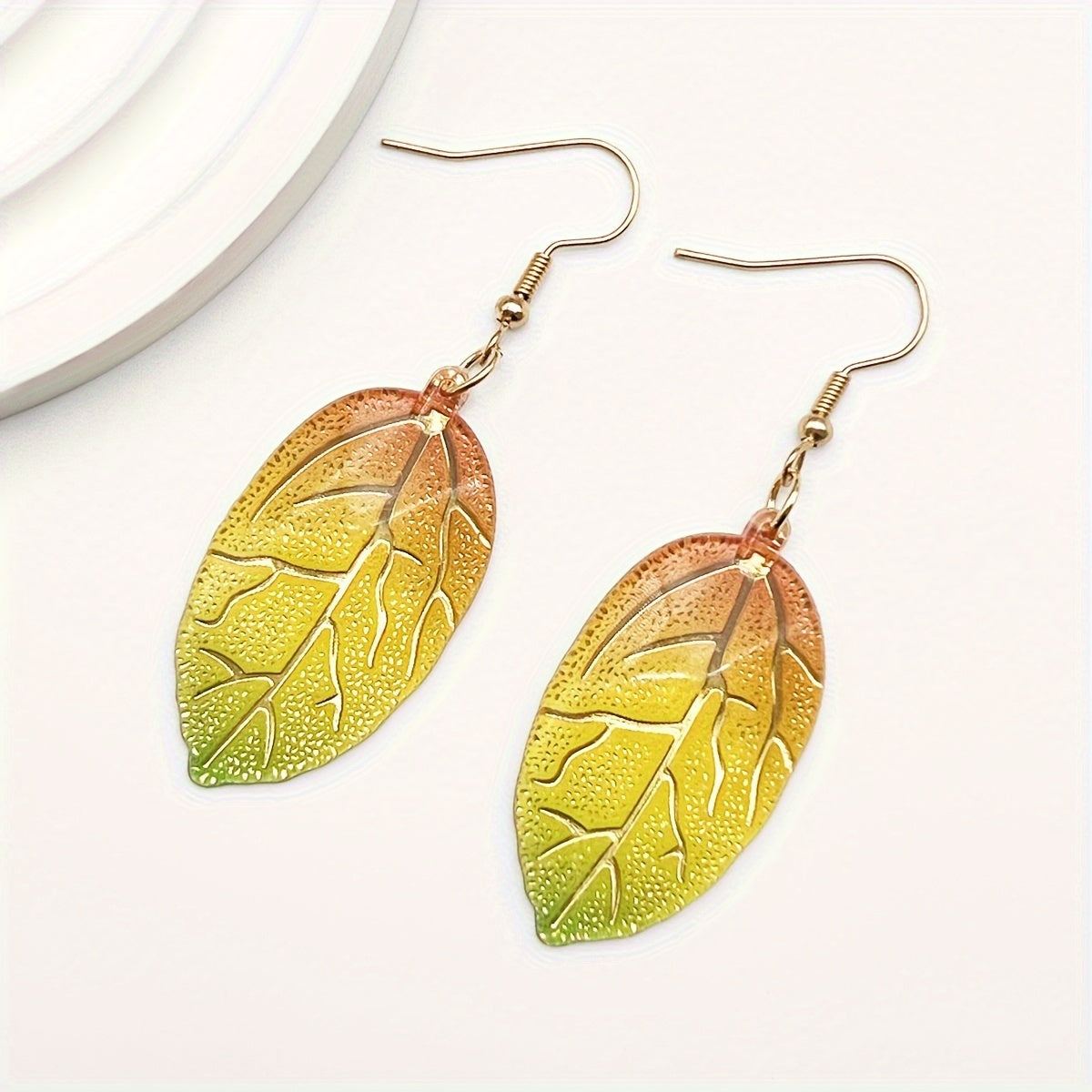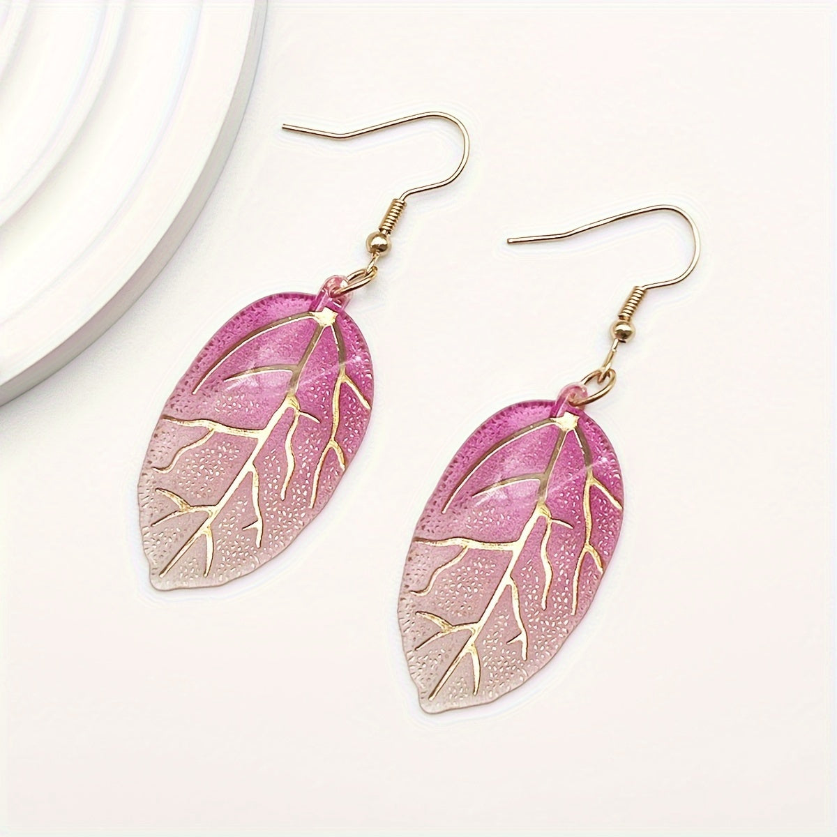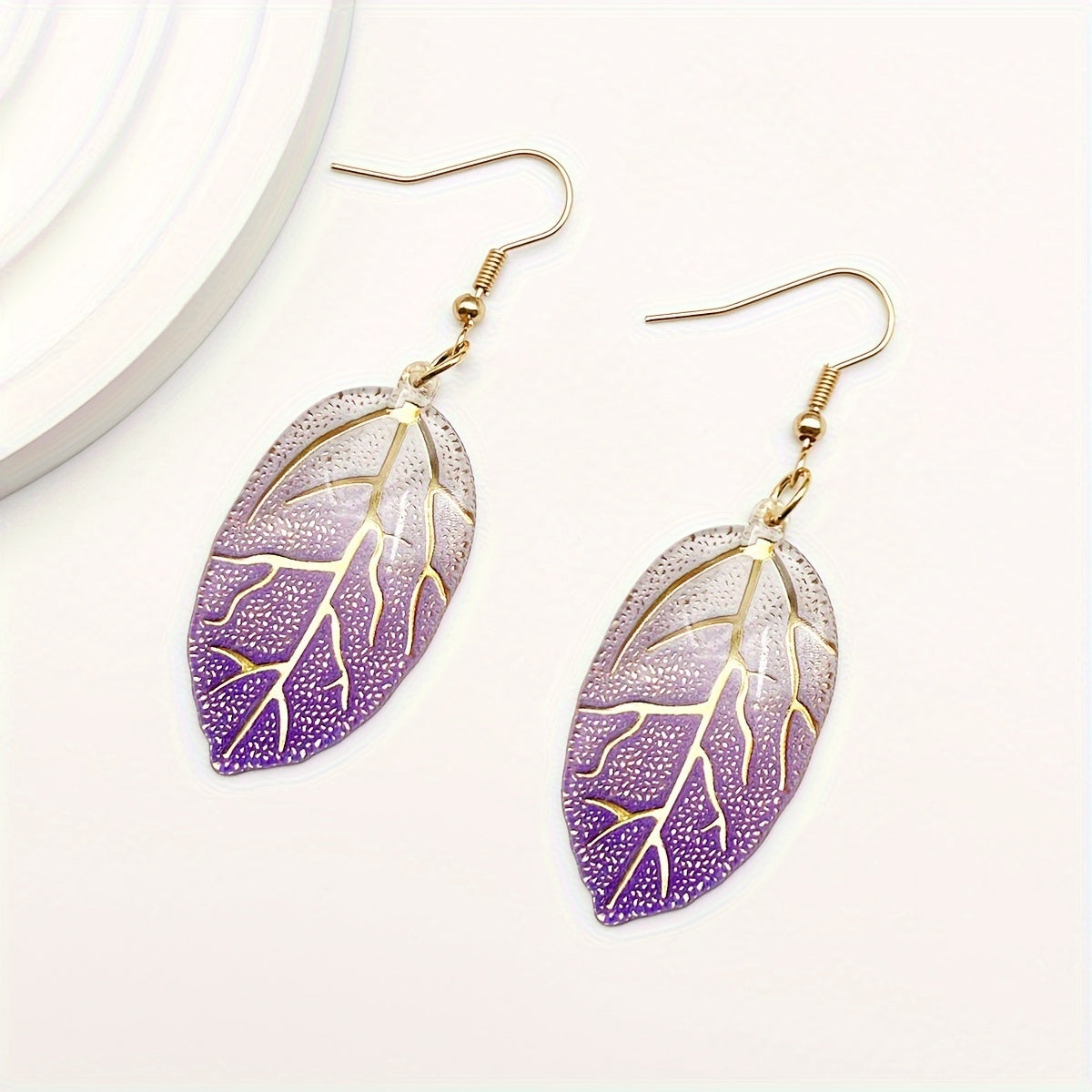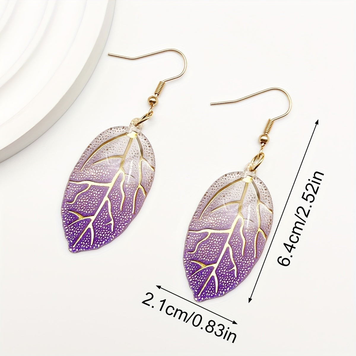 Add a touch of bohemian flair to your outfit with these vibrant acrylic leaf earrings. The gradient colors and golden accents make them a stylish and eye-catching accessory for any occasion.