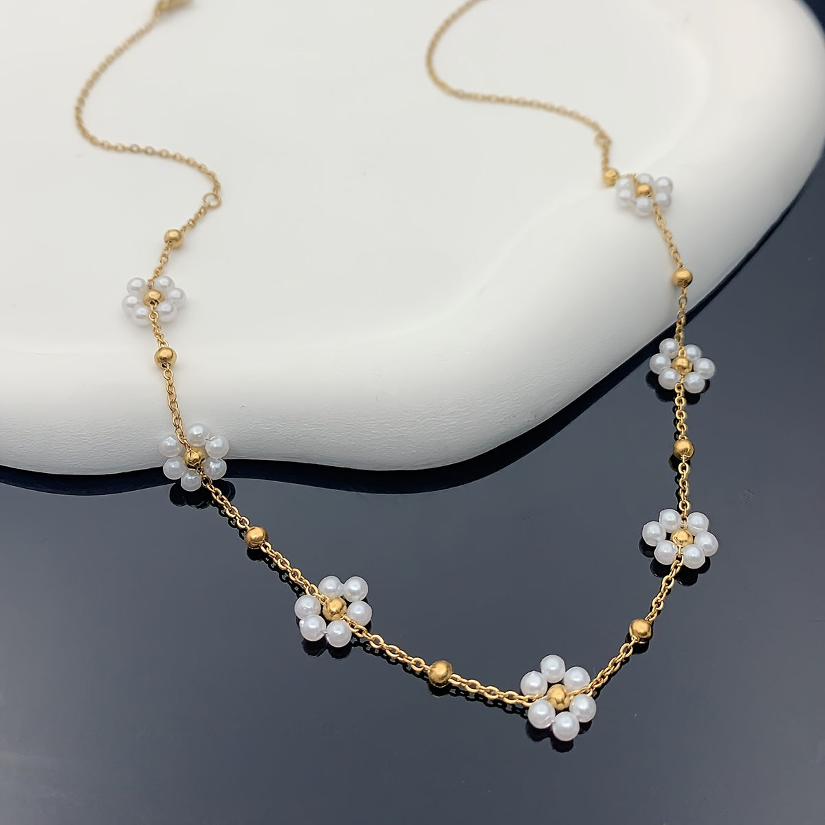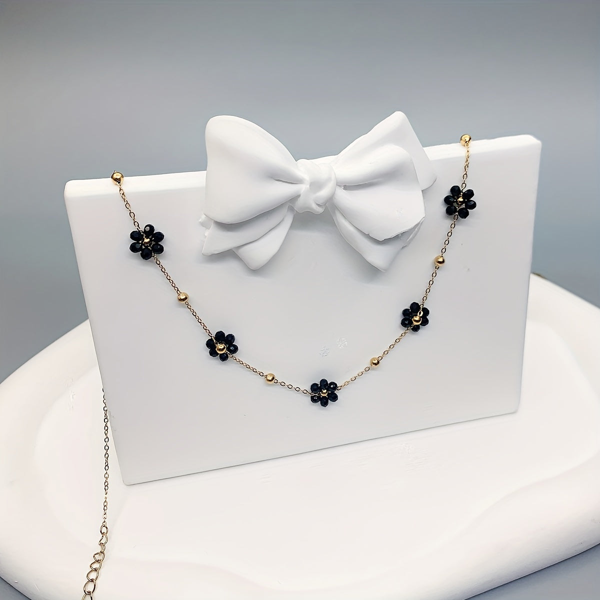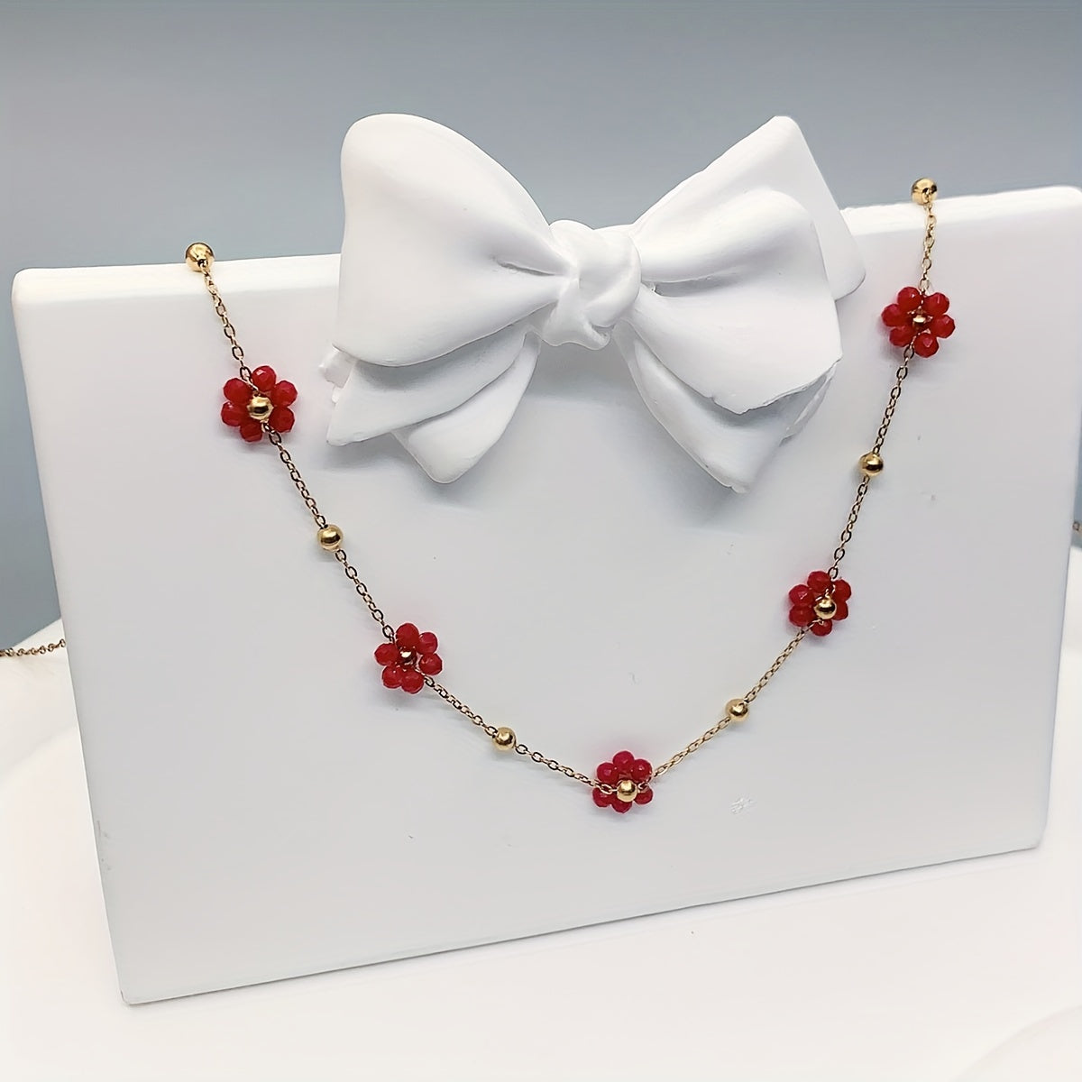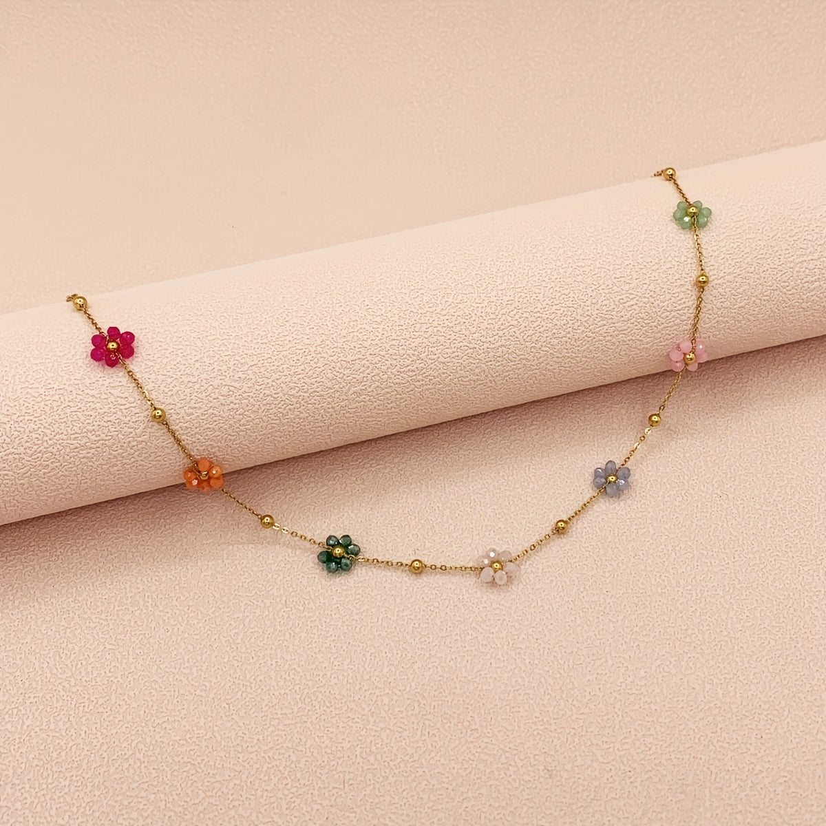 This Bohemian flower necklace features a colorful beaded synthetic stone pendant on a golden tone chain. Perfect for weddings, parties, or casual attire with a bohemian flair.