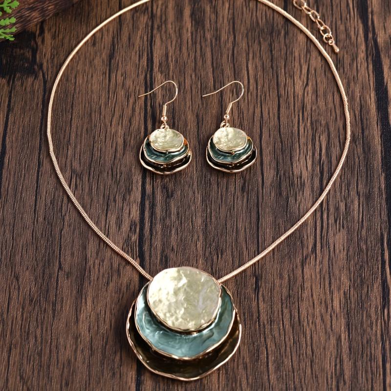 Elegant and stylish Bohemian three-layer zinc alloy jewelry set with necklace and earrings, perfect for ladies and girlfriends to wear at holiday parties.