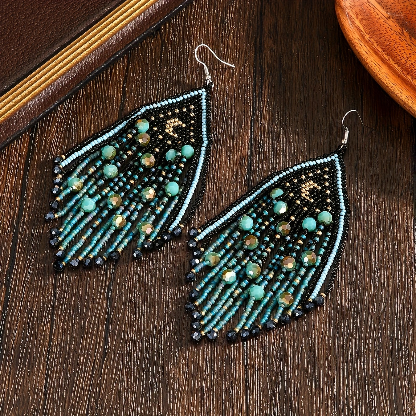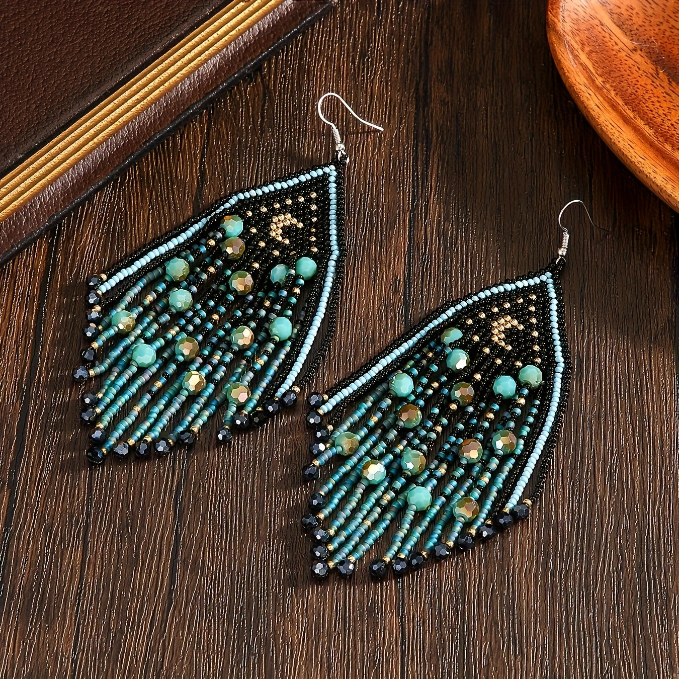 Elevate your casual attire with this pair of women's tassel earrings featuring a bohemian starry moon pattern. Hand-woven with artificial glass rice beads, these earrings are perfect for adding a touch of sophistication to your outfit.