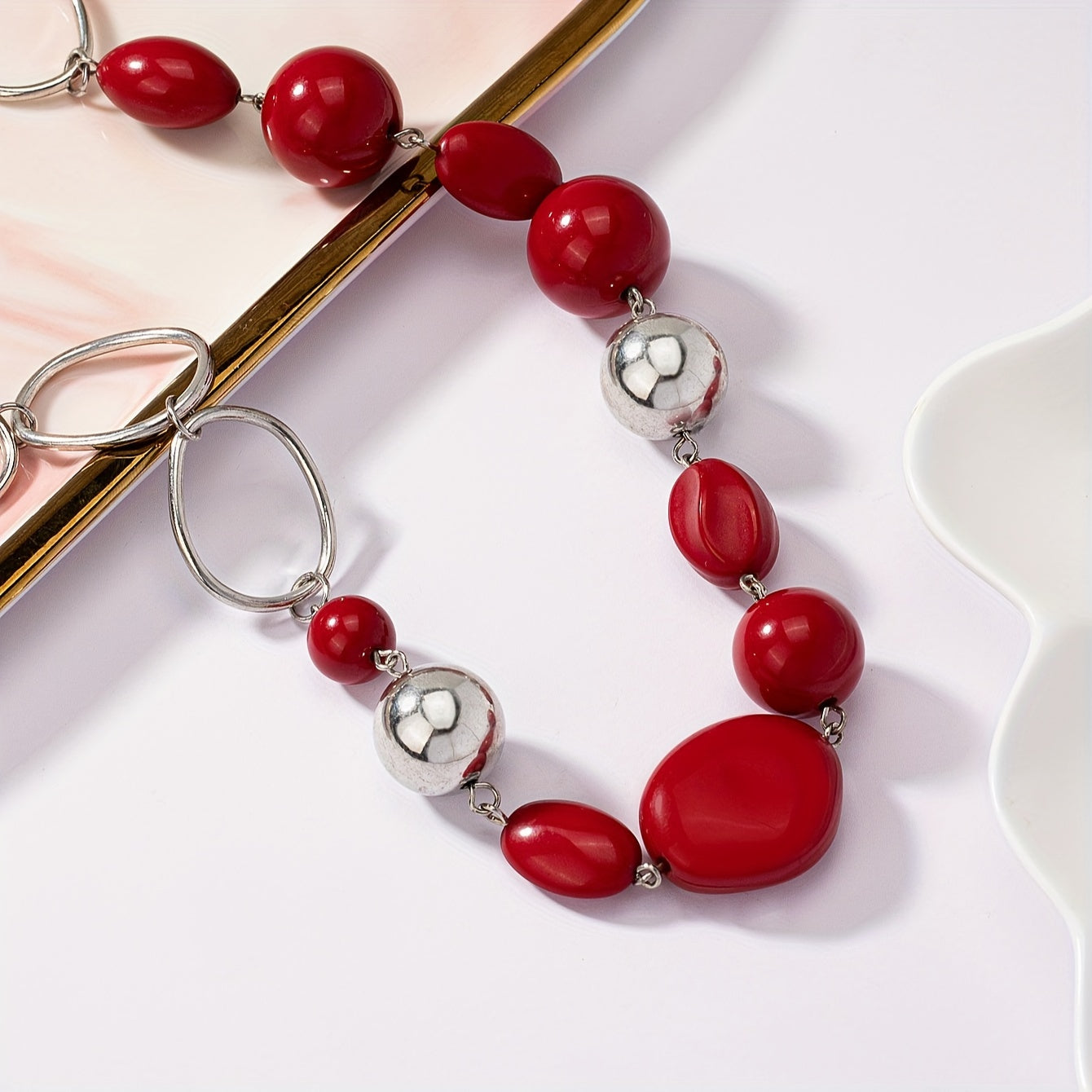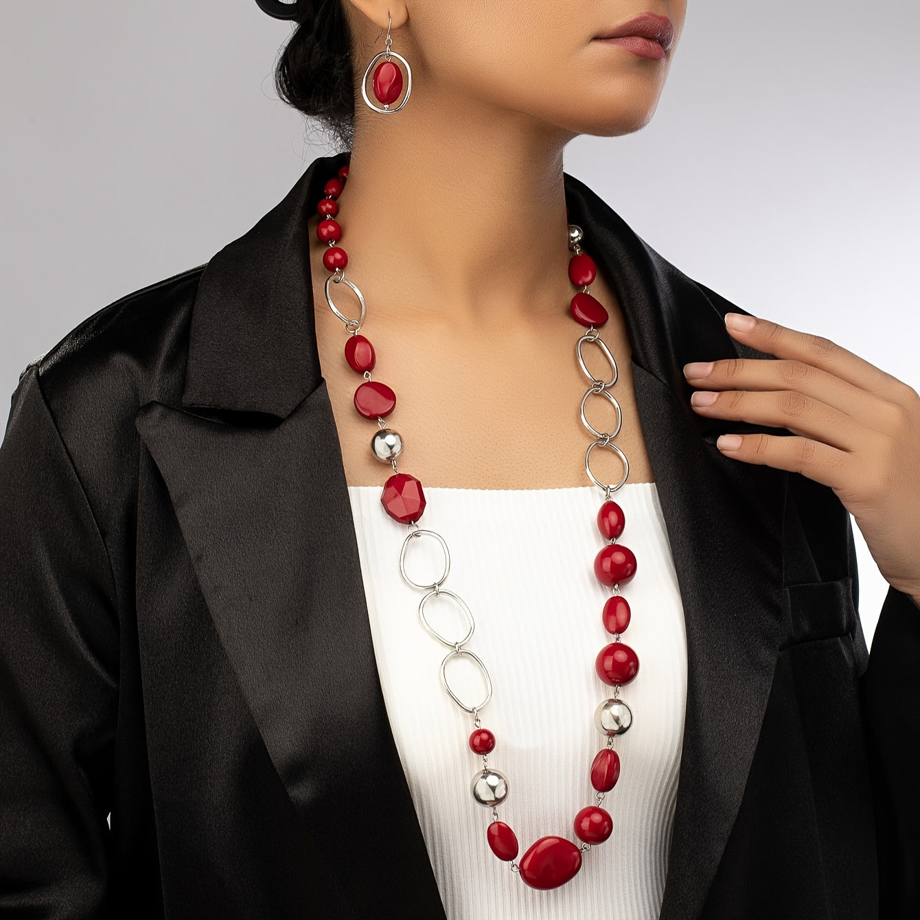 Elevate your style with this vintage bohemian set featuring a red long necklace, sweater chain, and matching earrings.