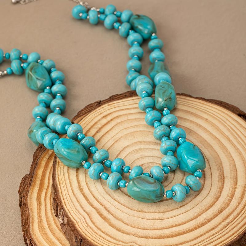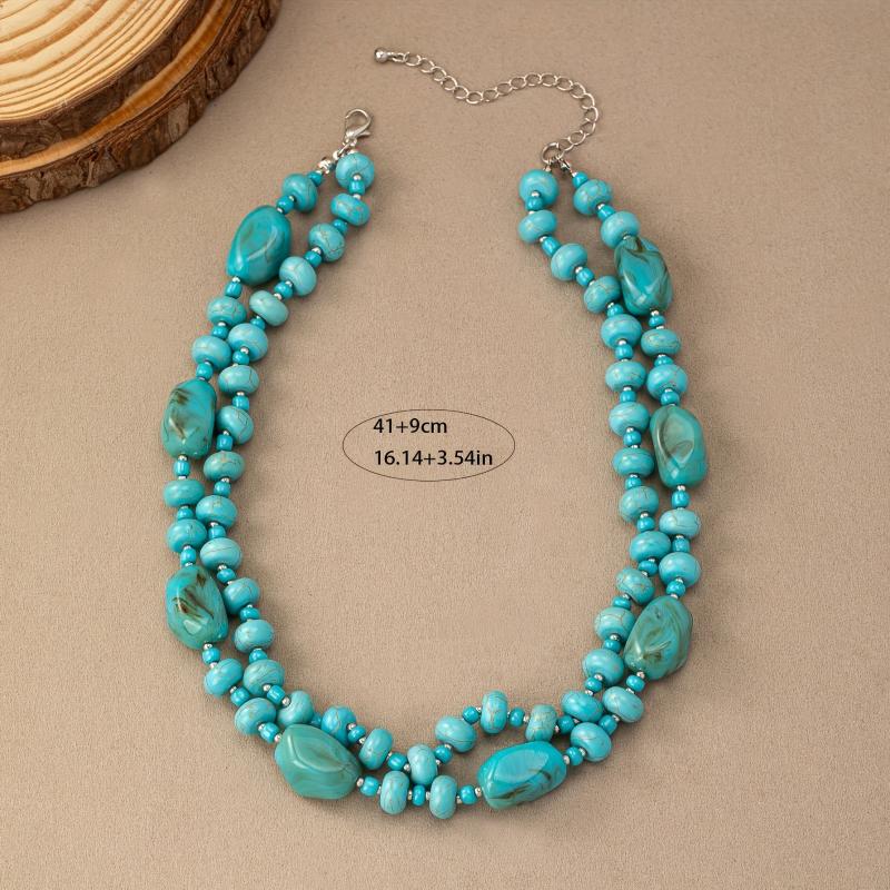 Add a bohemian touch to your outfit with this vintage-inspired double layer necklace featuring irregular turquoise stone beads on lace-inspired chain. Perfect for everyday wear or as a thoughtful gift for women.