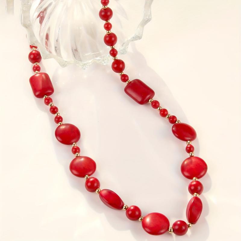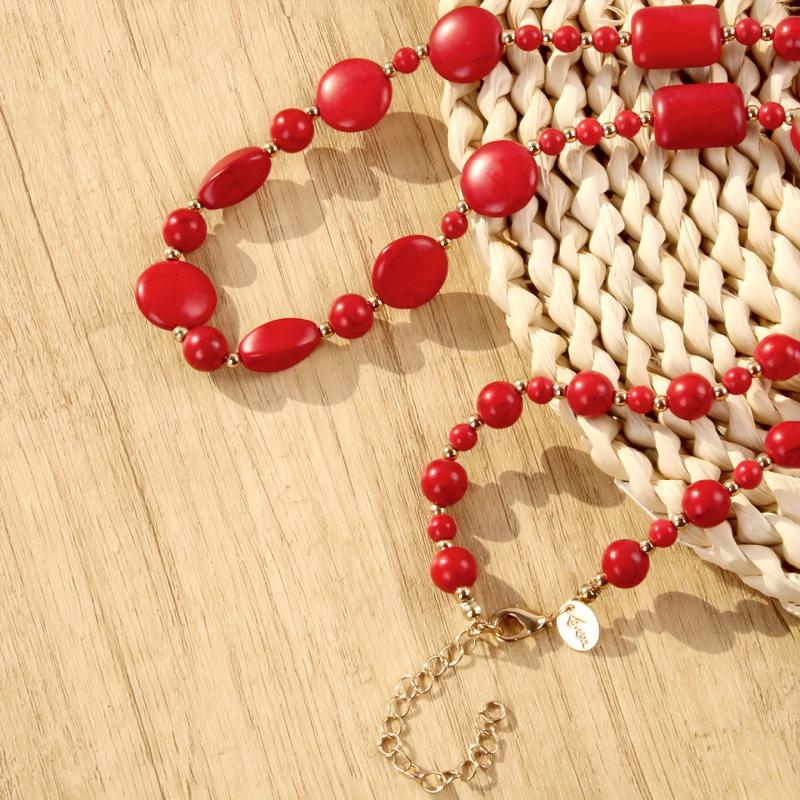 Embrace your bohemian style with this vibrant shell necklace that resembles the beauty of red turquoise. Perfect accessory for summer.