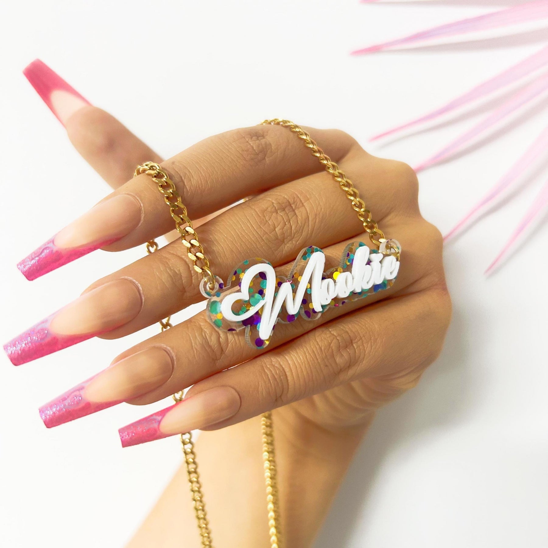 Fügen Sie Ihrem Outfit mit dieser personalisierten Acrylnamenkette einen Farbtupfer mit Paillettennamen und einem herzförmigen Lace Decor-Anhänger hinzu.