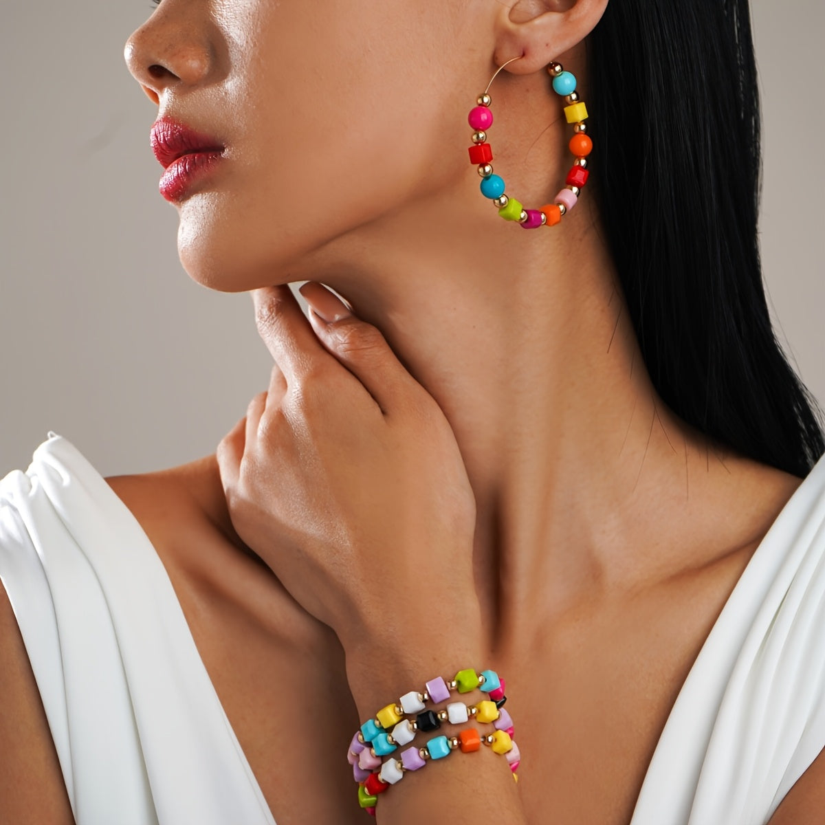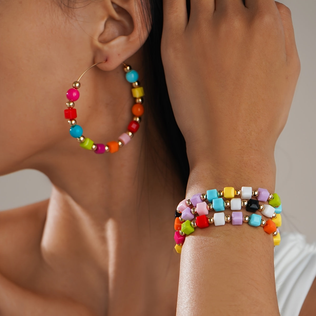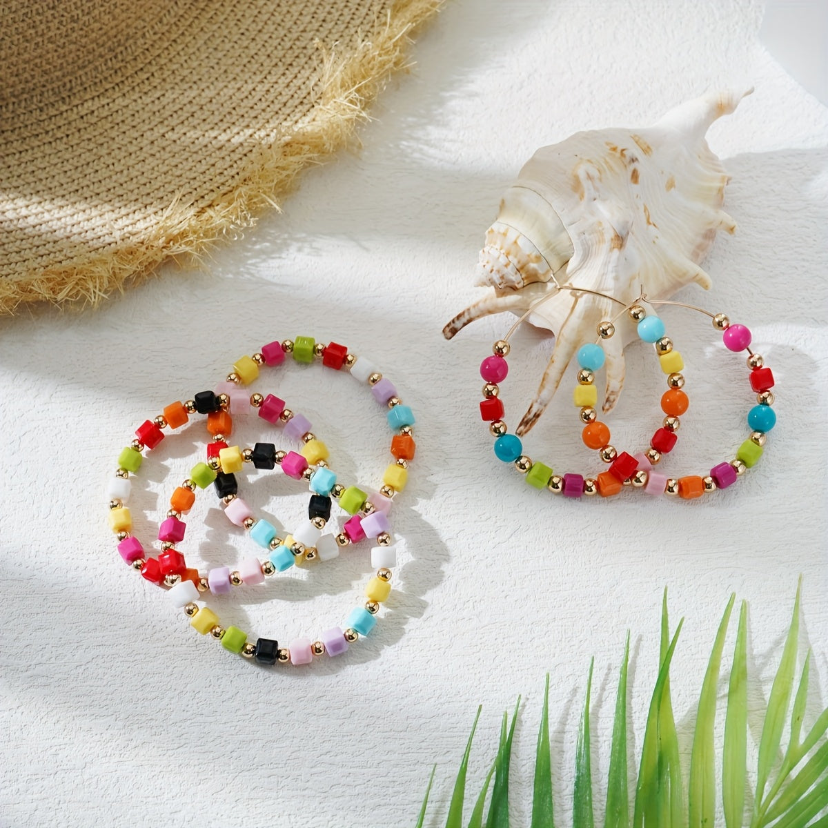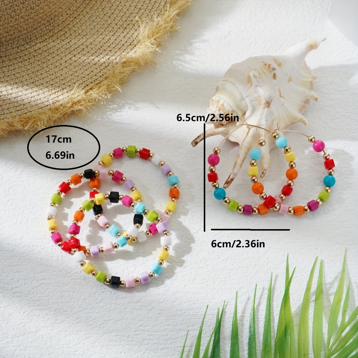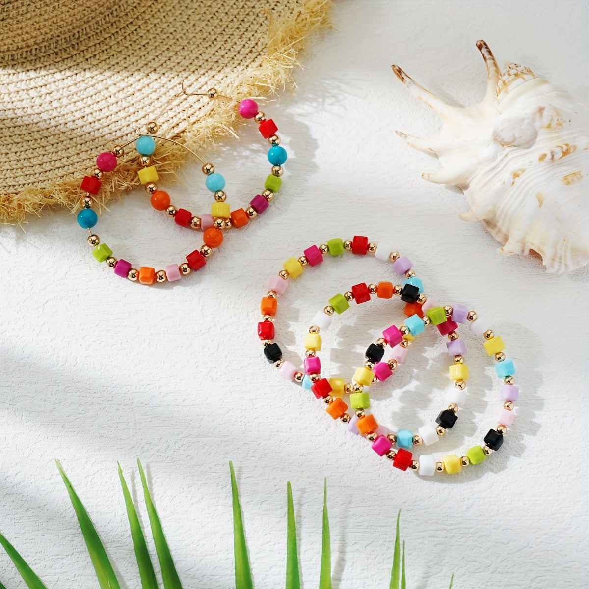 Complete your daily look with this set of colorful geometric round beads cube earrings and elastic bracelets. Includes 1 pair of earrings and 3 bracelets.