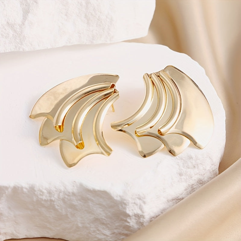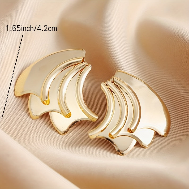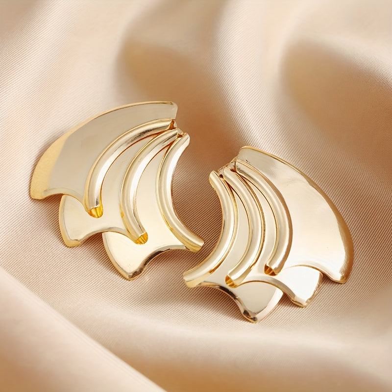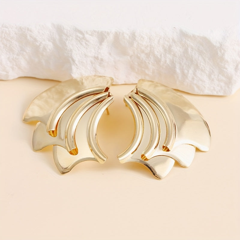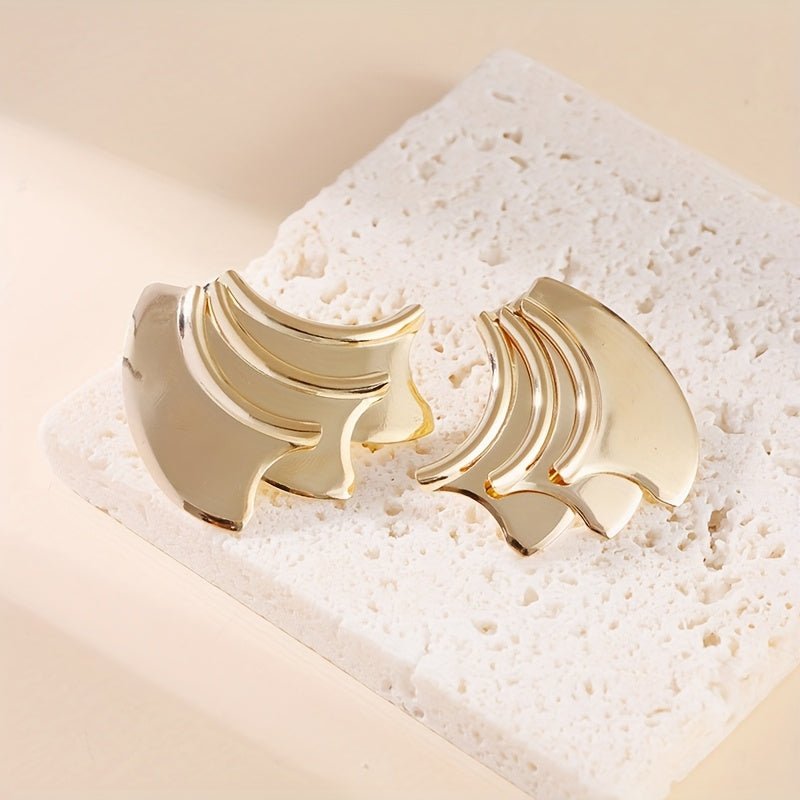 Geometric Leaf Textured Earrings Bold Retro Heavy Metal Golden Tone Studs