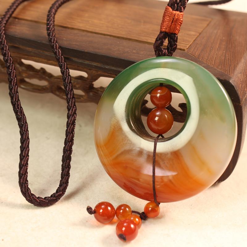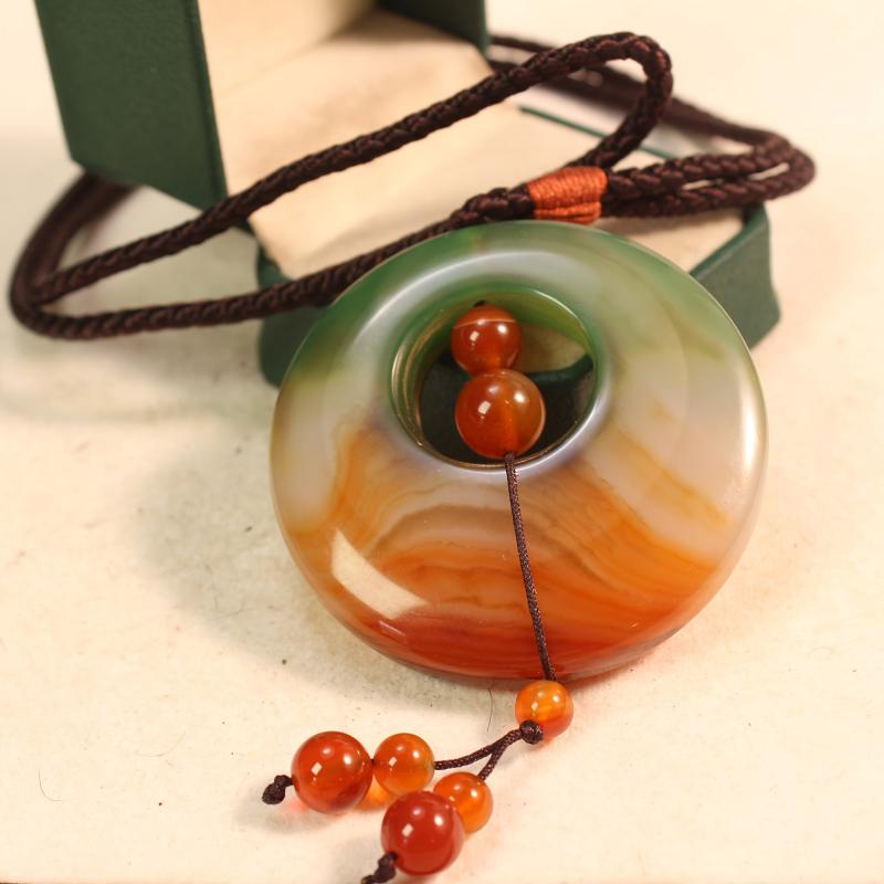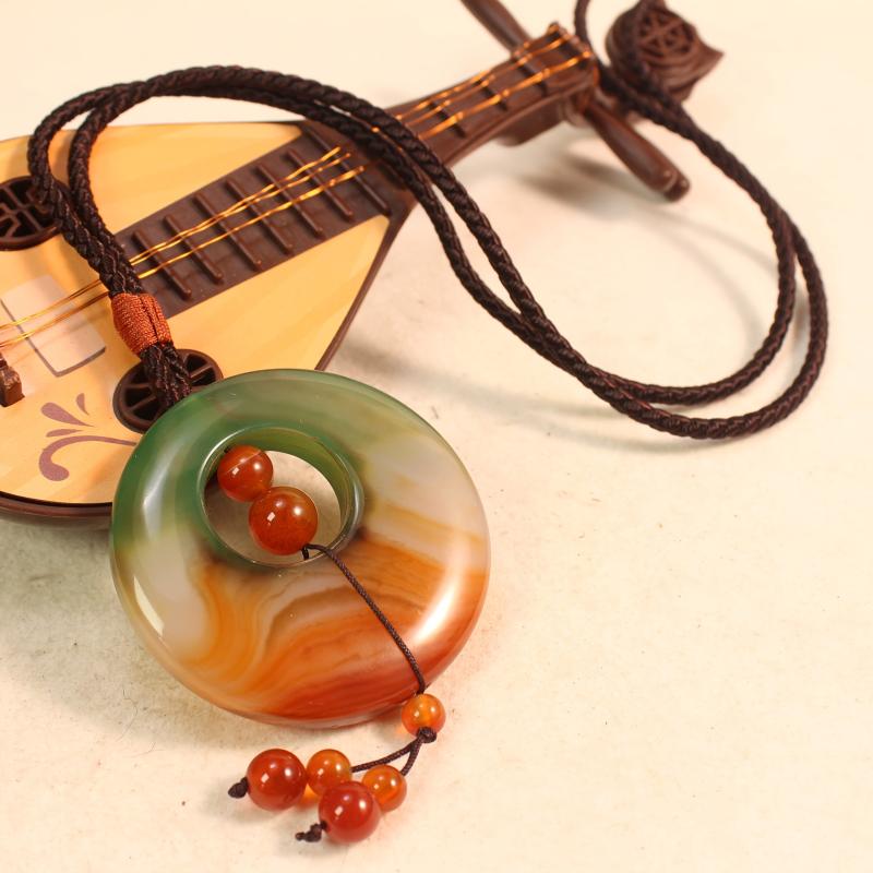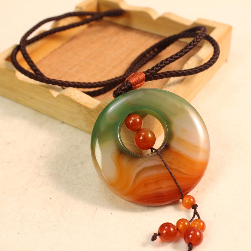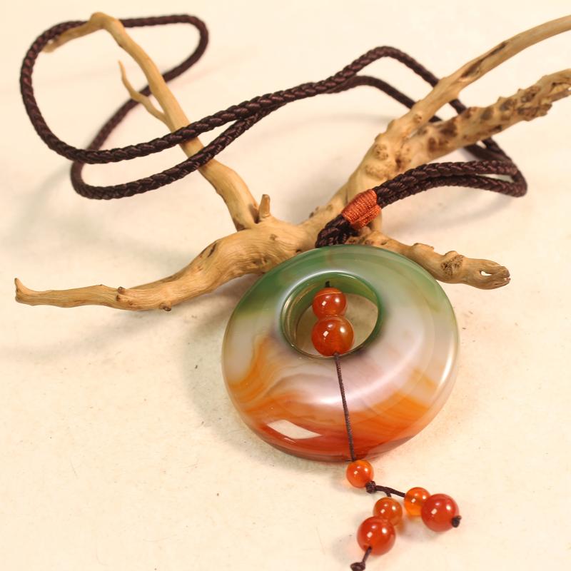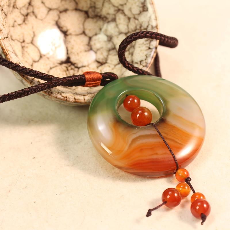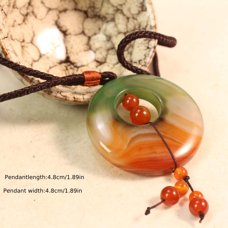 Elevate your look with this stunning natural agate pendant necklace featuring a beautiful gradient of green to orange brown tones. The pendant is braided for added style and elegance.