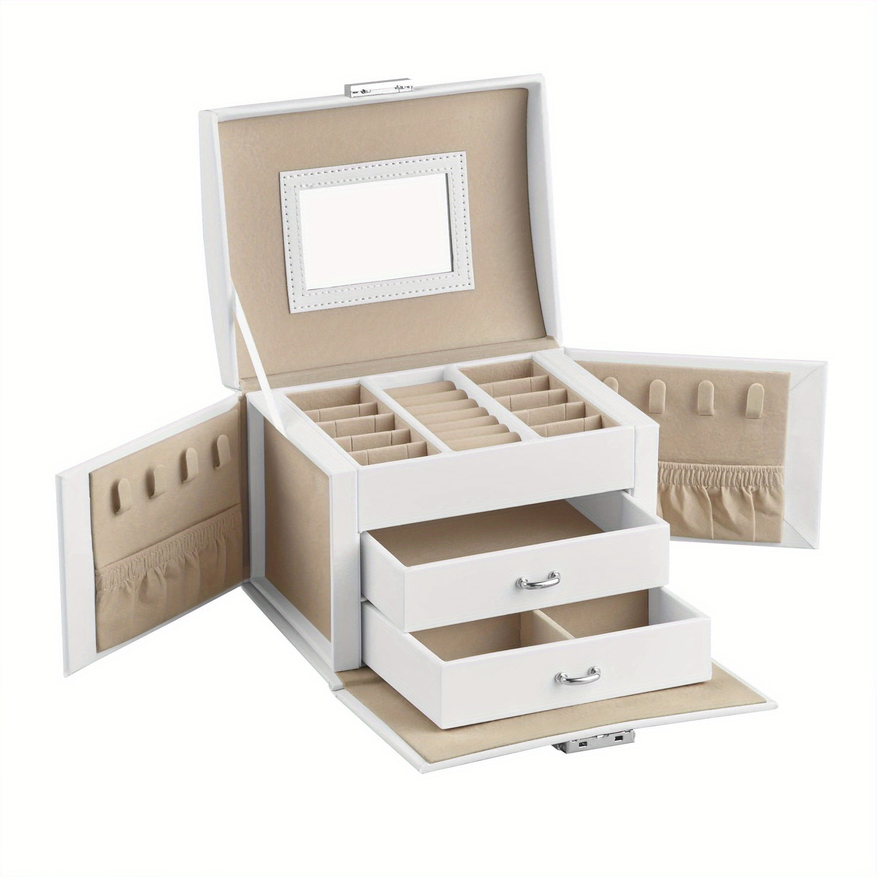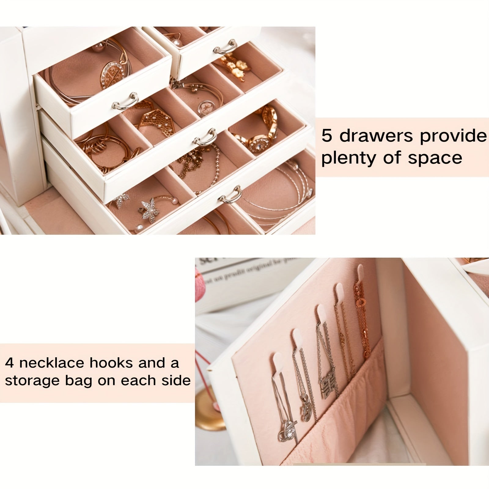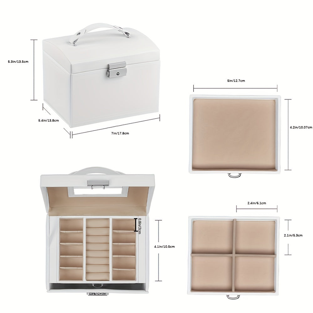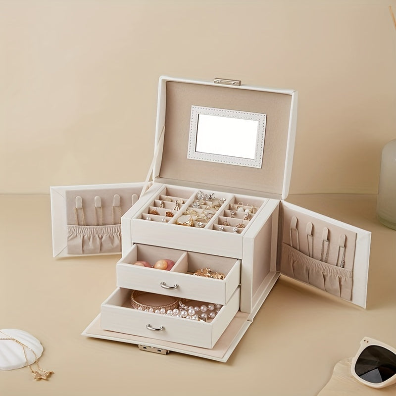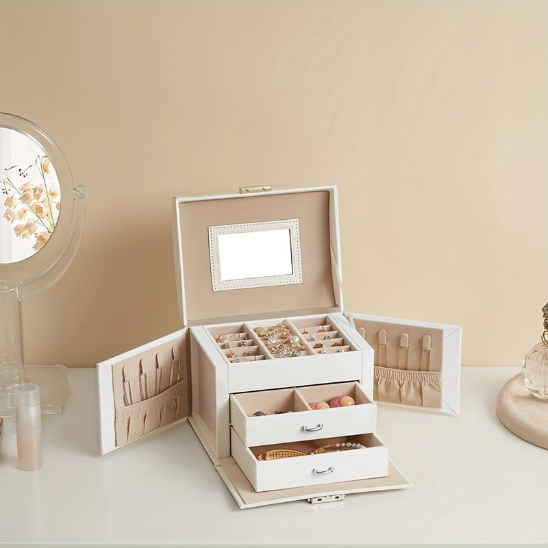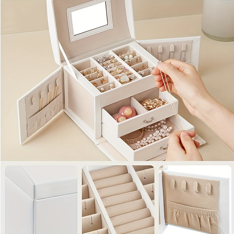 Organize your jewelry with this multifunctional storage box that features multiple layers and a built-in mirror. Perfect for keeping earrings, bracelets, rings, and necklaces in one place.