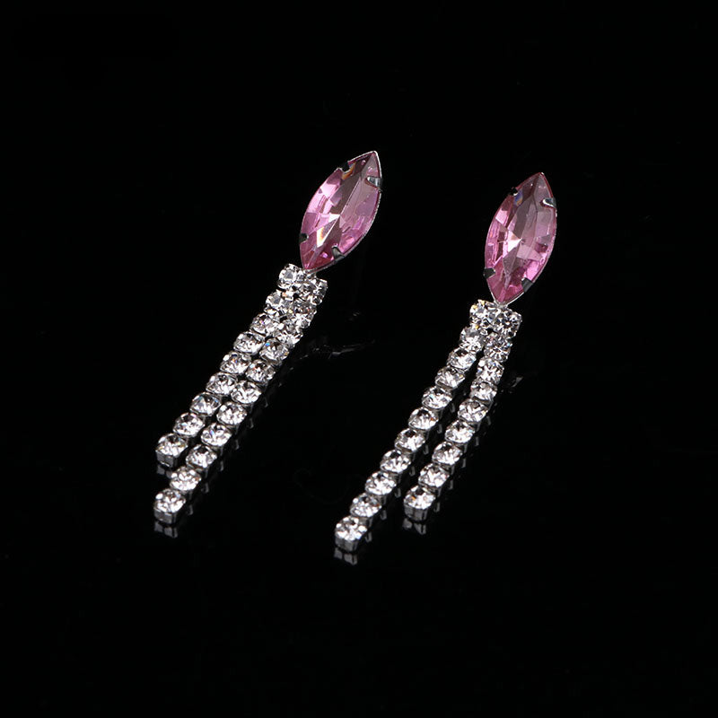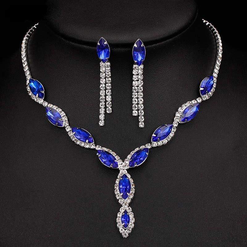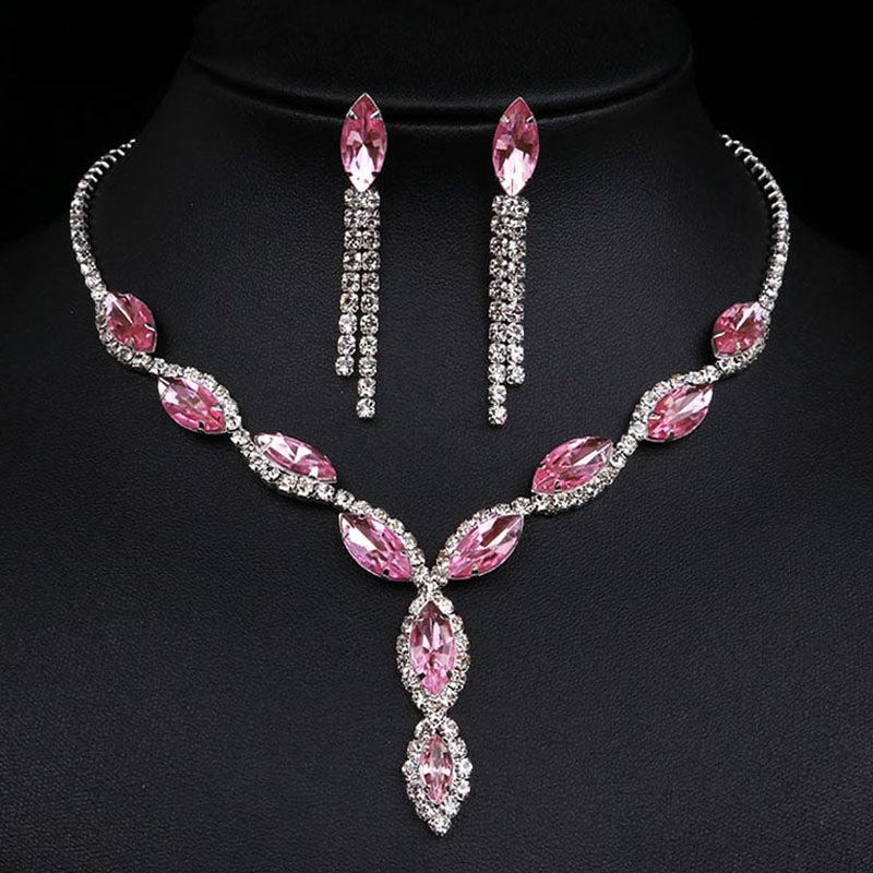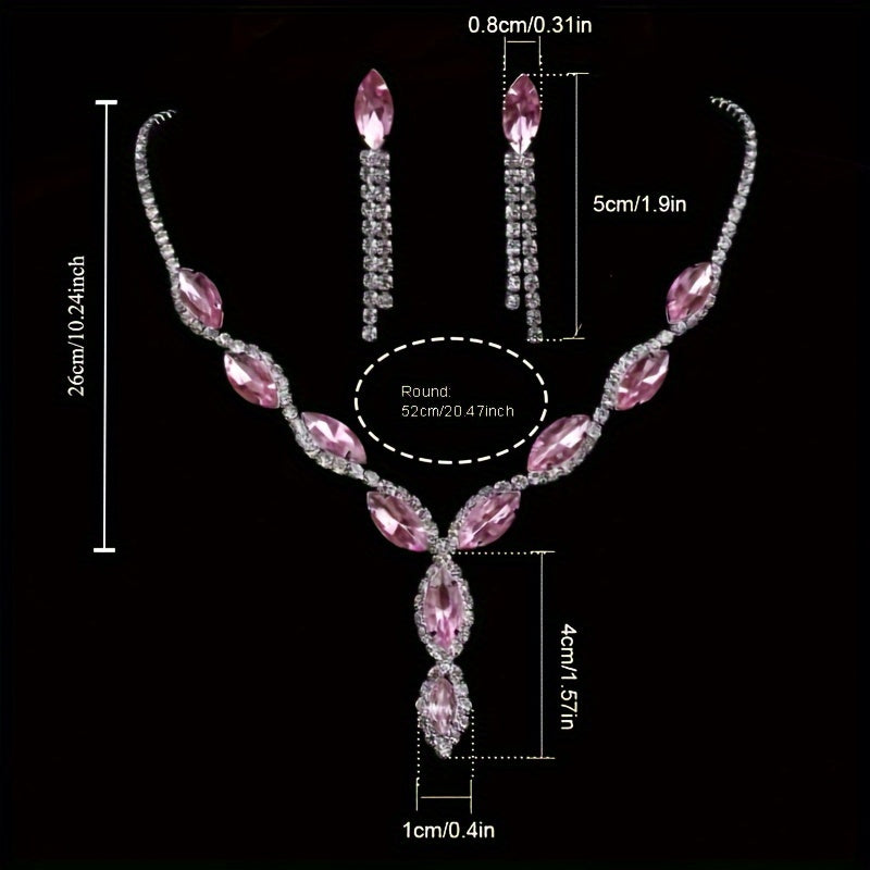 Complete your evening party look with this elegant jewelry set featuring inlaid rhinestones. Choose from pink or make your own color selection.