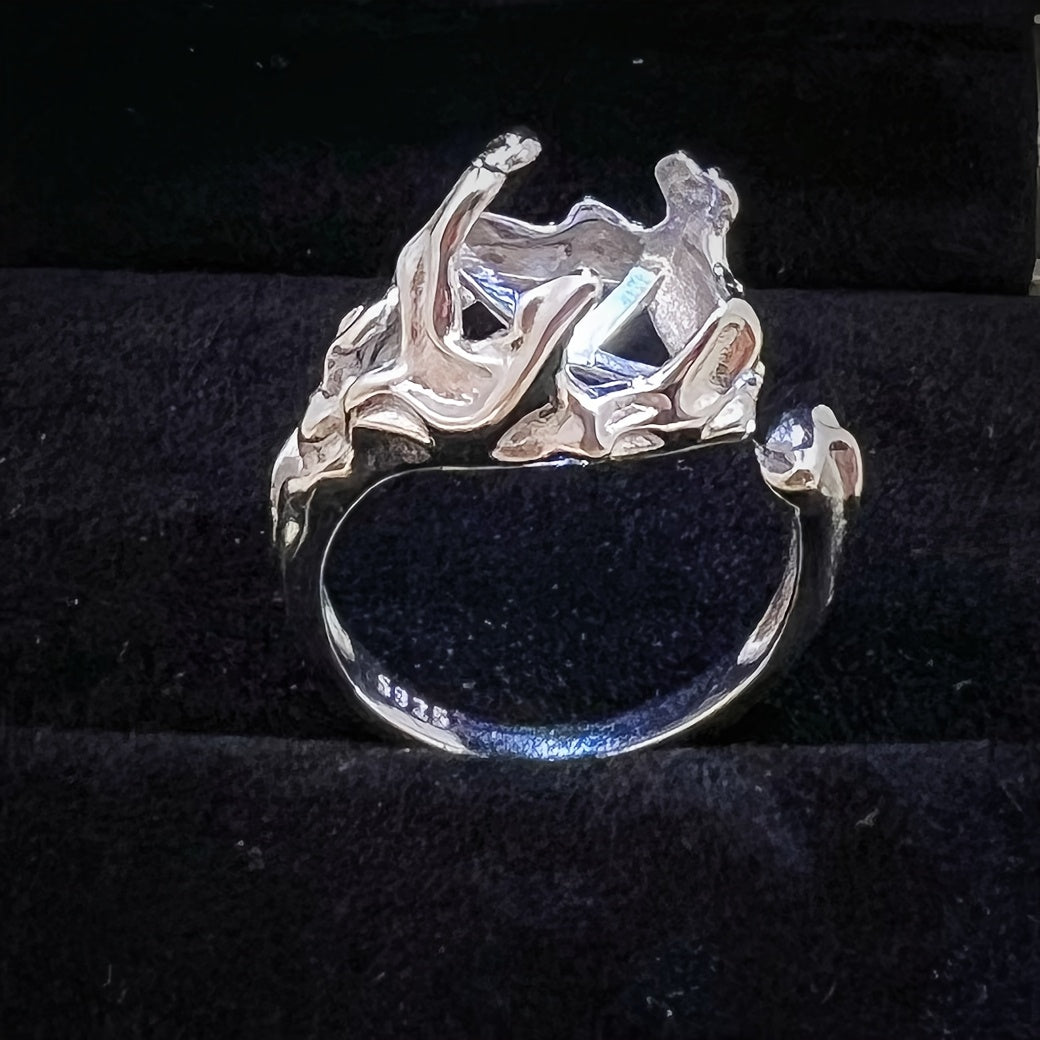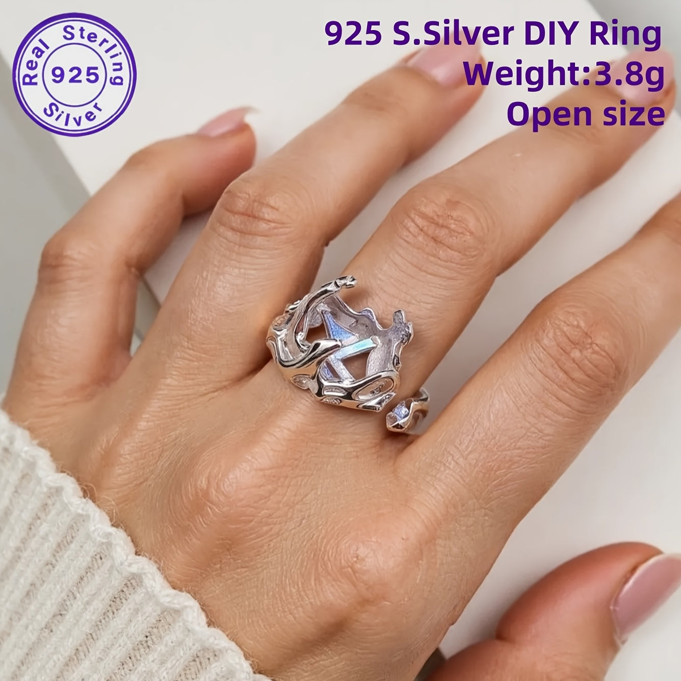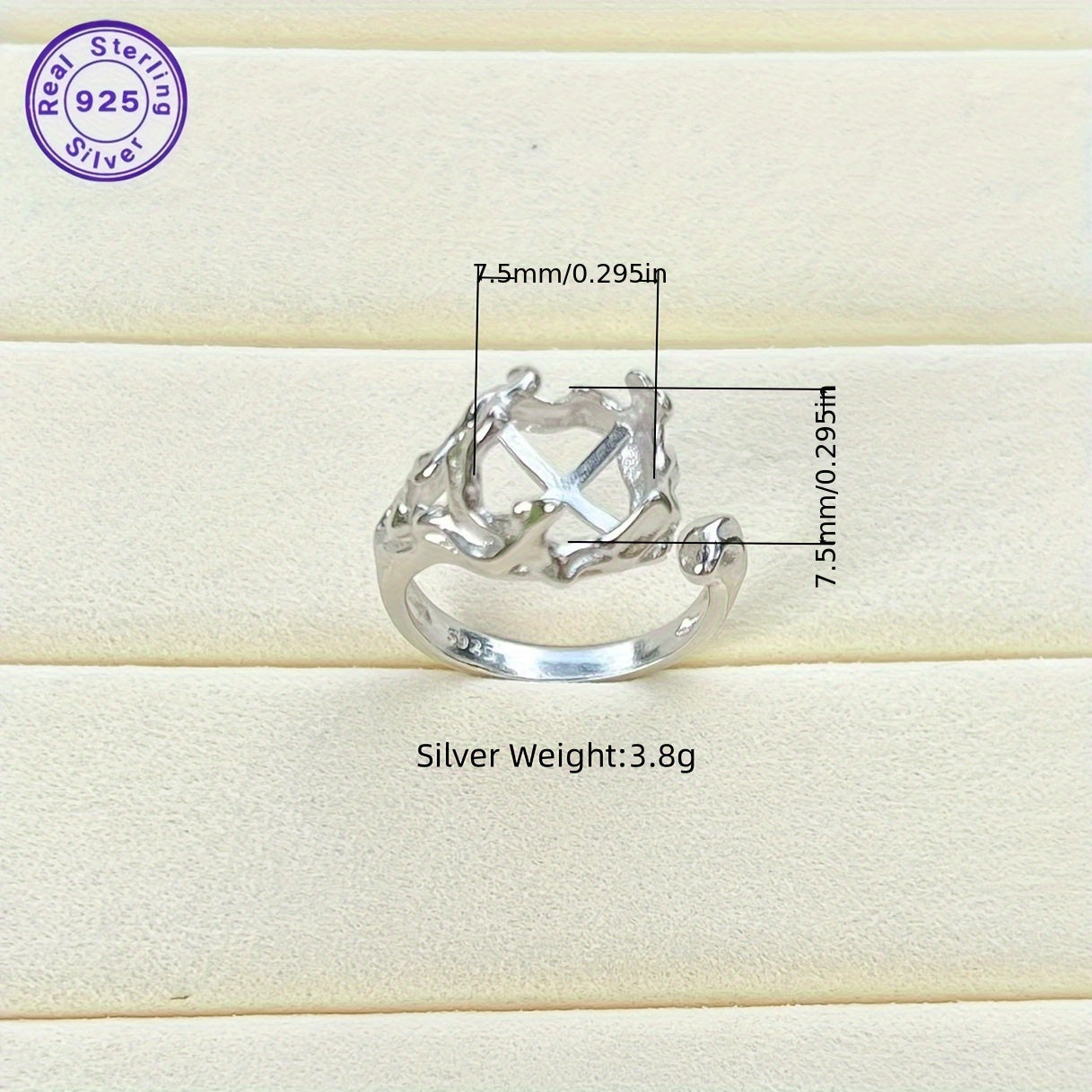 This S925 sterling silver prong ring is perfect for creating your own custom jewelry. The open size ring features an irregular shape and can accommodate a 7.5x7.5mm stone.